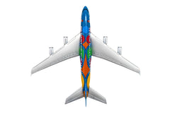 In 2020, Emirates celebrated their home city, Dubai with a bright livery design specially created for the Dubai Expo 2020. Decorated in orange, green, and blue, the colors represented the three themes of the event: Opportunity, Sustainability, and Mobility. This die-cast airplane authentically recreates the color scheme of this commemorative aircraft, and includes the phrases, 'Destination Dubai' on one side and 'Be Part of the Magic' on the other, just like the real-life airplane. With lower fuel consumption contributing to reduced carbon emissions, the Airbus A380 is among the most environmentally friendly airliners in the sky. The Emirates double-decker A380 is the flagship of its fleet, seating over 500 passengers. Die-cast airplane replica measures 5 1/2 inches long with a 6-inch wingspan. Can be played with as a toy or displayed as a collectible. For ages 3+.