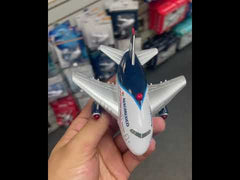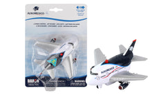 This stylized aircraft features electronic jet sound and flashing red lights, activated by the push of a button on top of the fuselage! Pull the plane back and let it go forward in the take-off position. Plastic construction. Approximately 5" long. Batteries included. Ages 3+