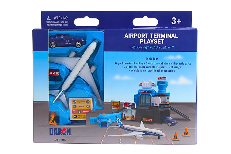 Now you can build your own airport complete with a die-cast metal Boeing 787 airplane replica! The playset features easy-to-assemble pieces including the terminal, a jet ramp, an ATC tower and satellite, and a ramp. There is also a die-cast metal airport car, an information sign directing passengers to departures, arrivals, and baggage claim; and additional accessories including airport signs and safety cones. The Boeing aircraft is authentically detailed, and the car is free-wheeling so it can be rolled along. Building the airport terminal helps contribute to childhood development benefits with tactile engagement and inspires STEM learning of engineering concepts. It is also perfect to display as a collectible. Recommended for Ages 3+.