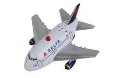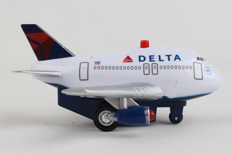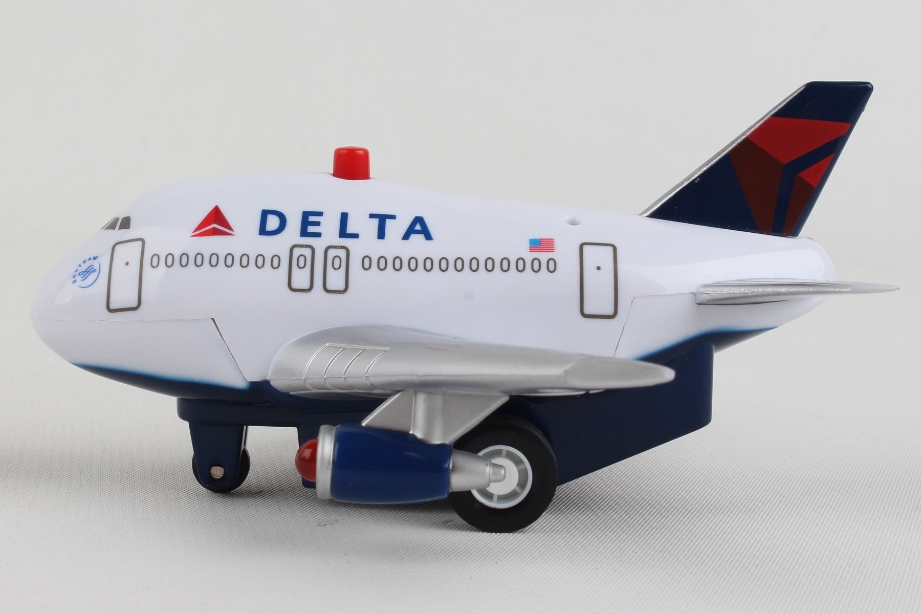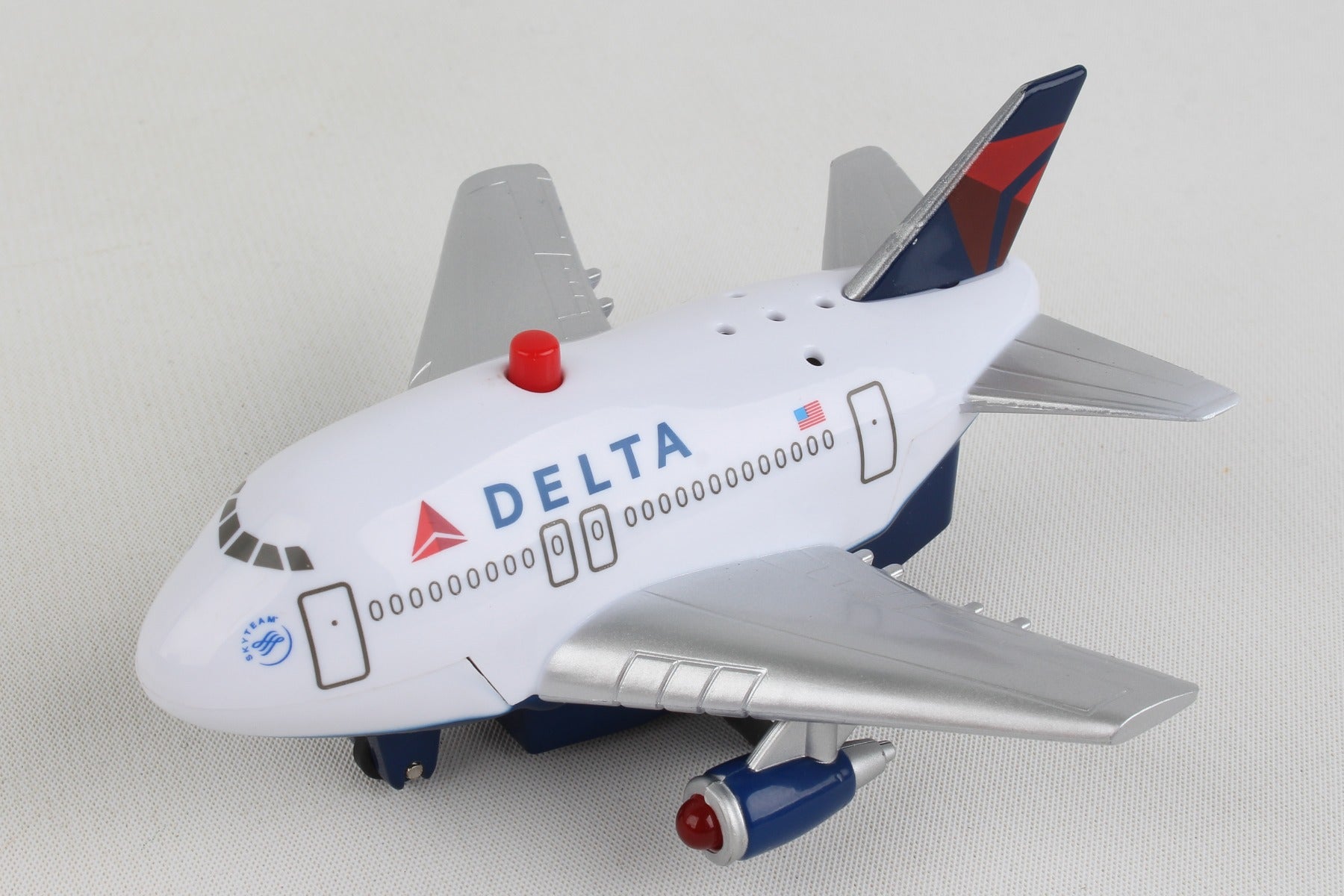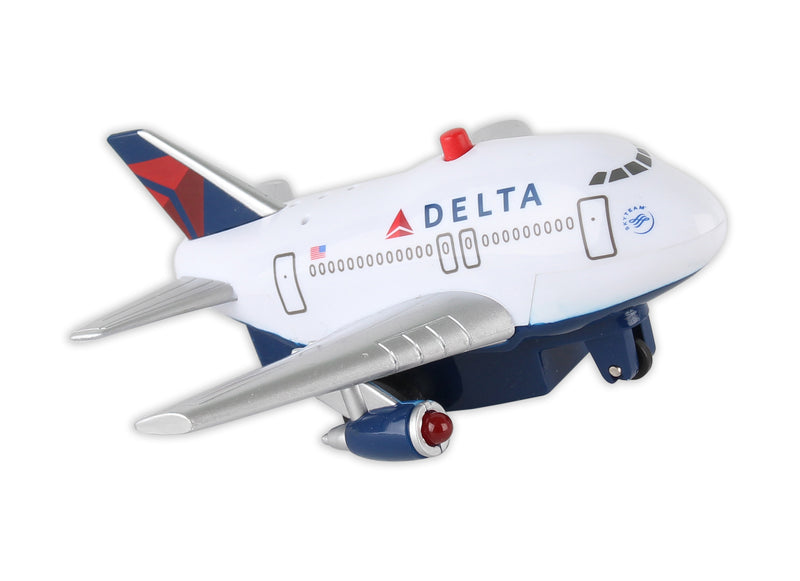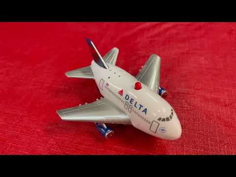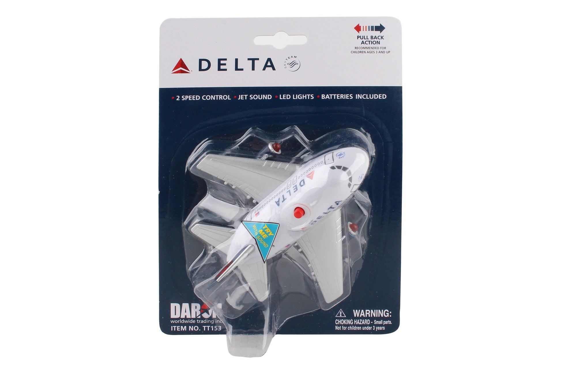 This stylized aircraft features electronic jet sound and flashing red lights, activated by the push of a button on top of the fuselage! Pull the plane back and let it go forward in the take-off position. Plastic construction. Approximately 5" long. Batteries included. Ages 3+