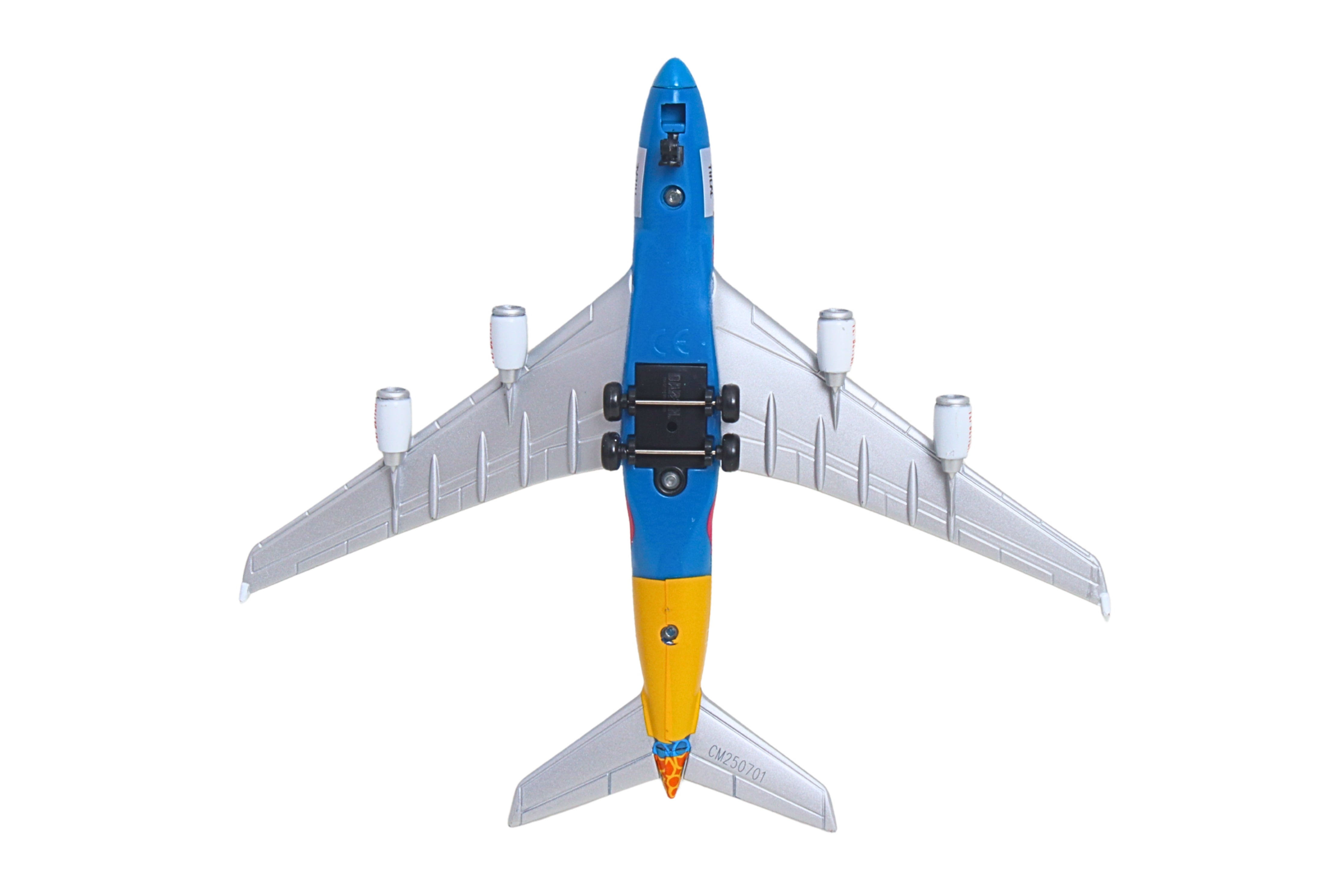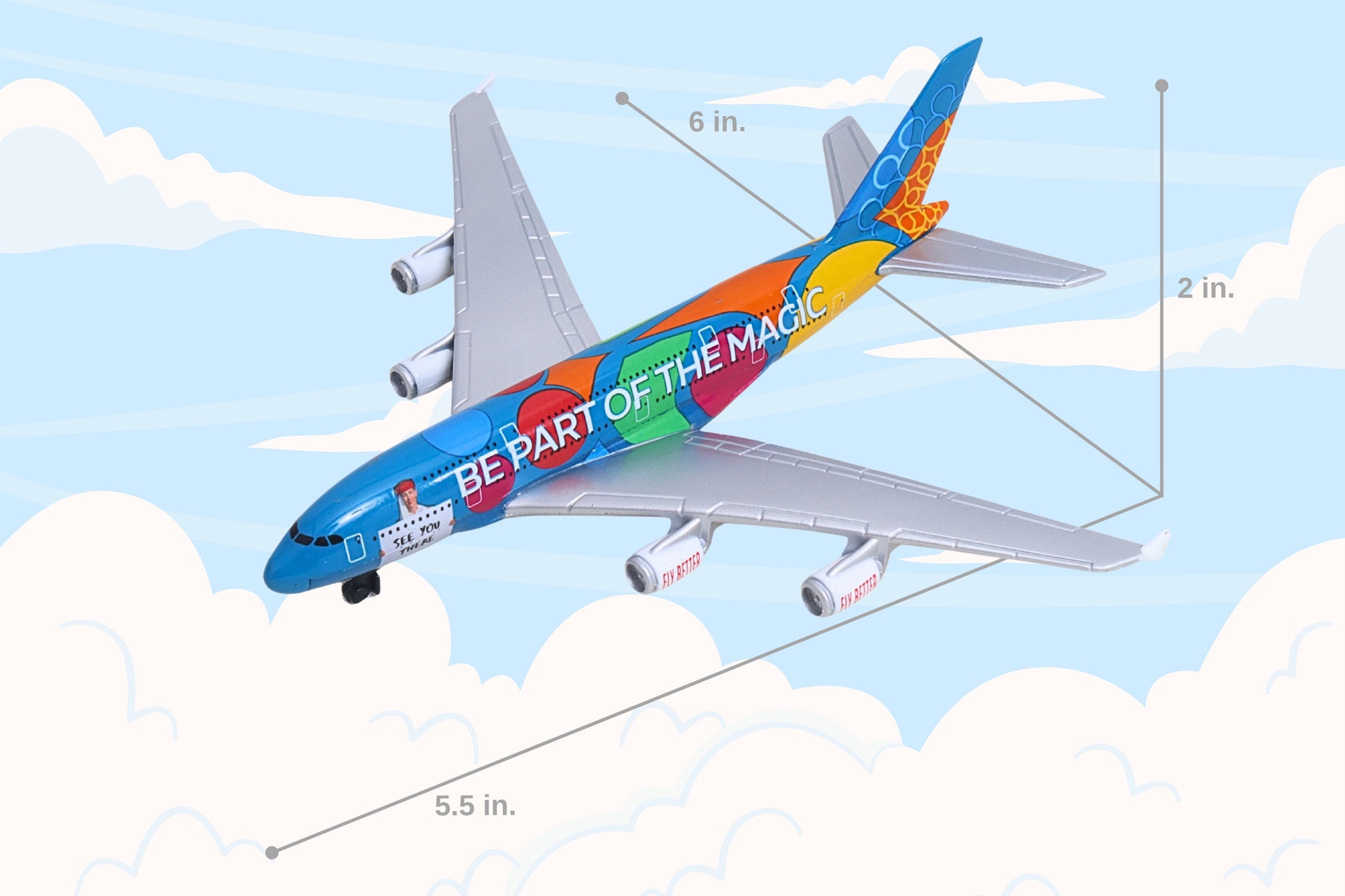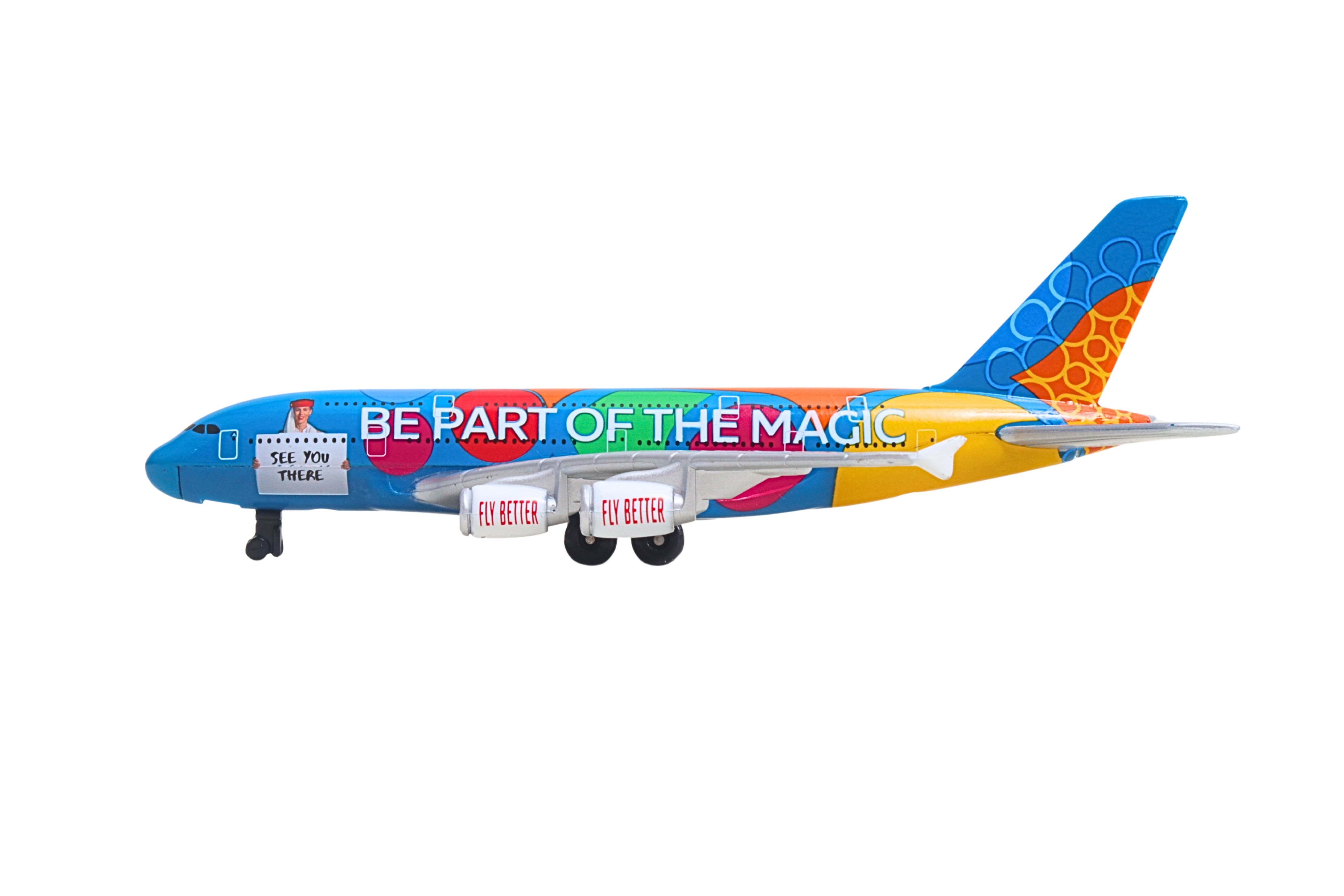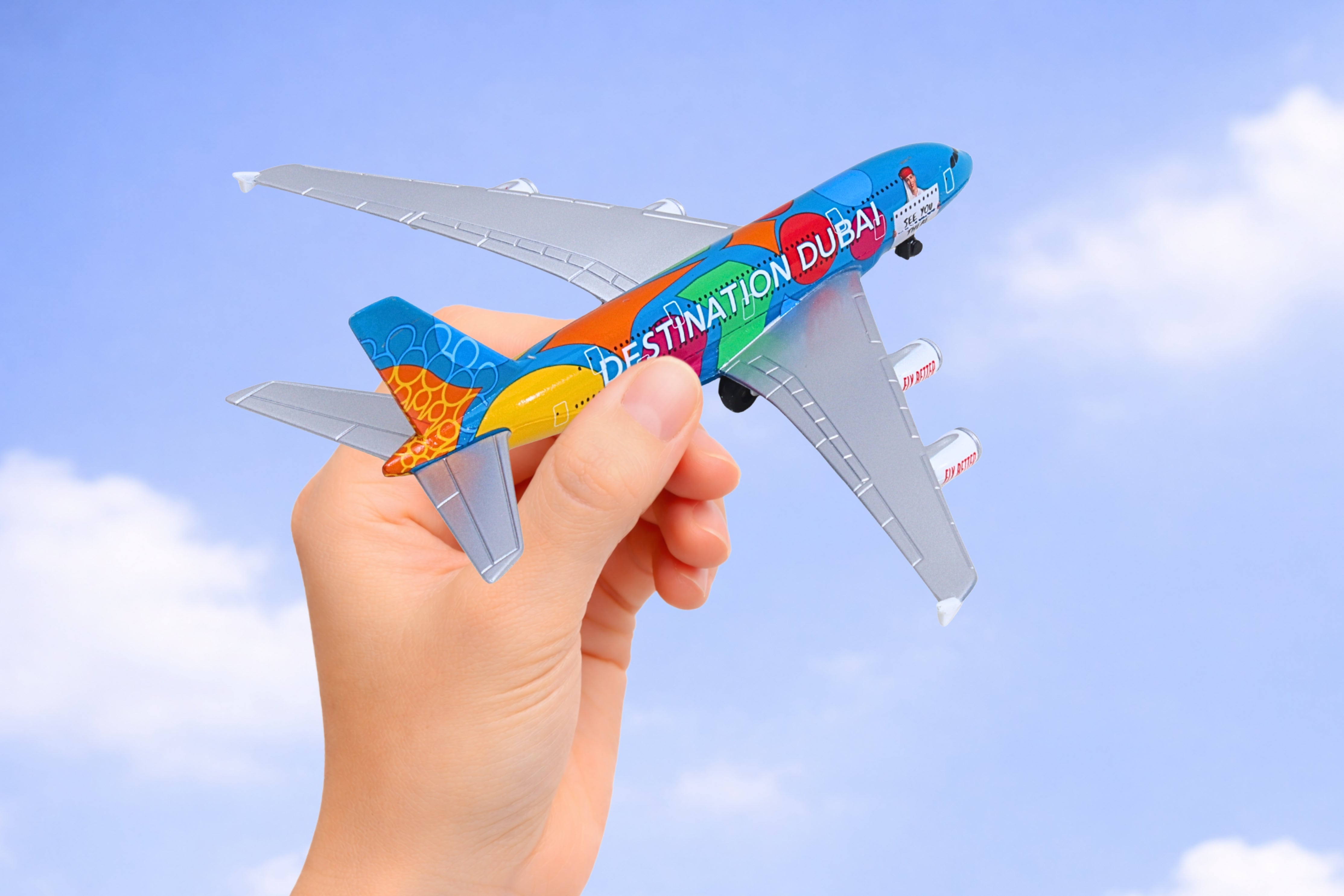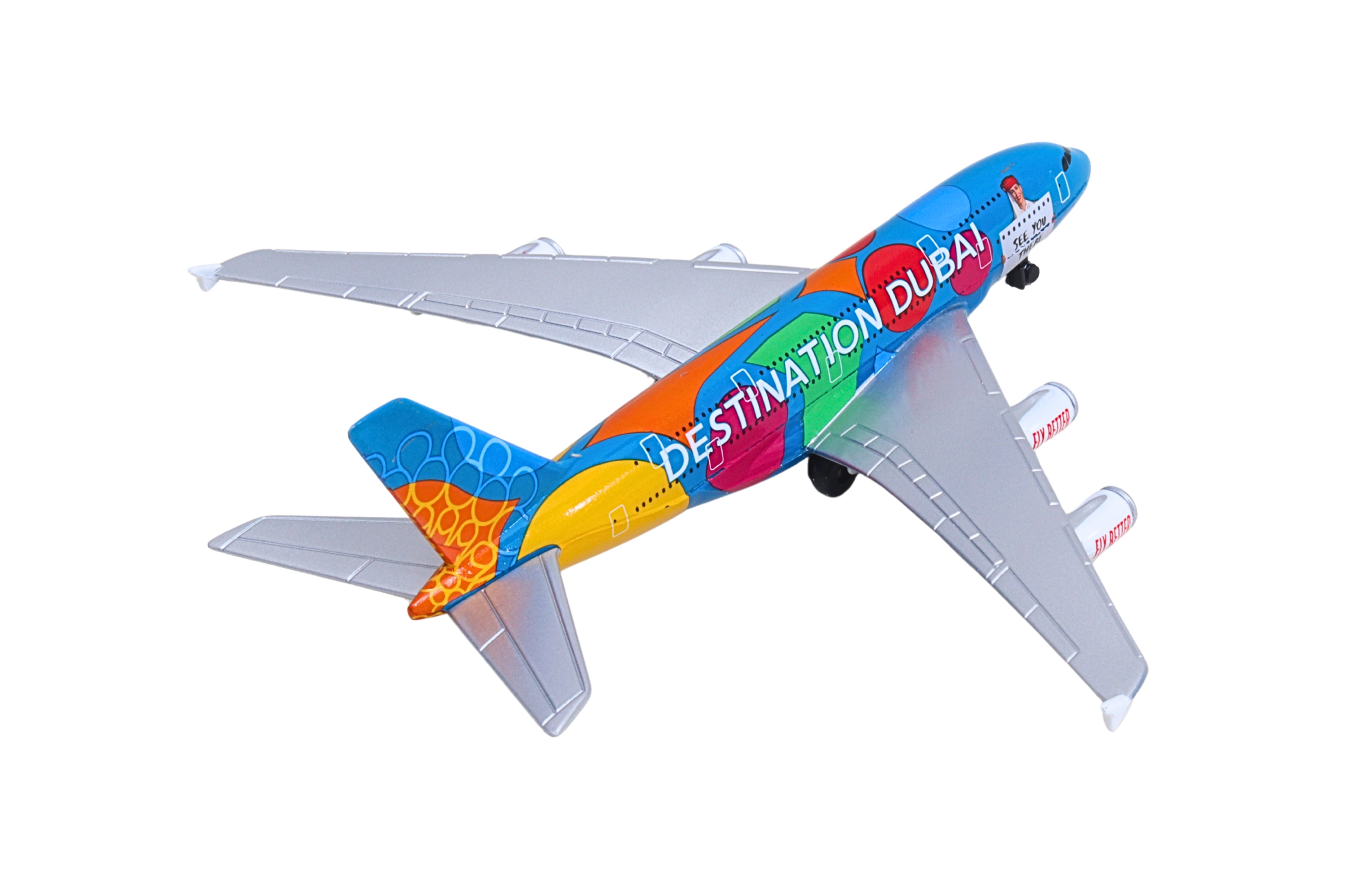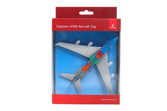In 2020, Emirates celebrated their home city, Dubai with a bright livery design specially created for the Dubai Expo 2020. Decorated in orange, green, and blue, the colors represented the three themes of the event: Opportunity, Sustainability, and Mobility. This die-cast airplane authentically recreates the color scheme of this commemorative aircraft, and includes the phrases, 'Destination Dubai' on one side and 'Be Part of the Magic' on the other, just like the real-life airplane. With lower fuel consumption contributing to reduced carbon emissions, the Airbus A380 is among the most environmentally friendly airliners in the sky. The Emirates double-decker A380 is the flagship of its fleet, seating over 500 passengers. Die-cast airplane replica measures 5 1/2 inches long with a 6-inch wingspan. Can be played with as a toy or displayed as a collectible. For ages 3+.