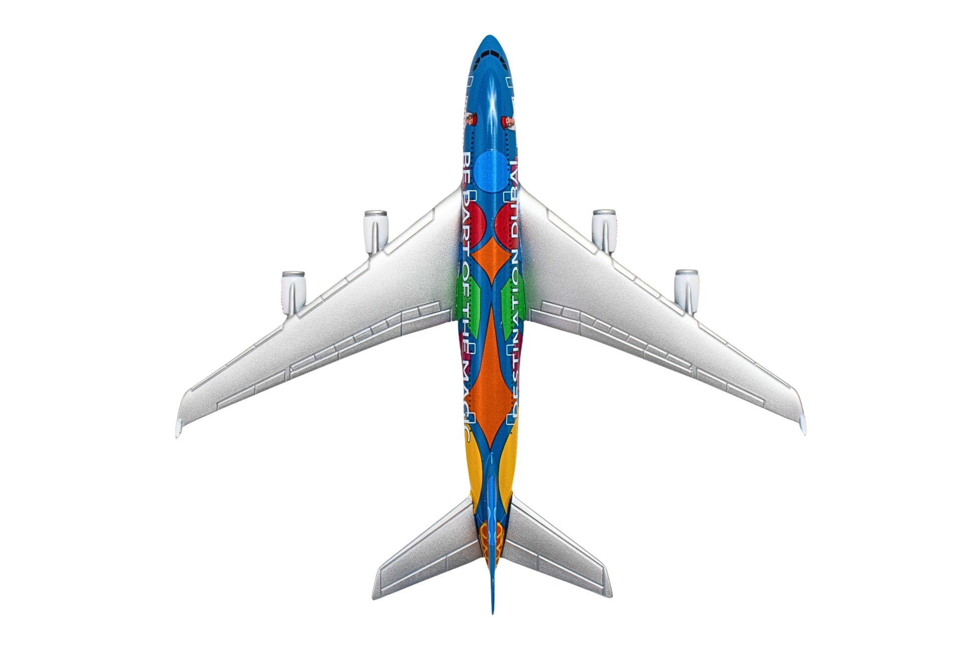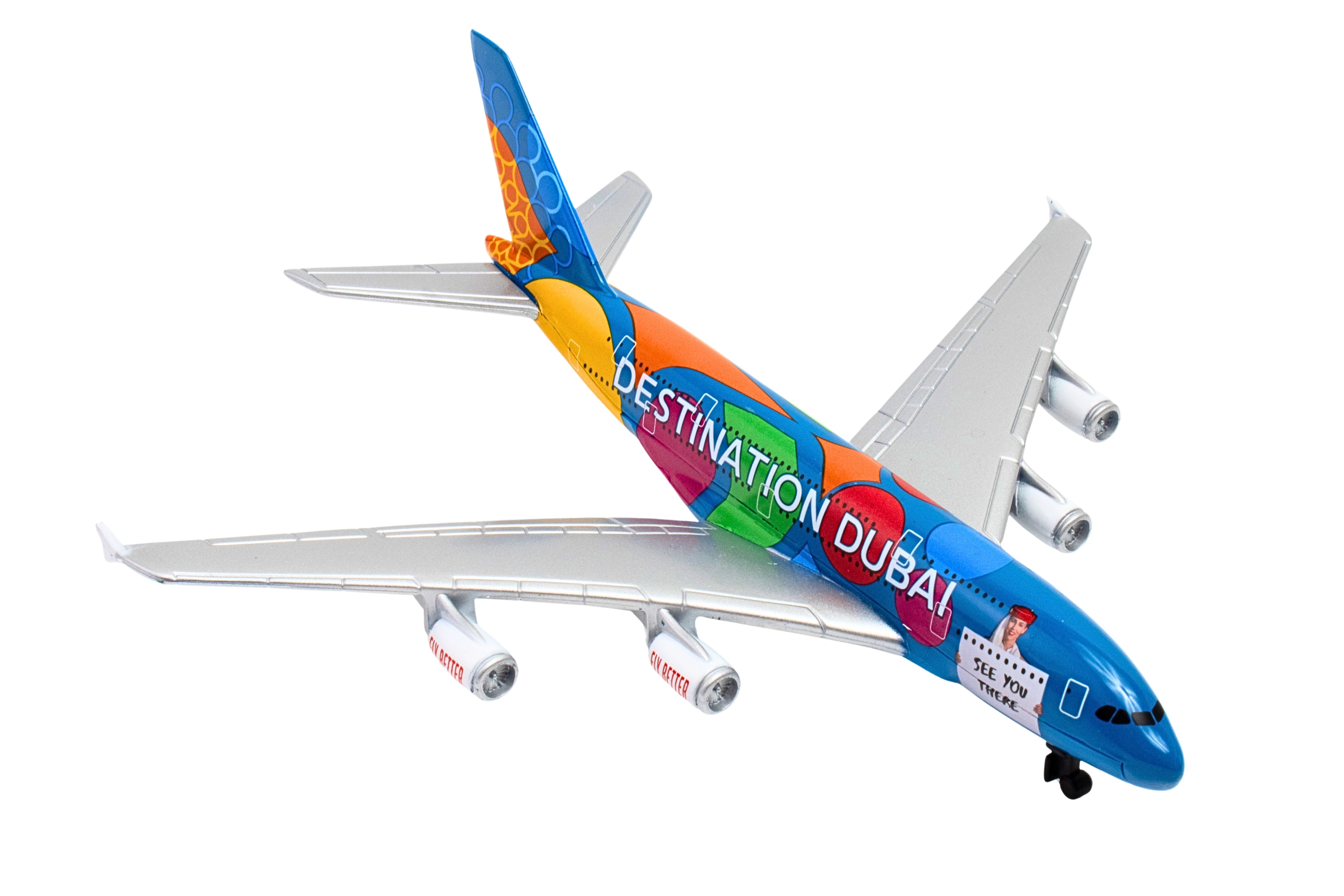 In 2020, Emirates celebrated their home city, Dubai with a bright livery design specially created for the Dubai Expo 2020. Decorated in orange, green, and blue, the colors represented the three themes of the event: Opportunity, Sustainability, and Mobility. This die-cast airplane authentically recreates the color scheme of this commemorative aircraft, and includes the phrases, 'Destination Dubai' on one side and 'Be Part of the Magic' on the other, just like the real-life airplane. With lower fuel consumption contributing to reduced carbon emissions, the Airbus A380 is among the most environmentally friendly airliners in the sky. The Emirates double-decker A380 is the flagship of its fleet, seating over 500 passengers. Die-cast airplane replica measures 5 1/2 inches long with a 6-inch wingspan. Can be played with as a toy or displayed as a collectible. For ages 3+.