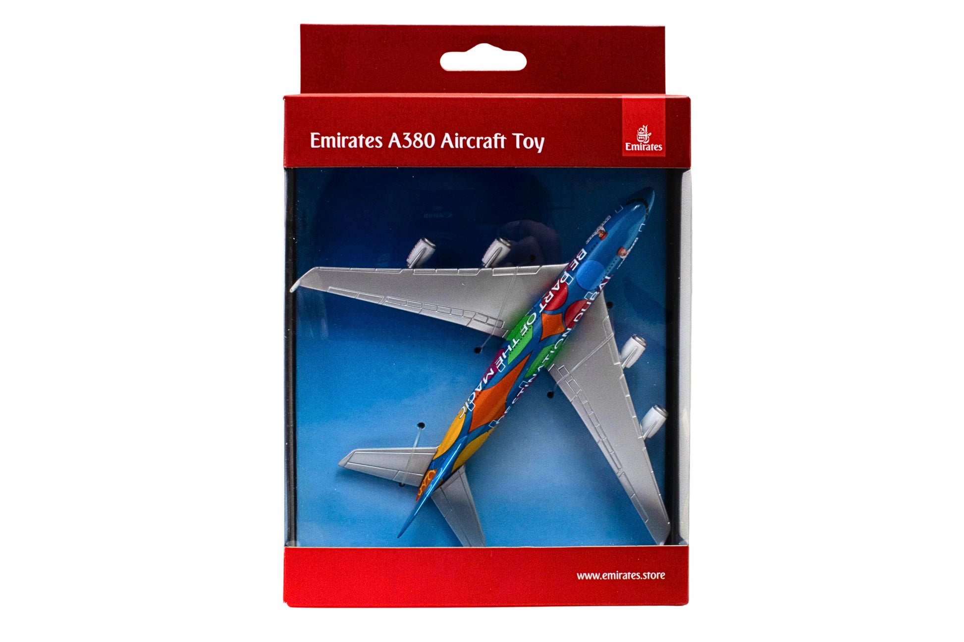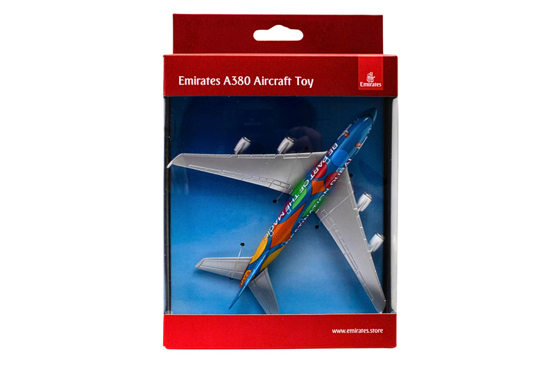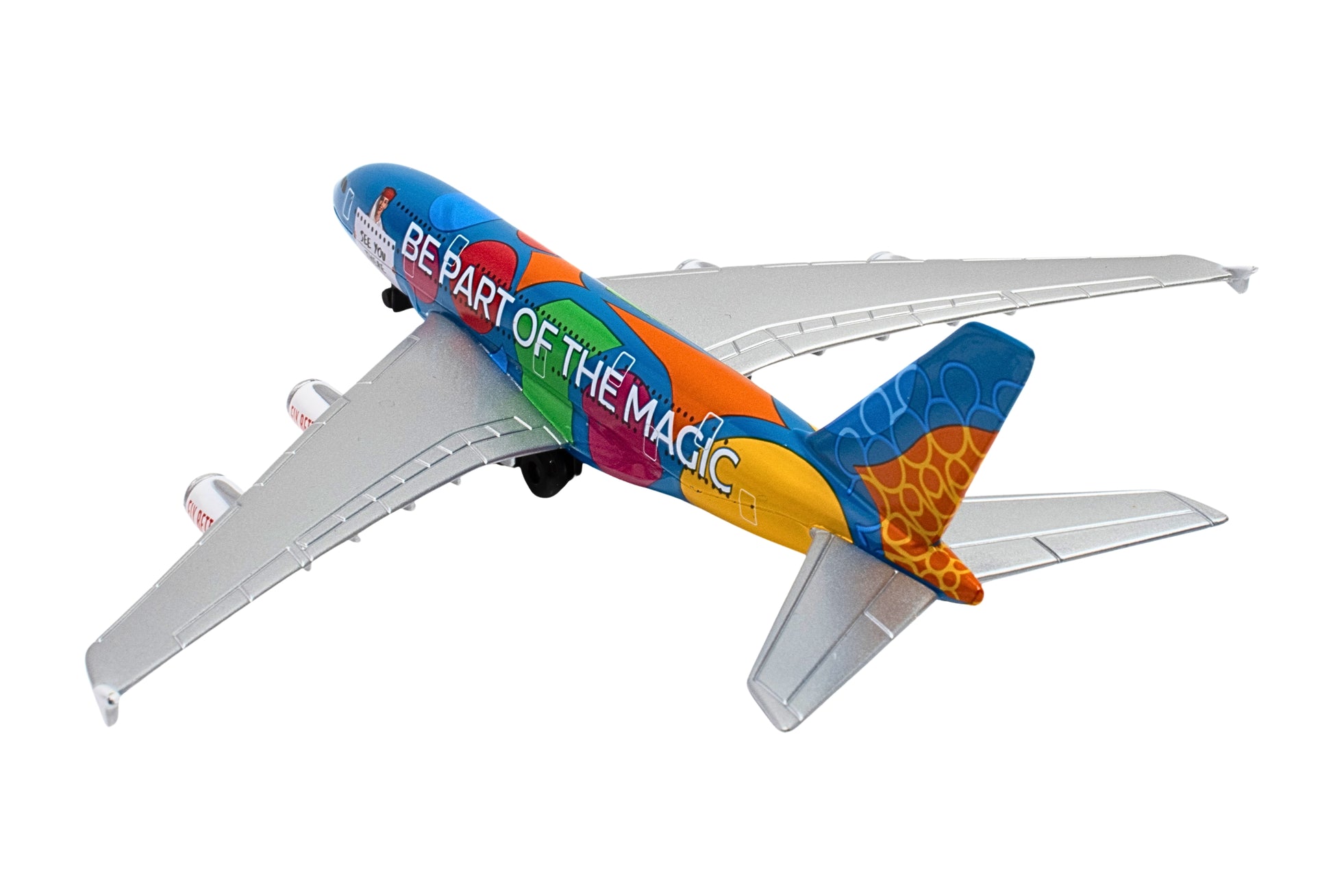 In 2020, Emirates celebrated their home city, Dubai with a bright livery design specially created for the Dubai Expo 2020. Decorated in orange, green, and blue, the colors represented the three themes of the event: Opportunity, Sustainability, and Mobility. This die-cast airplane authentically recreates the color scheme of this commemorative aircraft, and includes the phrases, 'Destination Dubai' on one side and 'Be Part of the Magic' on the other, just like the real-life airplane. With lower fuel consumption contributing to reduced carbon emissions, the Airbus A380 is among the most environmentally friendly airliners in the sky. The Emirates double-decker A380 is the flagship of its fleet, seating over 500 passengers. Die-cast airplane replica measures 5 1/2 inches long with a 6-inch wingspan. Can be played with as a toy or displayed as a collectible. For ages 3+.