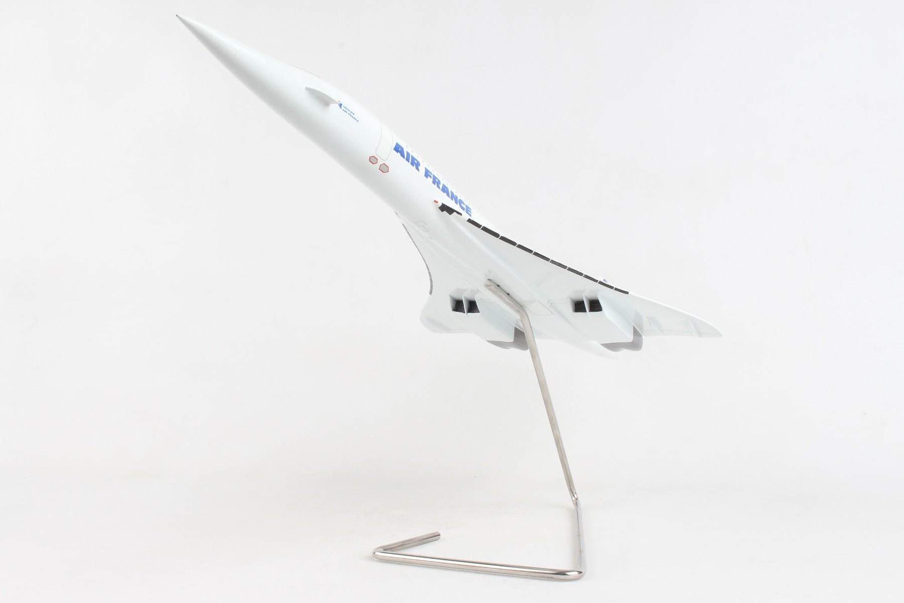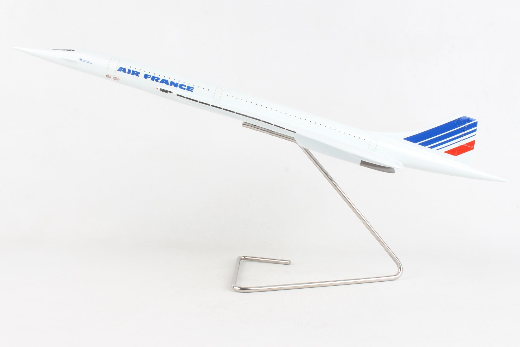 This high quality replica is crafted from resin and comes with a metal stand. Dimensions are 24.75"(L) X 12.5"(H) X 10.25"(Wingspan) The Aérospatiale-BAC Concorde is a turbojet-powered supersonic passenger airliner, a supersonic transport (SST). It was a product of an Anglo-French government treaty, combining the manufacturing efforts of Aérospatiale and the British Aircraft Corporation. First flown in 1969, Concorde entered service in 1976 and continued commercial flights for 27 years. Air France made its final commercial Concorde landing in the United States in New York City from Paris on 30 May 2003. During the following week, on 2 June and 3 June 2003, F-BTSD flew a final round-trip from Paris to New York and back for airline staff and long-time employees in the airline's Concorde operations. Air France's final Concorde flight took place on 27 June 2003 when F-BVFC retired to Toulouse.