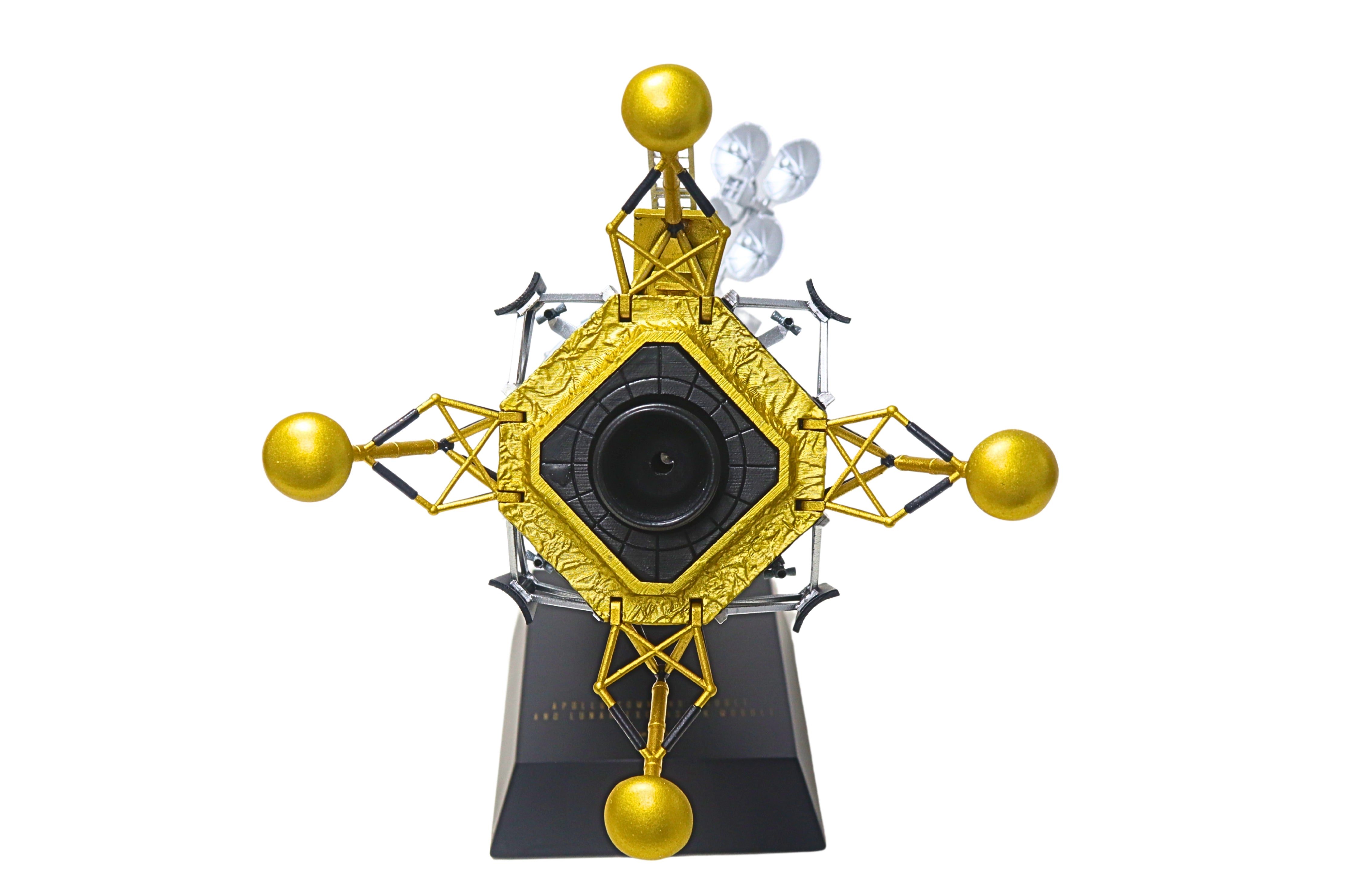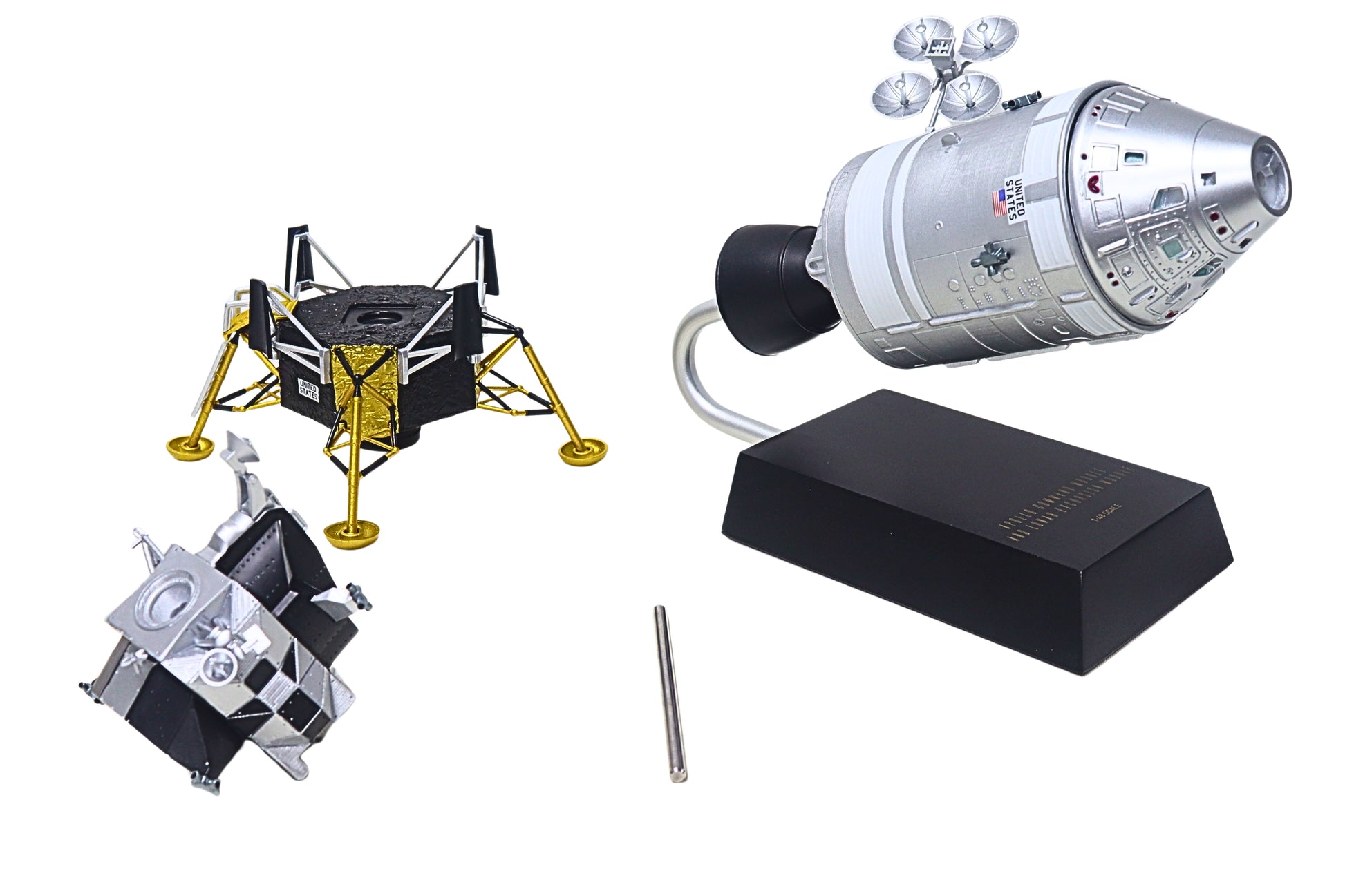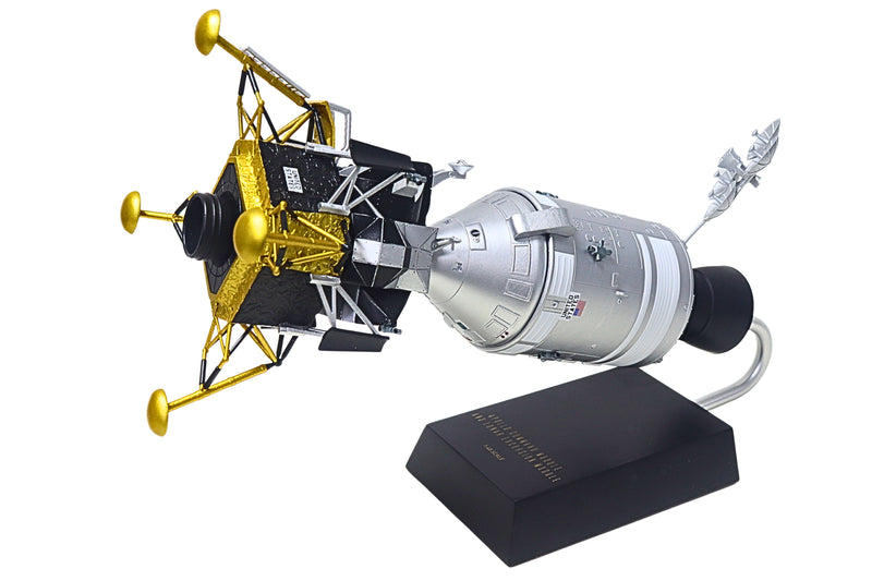 This cast-molded pressurized resin scale model of the Apollo 11 Command Module measures 14-inches long and 5-3/4-inches wide. It comes in 1/48 scale, is rendered in fine detail, and includes the Lunar Excursion Module and a base. All parts of the replica are rendered to the scale of its real-life counterpart, adding to its authenticity. Recommended for Ages 14+. Carrying a three-person crew of Neil Armstrong, Edwin "Buzz" Aldrin, and Michael Collins, the Apollo 11's Command Module capsule (named "Columbia") served as living quarters for the astronauts during its historic 1969 lunar landing mission. It was one of three parts of the complete Apollo spacecraft, along with the Service Module containing the propulsion system, and the Lunar Excursion Module (nicknamed, "Eagle") that descended upon the moon's service. In addition to being living quarters for the crew, the Command Module was tasked with bringing the astronauts safely back to earth. It splashed down in the Pacific Ocean on July 24, 1969 at 12:49 PM ET, 812 nautical miles southwest of Hawaii, and 12 nautical miles from the USS Hornet, the aircraft carrier that hauled the capsule back to land. In 1971, the capsule found a home at the Smithsonian's National Air and Space Museum after a national tour sponsored by NASA. It has been designated a "Milestone of Flight" by the Museum.