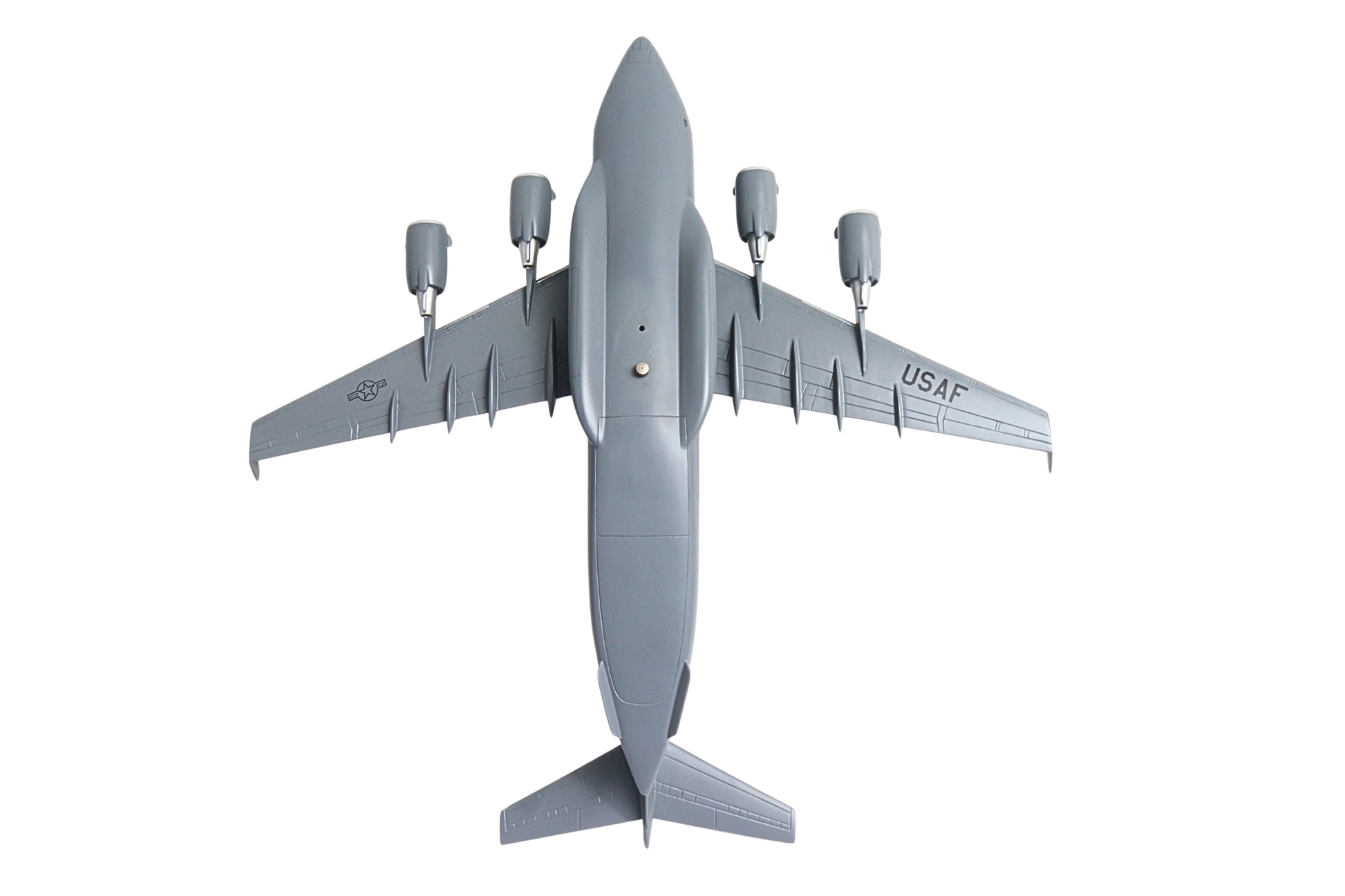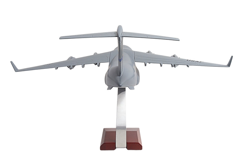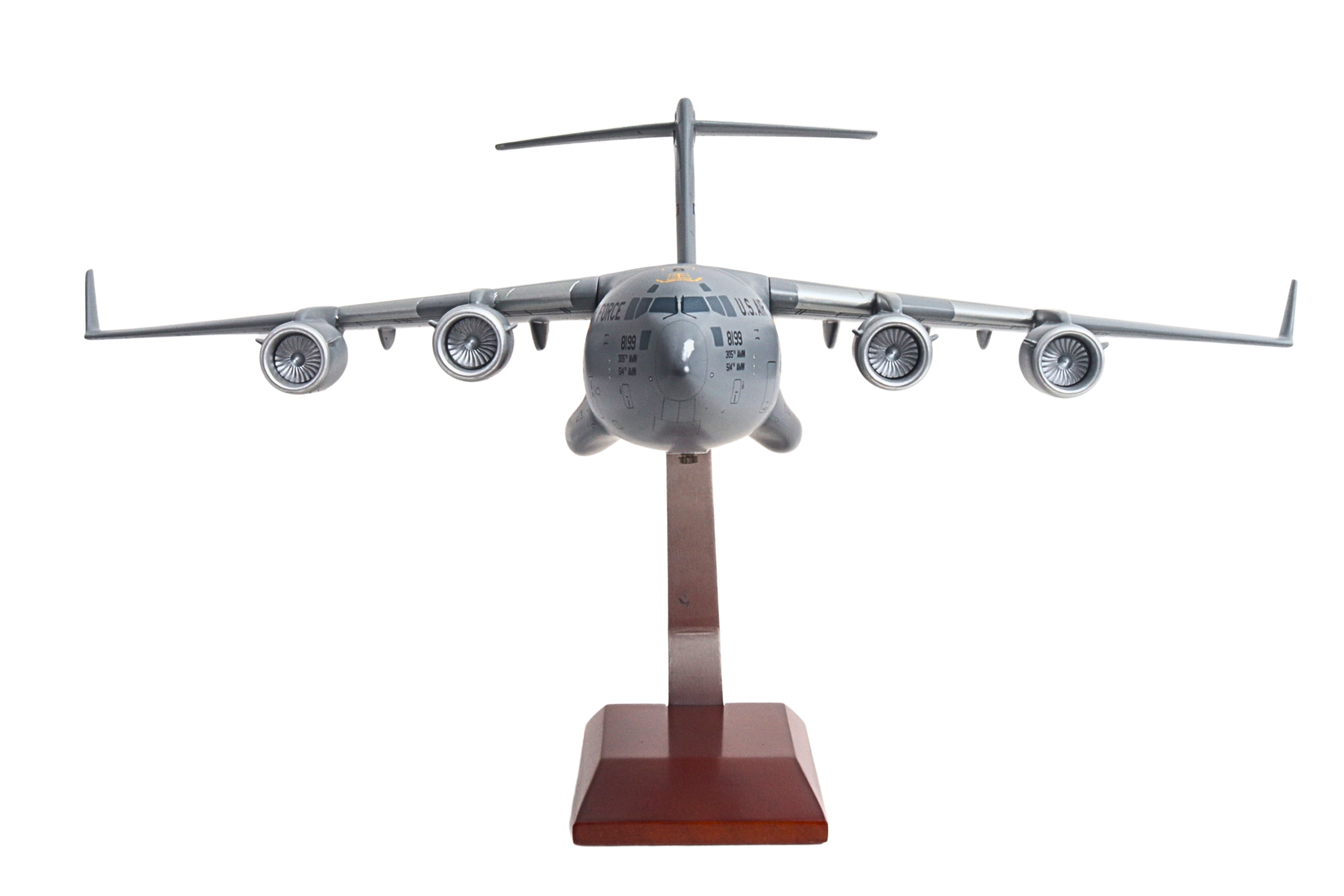 This cast-molded pressurized resin scale model of the C-17 Globemaster III AFB transport plane is 21" long with a 20" wingspan. It comes in 1/100 scale, is rendered in fine detail, and includes a wooden base. All parts of the replica are rendered to the scale of its real-life counterpart, adding to its authenticity. Recommended for Ages 14+ The third iteration of the Globemaster, the large C-17 airlifter operates as an American Air Force military transport plane, flying combat troops, supplies, vehicles, and equipment around the world. Used in both humanitarian aid and paratroop missions, it also carried the president's limousine and security detail. With a range of approximately 2,400 nautical miles and a cruise speed of approximately 450 knots, the C-17 can airdrop 102 paratroopers and equipment. The C-17 is designed to operate on small airfields, with the capability to take off and land on runways as narrow as 3,500 feet and 90 feet wide. It can turn around by backing up and making a three-point star turn. In September, 2004, the first of 13 C-17 Globemaster IIIs arrived in New Jersey at the McGuire Air Force Base. Nicknamed, "The Spirit of New Jersey," the C-17 Globemaster III is used on the base to quickly and efficiently deliver cargo and troops wherever needed.