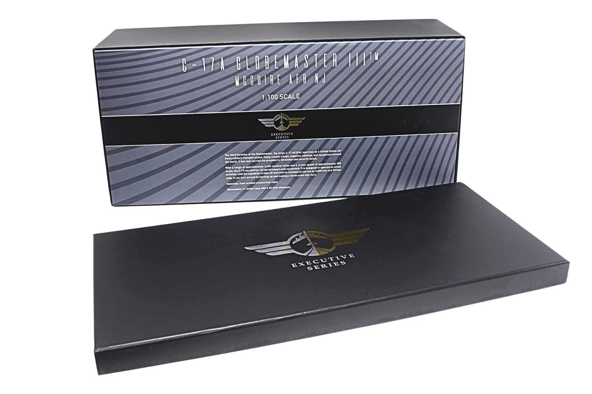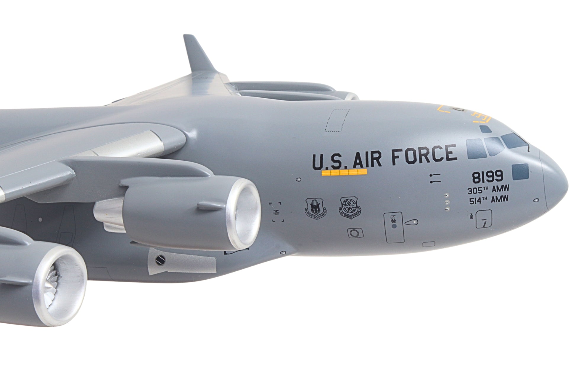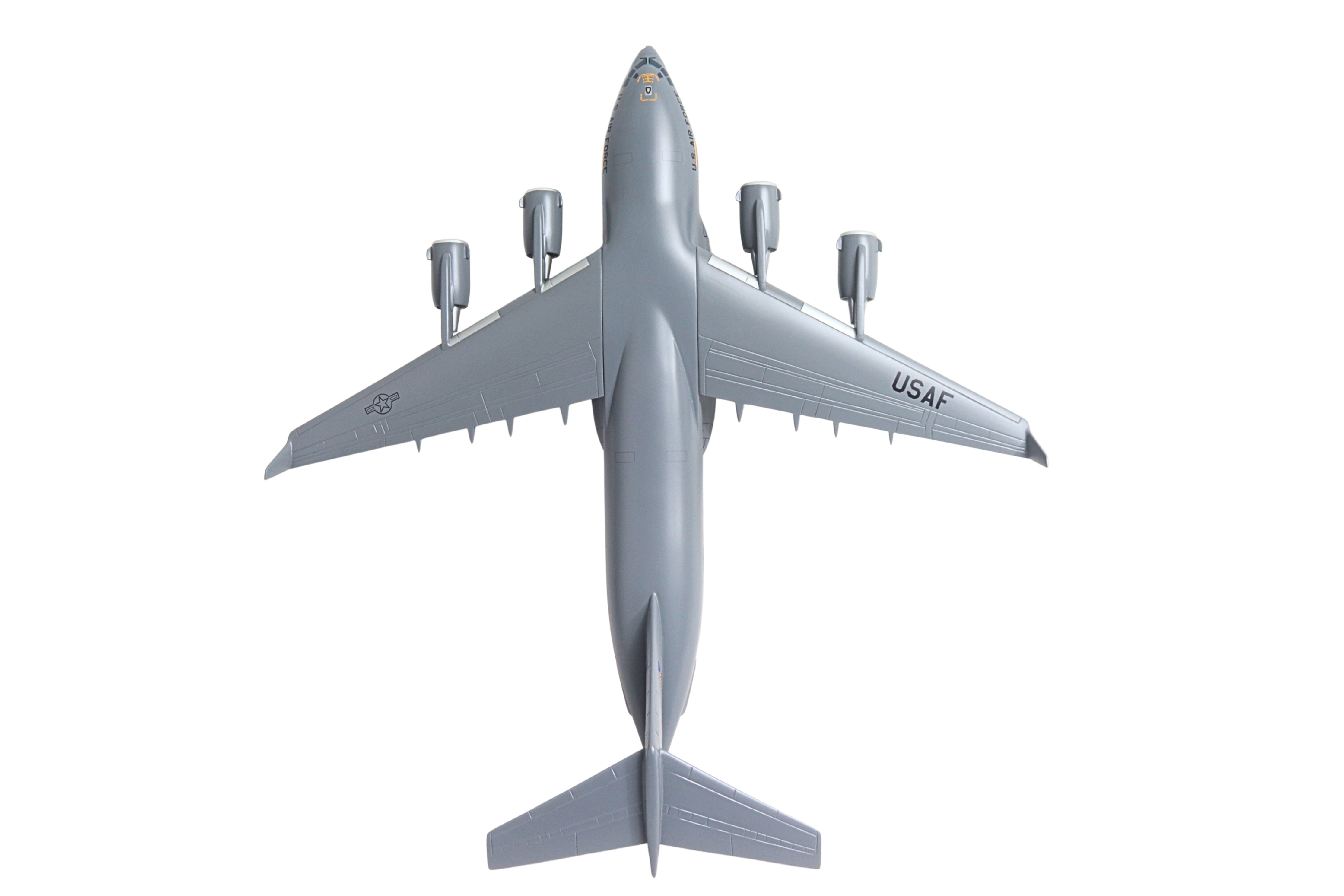 This cast-molded pressurized resin scale model of the C-17 Globemaster III AFB transport plane is 21" long with a 20" wingspan. It comes in 1/100 scale, is rendered in fine detail, and includes a wooden base. All parts of the replica are rendered to the scale of its real-life counterpart, adding to its authenticity. Recommended for Ages 14+ The third iteration of the Globemaster, the large C-17 airlifter operates as an American Air Force military transport plane, flying combat troops, supplies, vehicles, and equipment around the world. Used in both humanitarian aid and paratroop missions, it also carried the president's limousine and security detail. With a range of approximately 2,400 nautical miles and a cruise speed of approximately 450 knots, the C-17 can airdrop 102 paratroopers and equipment. The C-17 is designed to operate on small airfields, with the capability to take off and land on runways as narrow as 3,500 feet and 90 feet wide. It can turn around by backing up and making a three-point star turn. In September, 2004, the first of 13 C-17 Globemaster IIIs arrived in New Jersey at the McGuire Air Force Base. Nicknamed, "The Spirit of New Jersey," the C-17 Globemaster III is used on the base to quickly and efficiently deliver cargo and troops wherever needed.