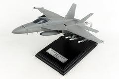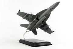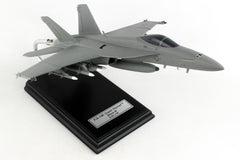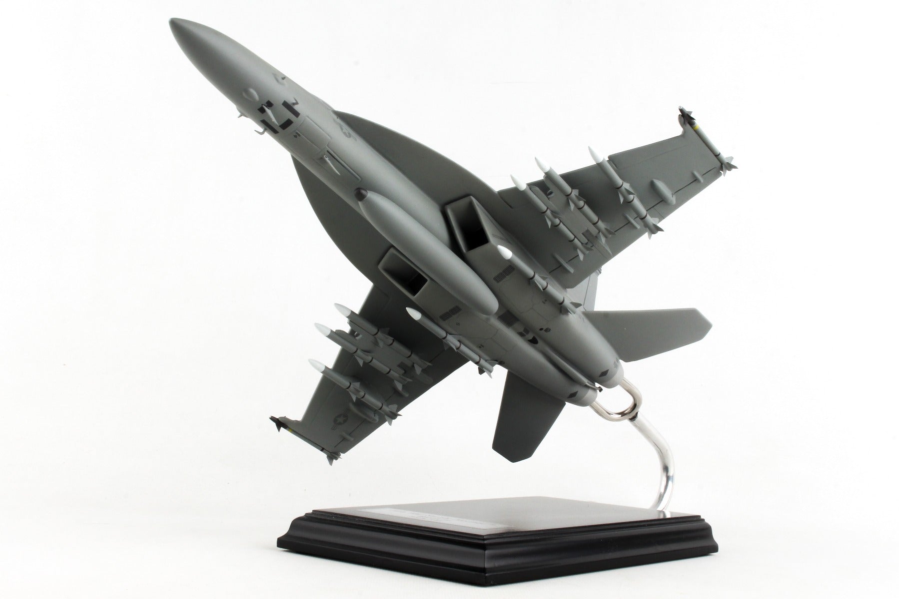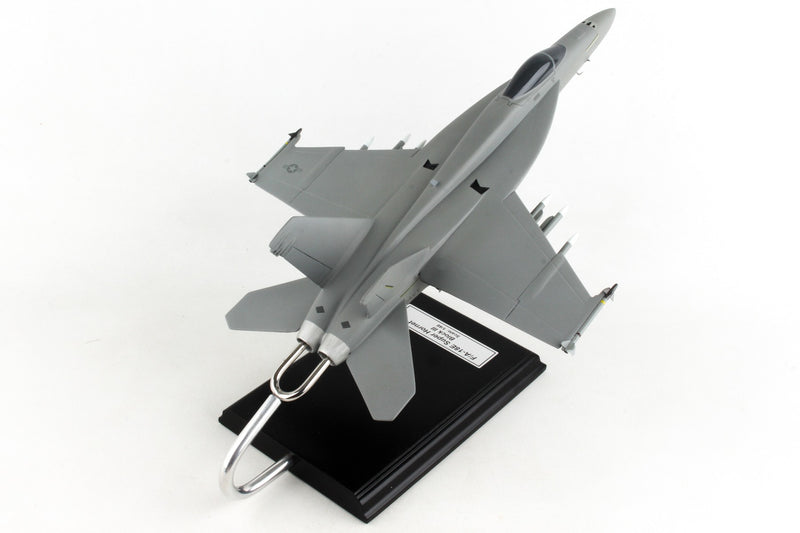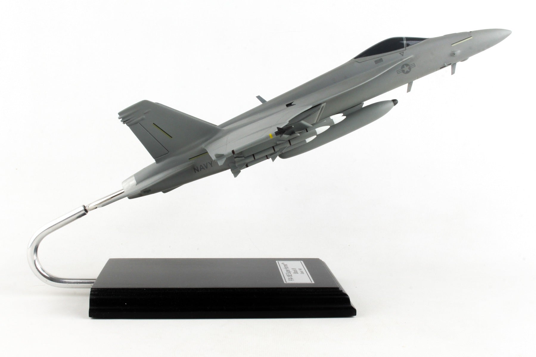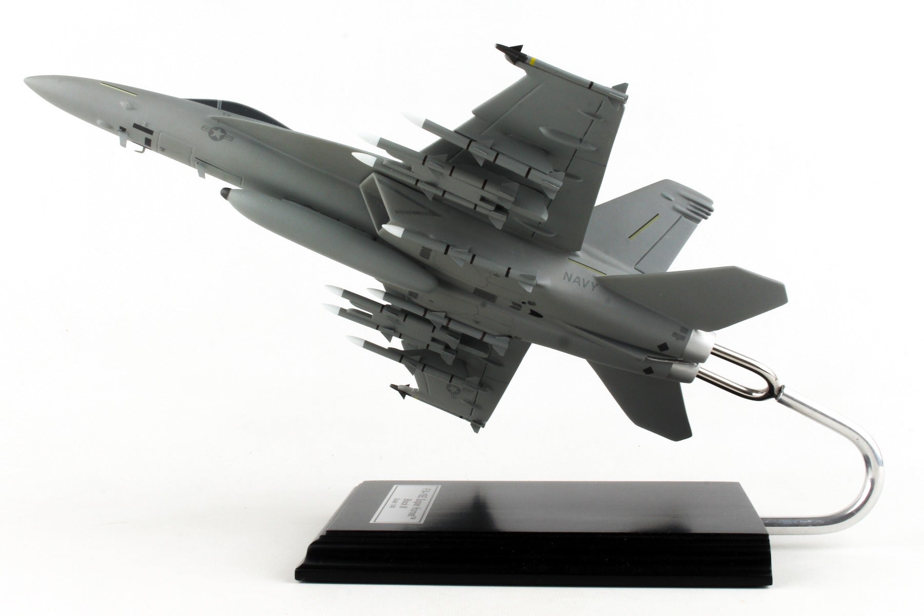 The F/A-18E Super Hornet is a single-seat twin-engine carrier-capable multirole fighter aircraft being used by the United States Navy. The Super Hornet is the workhorse of the Navy's carrier wing, designed for light and medium attack, airborne fights, reconnaissance, and electronic warfare. Additional fuel can be carried in up to five external fuel tanks and the aircraft can also be configured as an airborne tanker by adding an external air refueling system. This high quality replica is crafted from resin and comes with a wooden base. Length is 15" and wingspan is 11-1/2"