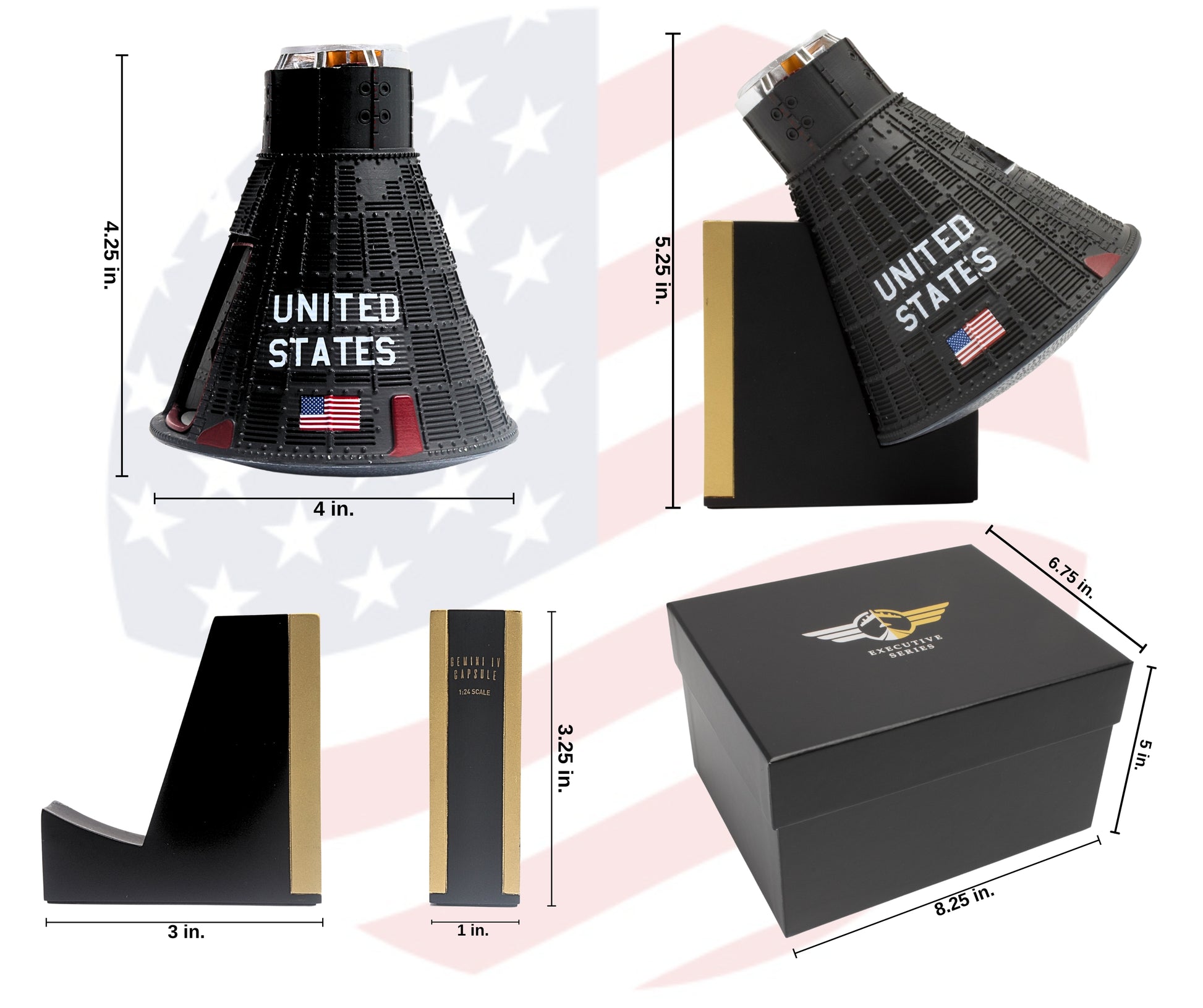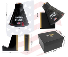 This cast-molded pressurized resin scale model of the Gemini IV Capsule comes in 1:24 scale and is rendered in fine detail. It includes a wooden display base and features a removable hatch to view the capsule's interior. This collectible capsule model measures 4" wide by 5" high. All parts of replica are rendered to the scale of its real-life counterpart, adding to its authenticity. Recommended for Ages 12+ The actual Gemini IV measured 7 feet, 6 inches long by 8 feet, 3 inches high, and weighed 3020 pounds. The RCS (reentry control system) regulated the capsule's ability to withstand the effects of heat and physics. The 23.5-foot tether umbilical cord enabled the spacewalk to happen. The capsule contained a communications system and a digital guidance computer with a core memory, the first of its kind to be used in space. In 1965 it took flight, it's primary mission to prove the ability of mankind to remain in space for extended periods of time. Its secondary objective was for the US to perform its own spacewalk. Eleven experiments were conducted during Gemini IV's mission, ranging from measuring radiation in space to the medical effects upon the astronauts. The mission's legendary highlight was the first spacewalk by an American, wherein astronaut Ed White floated free for 23 minutes outside the spacecraft while tethered to it.