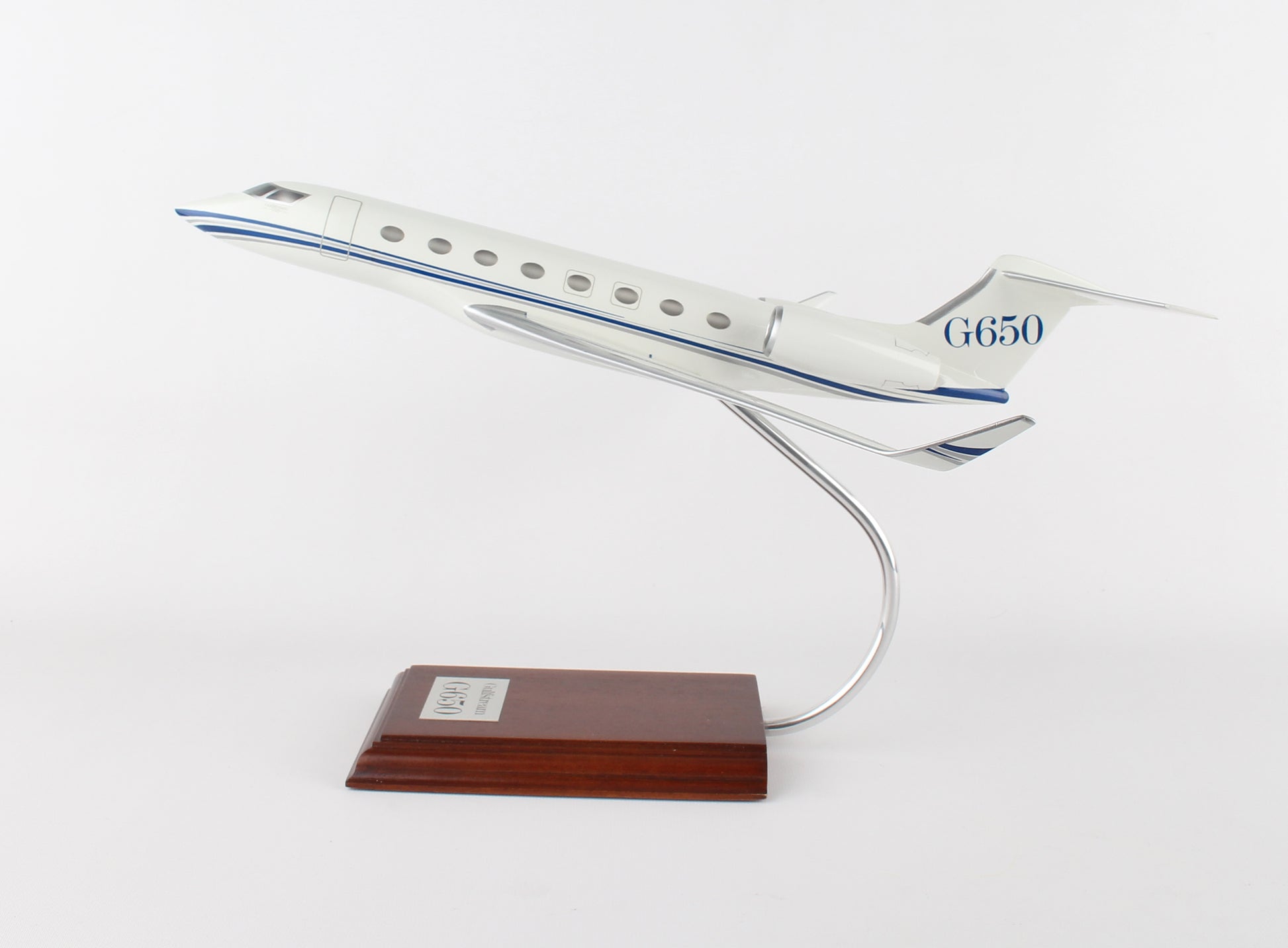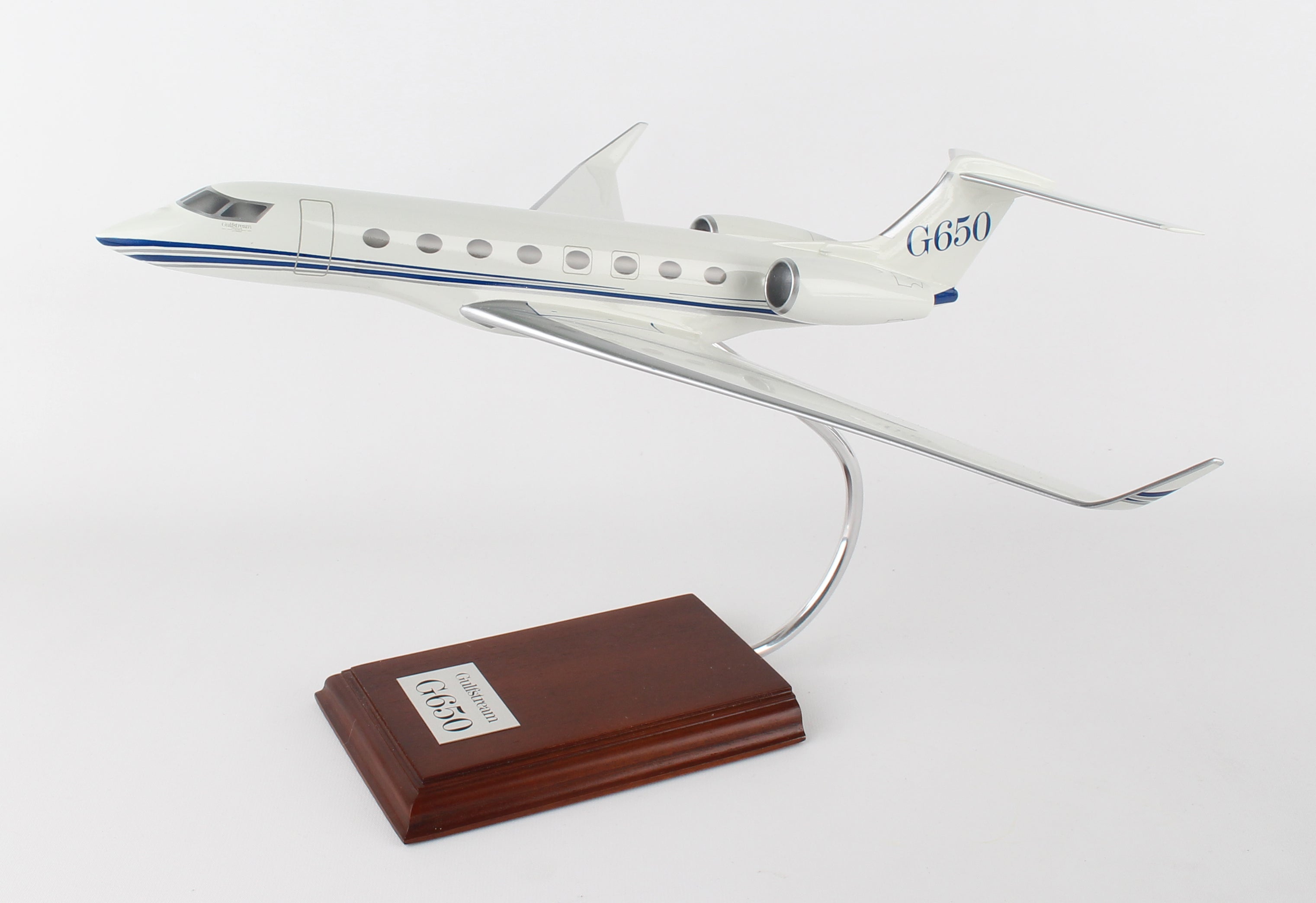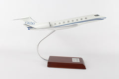 The G650 is Gulfstream's largest business jet and holds the record for the farthest fastest flight in business aviation. This model is handcrafted from resin and measures 16 ½" long x 16 ½" wingspan and comes with a wooden base.