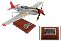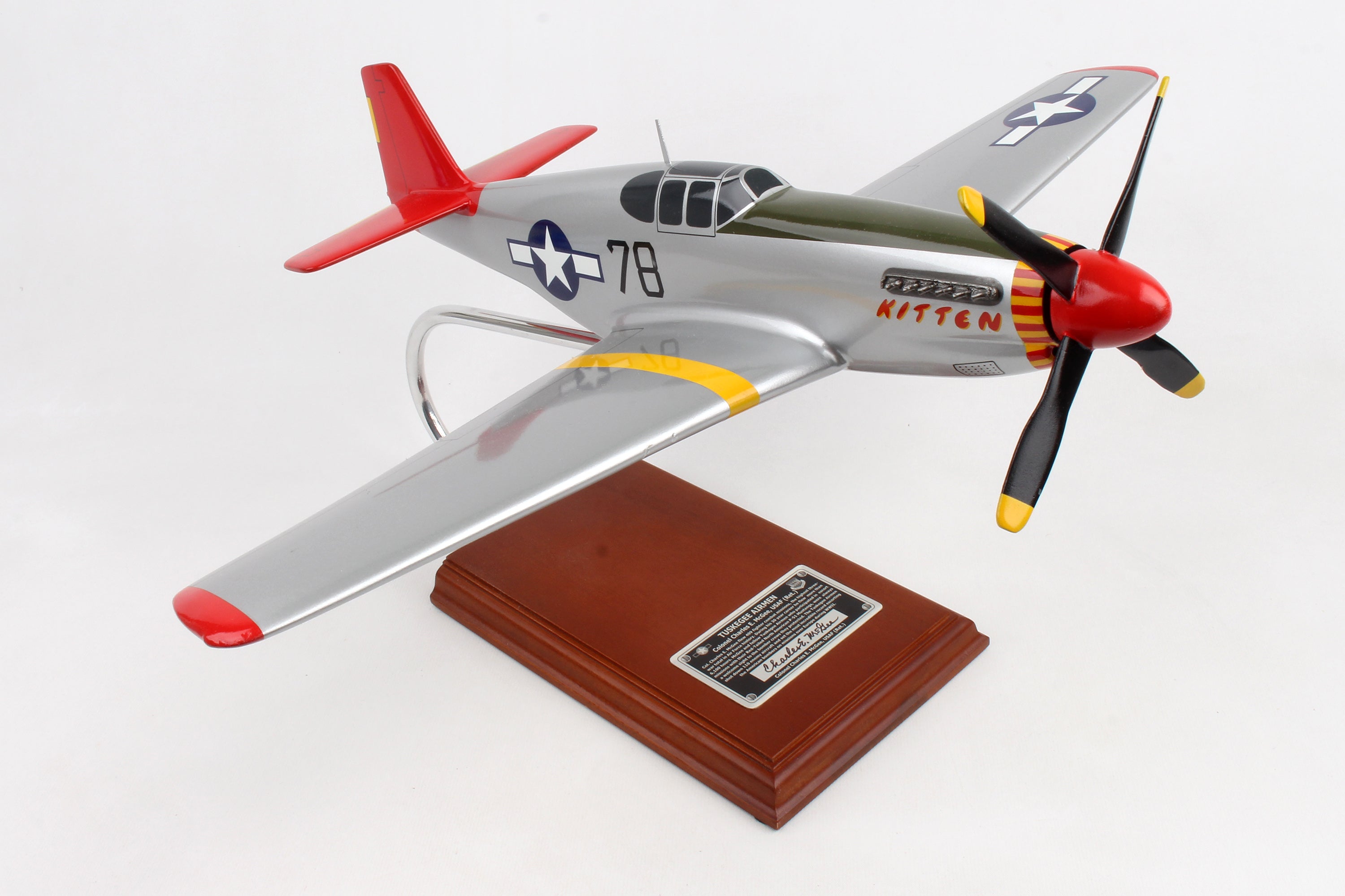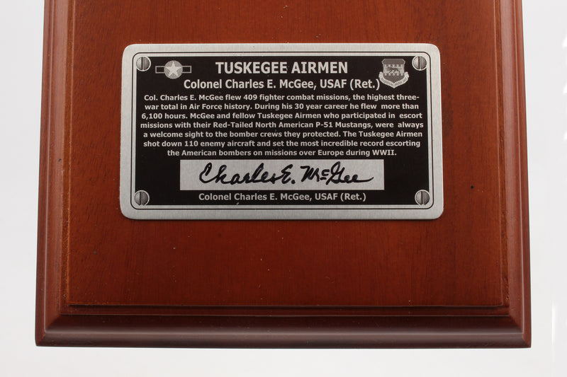 This high quality replica is handcrafted from mahogany and comes with a wooden base and a plaque signed by Charles McGee WWII Pilot. Dimensions are 16"(L) X 13.50(H) X 18.50" (Wingspan). The P51C Mustang was affectionately nicknamed "Kitten" and piloted by Tuskegee Airman, Col. Charles E. McGee. McGee flew 409 combat missions over 1,600 hours during his 30-year Air Corps career; the highest three-war total in the United States Air Force history. McGee is credited with shooting down 110 enemy aircraft without losing a single American bomber under his escort.< Although McGee was segregated during his stellar military career his exemplary performance and flight record culminated in the integration of African American Pilots and inspired social change and equality in the Air Force. For his distinguished military service McGee was honored with: The Distinguished Flying Cross with two Oak Leaf Clusters, The Bronze Star, The Army Commendation Medal, The Air Medal with 25 Oak leaf Clusters, The Air Force Commendation with Oak Leaf Clusters, Presidential Citation, and in September 2009 he was awarded The Air Force Association's Lifetime Achievement Award.