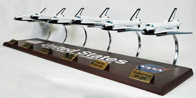 Collection of all Space Shuttles Orbiters built for flight: Enterprise, Columbia, Challenger, Discovery, Atlantis, and Endeavour.