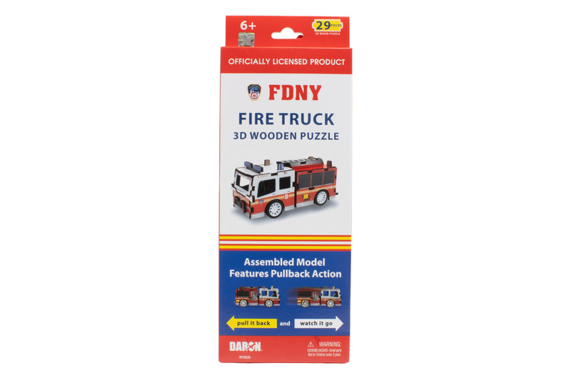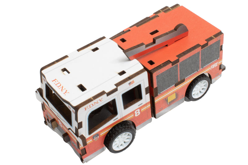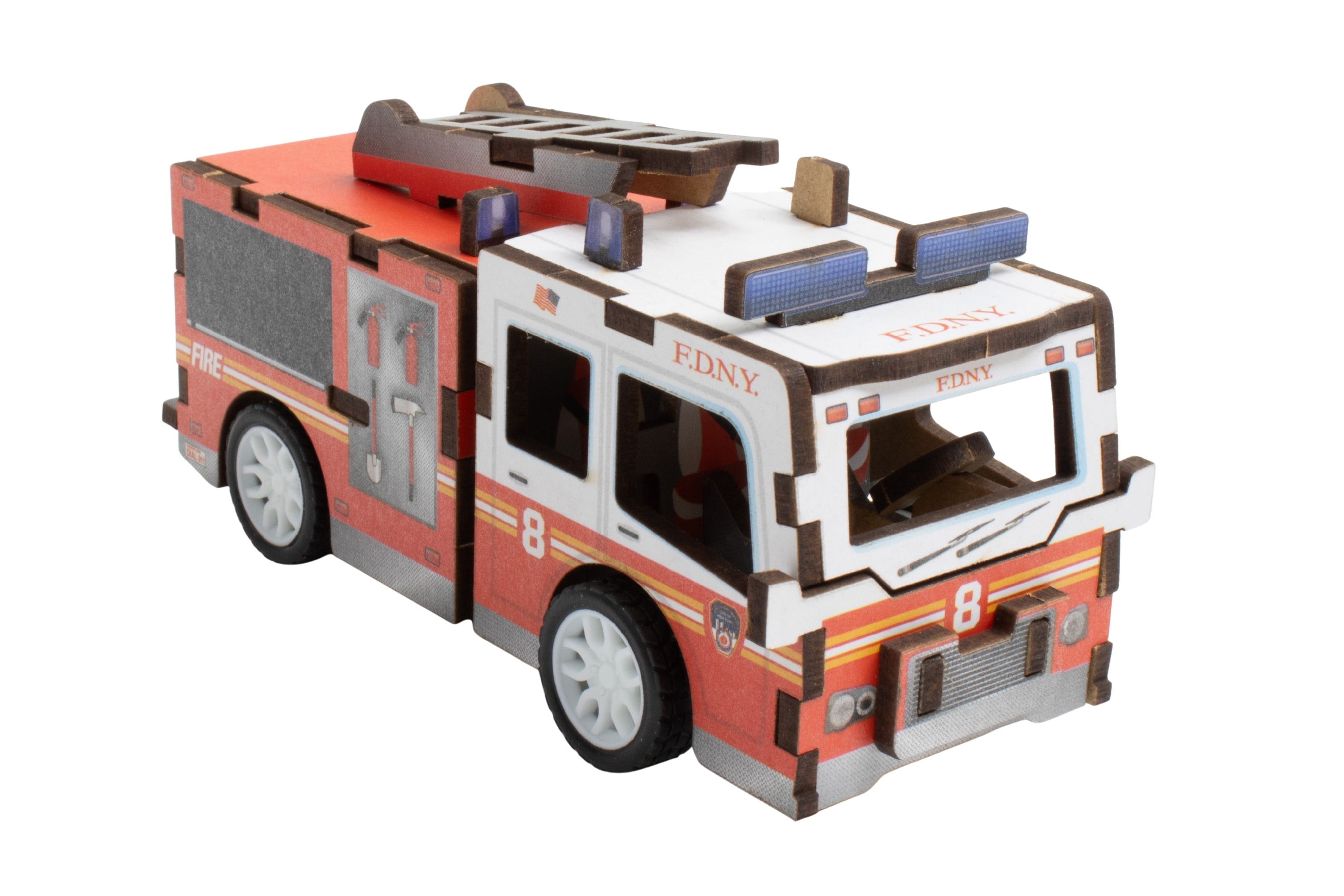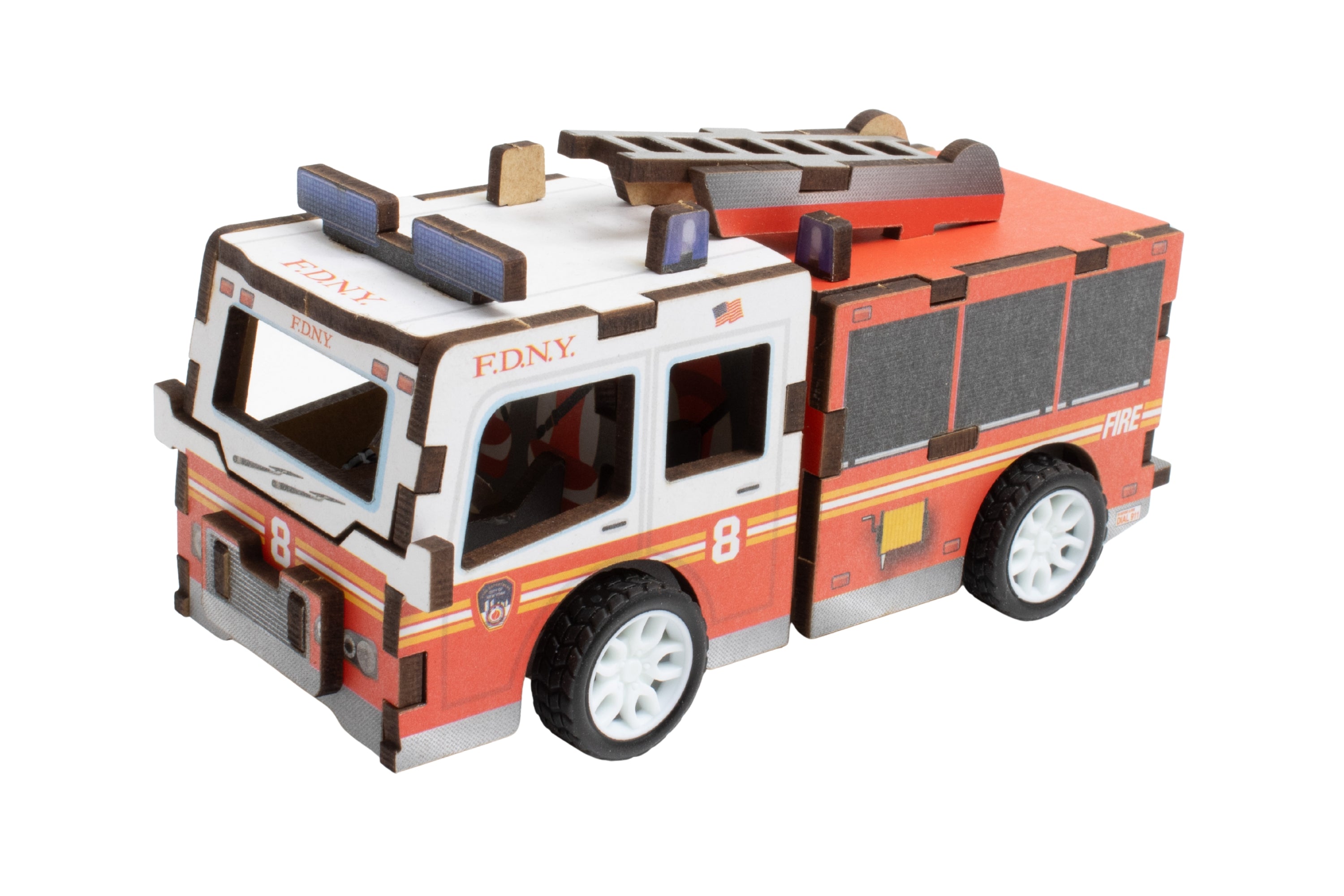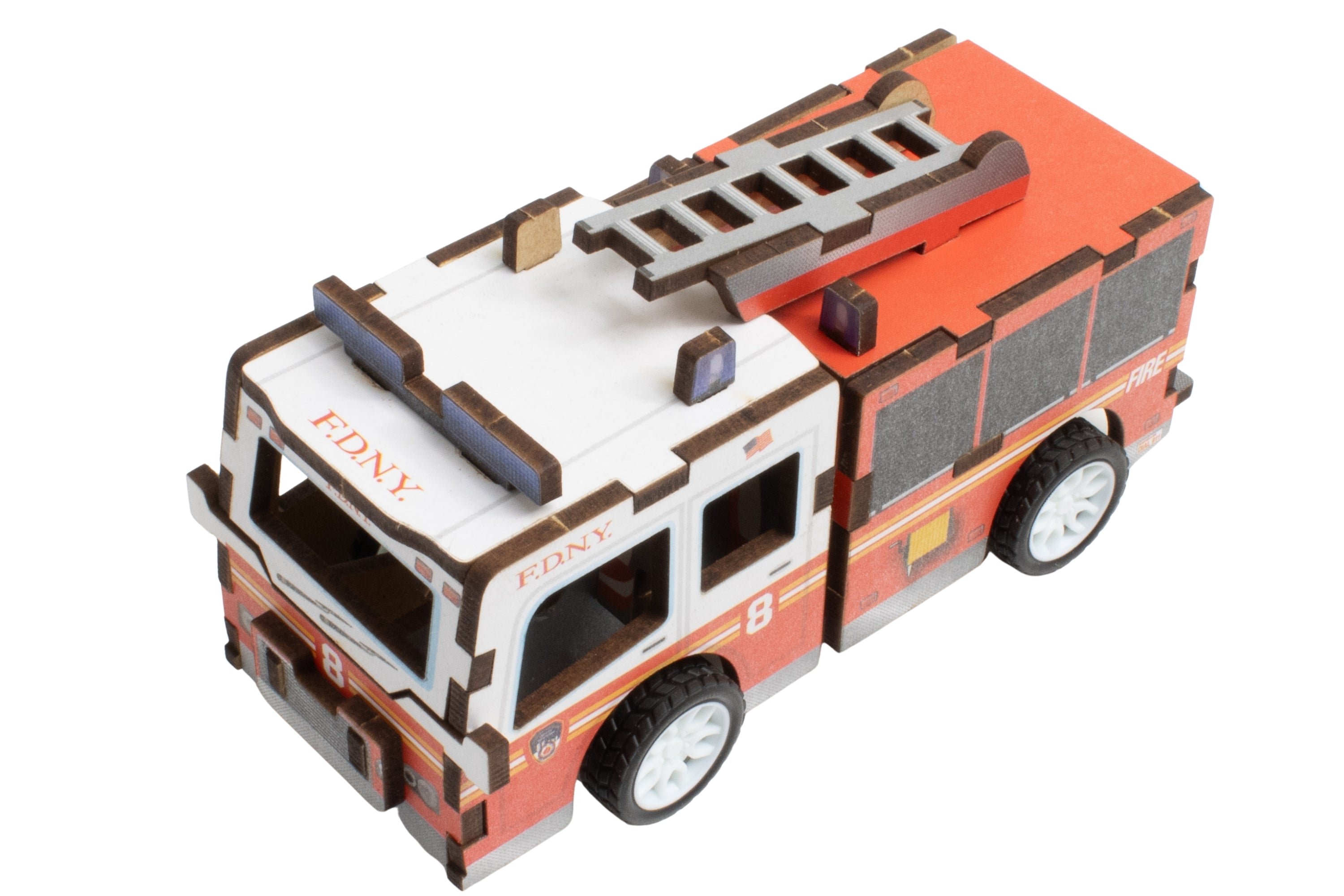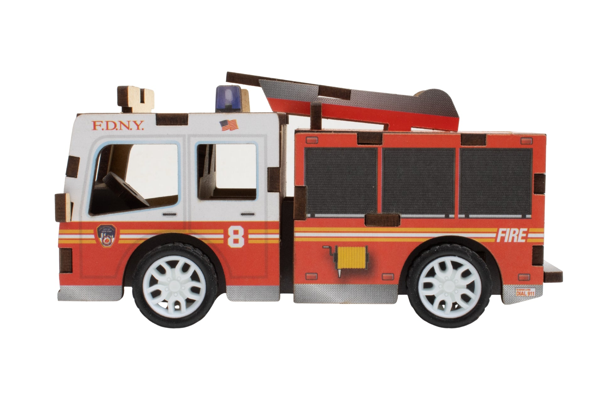 A 29-piece 3D wooden puzzle that doubles as a vehicle toy! This unique puzzle kit lets children and adults build one of New York City's signature vehicles piece by piece and then play with it like a toy. The officially licensed FDNY Fire Truck comes in its iconic red color decorated with an authentic FDNY logo and shield. Complete with a pull-back gearbox, the vehicle zooms forward when you pull back and let it go! Recommended for Ages 3+. The first FDNY ladder trucks were pulled by two horses and carried wooden ladders up to 73 feet long. Evolving over time, they went from being horse-drawn to using steam engines, then gasoline-powered, and ultimately the "Super Pumper." The Super Pumper could draw water from eight hydrants at once and provide a flow at up to 10,000 gallons per minute. While fire trucks through the centuries have been painted various colors, red became dominant color in the 1800s. Various theories for the color choice abound, including different fire brigades wanting to stand out from others, and the fact that red is a color that signifies urgency.