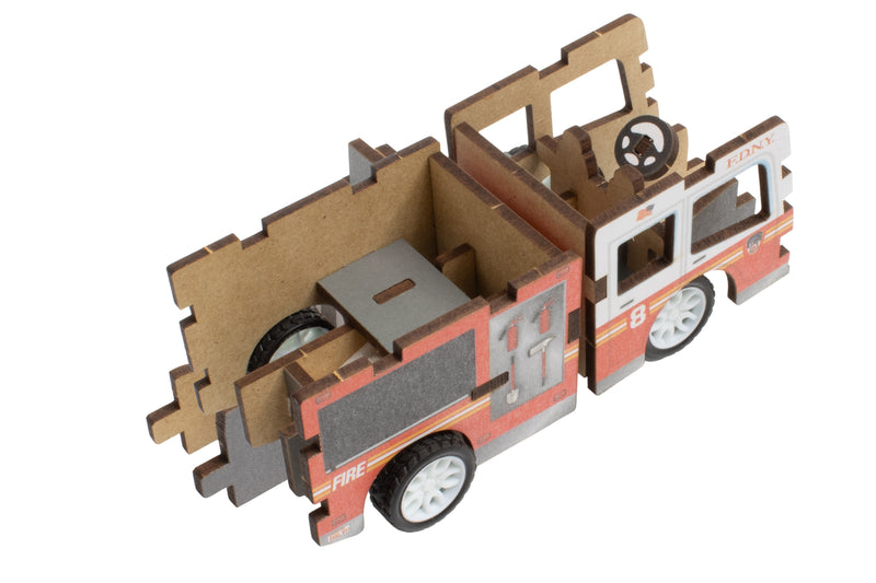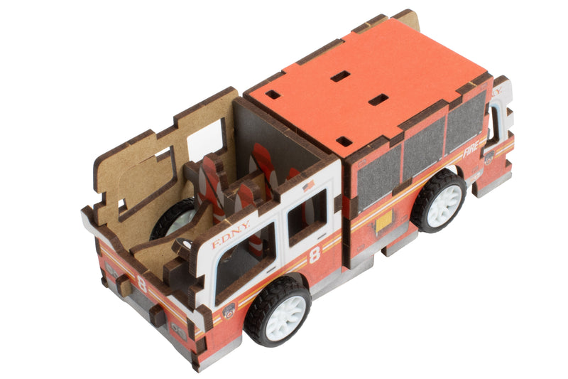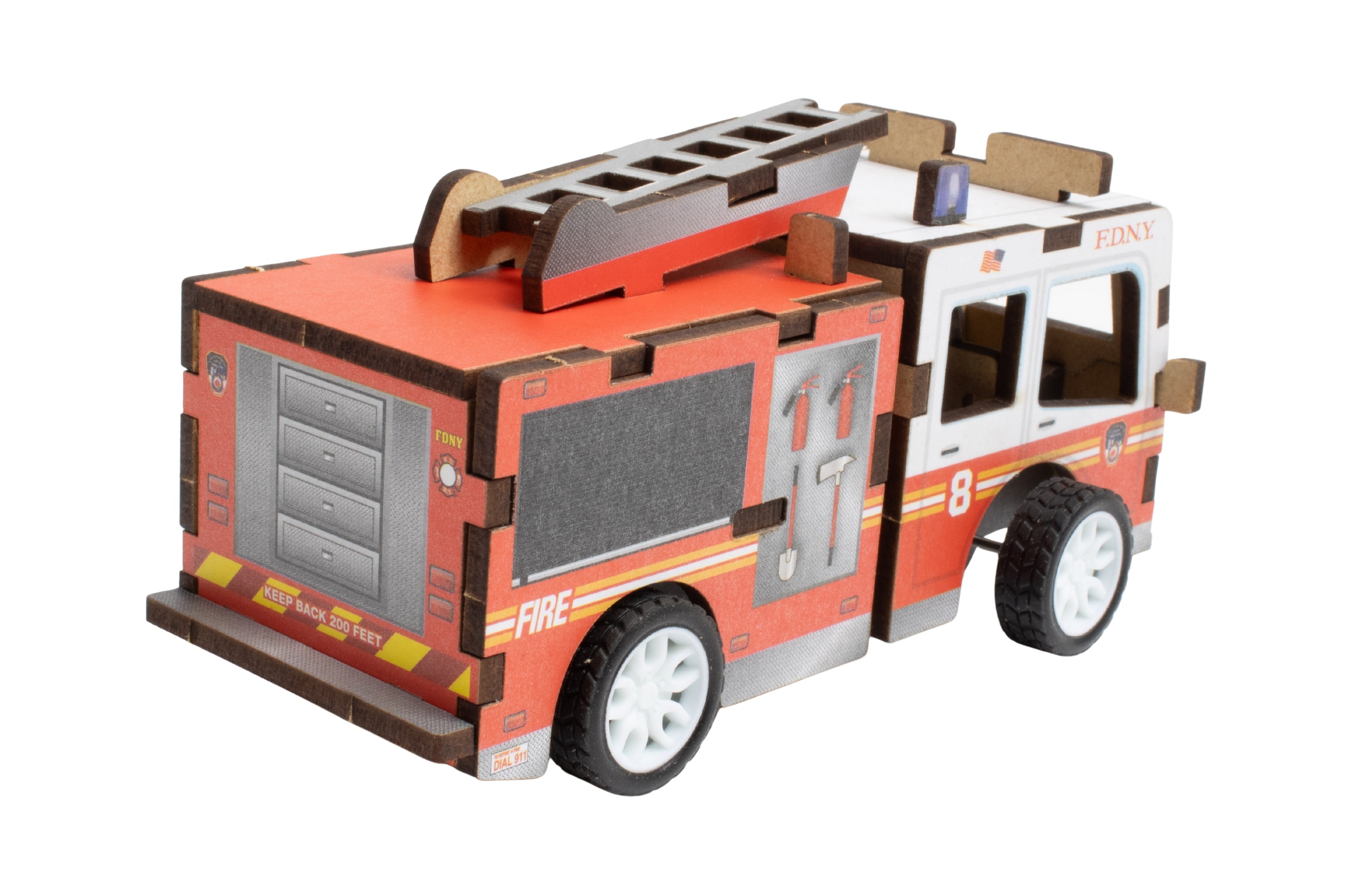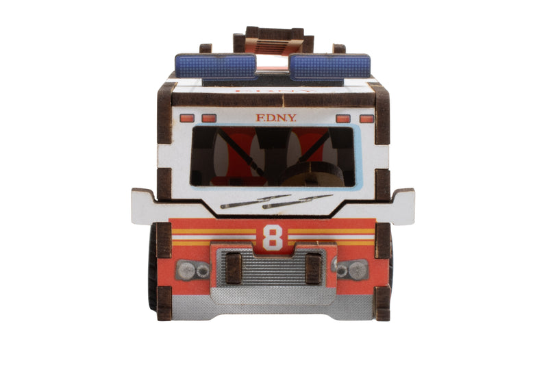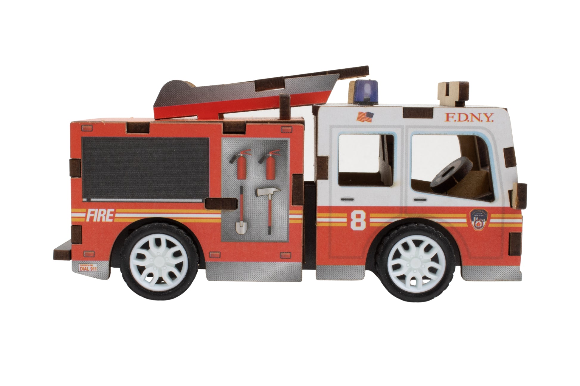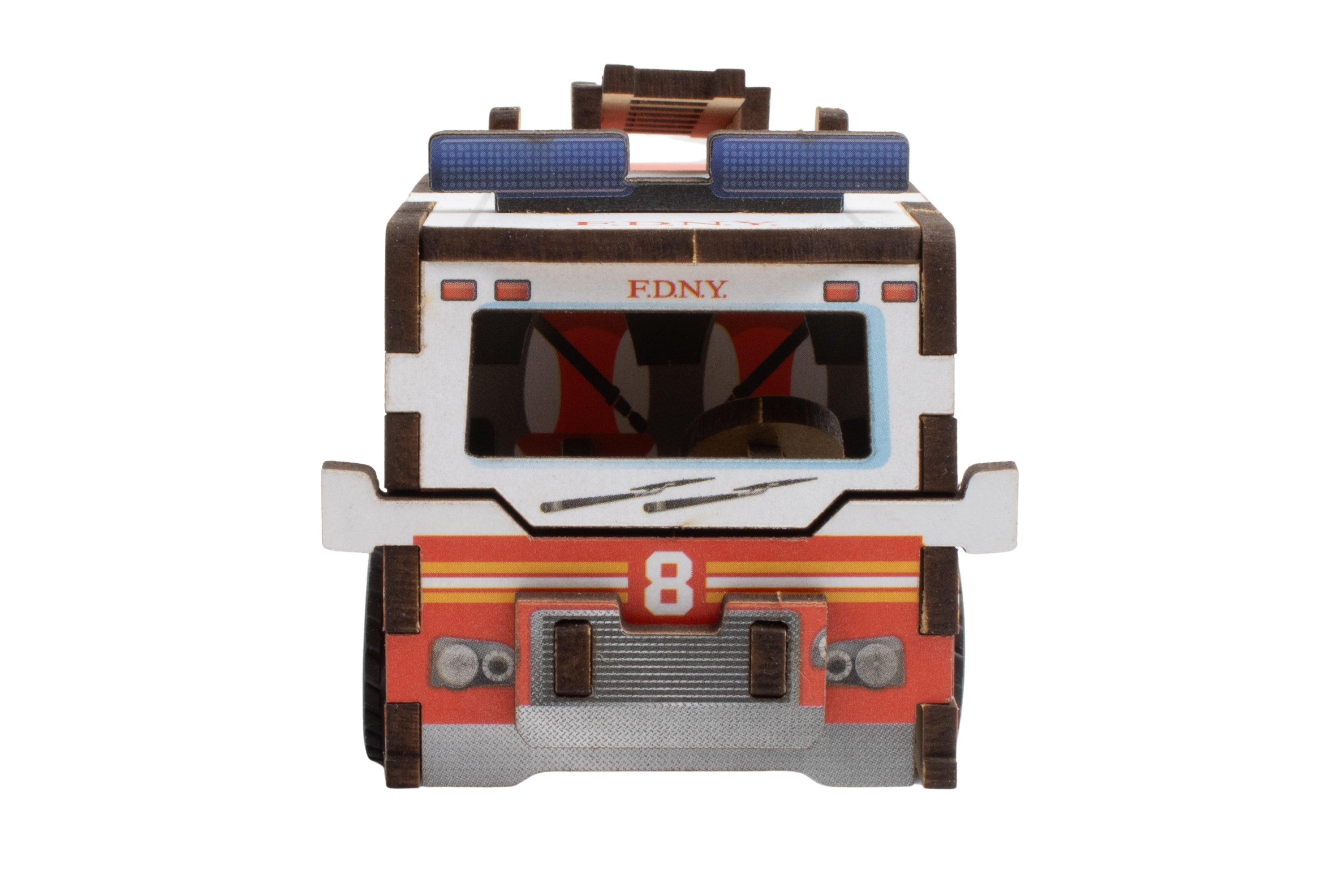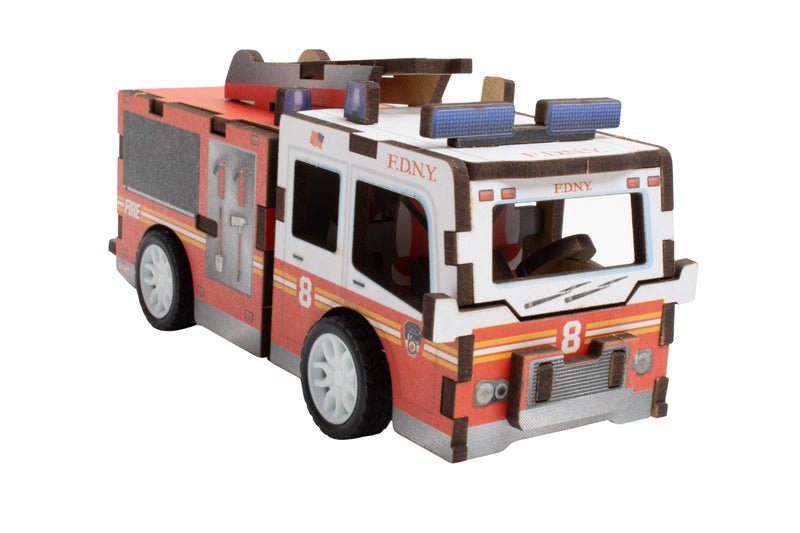 A 29-piece 3D wooden puzzle that doubles as a vehicle toy! This unique puzzle kit lets children and adults build one of New York City's signature vehicles piece by piece and then play with it like a toy. The officially licensed FDNY Fire Truck comes in its iconic red color decorated with an authentic FDNY logo and shield. Complete with a pull-back gearbox, the vehicle zooms forward when you pull back and let it go! Recommended for Ages 3+. The first FDNY ladder trucks were pulled by two horses and carried wooden ladders up to 73 feet long. Evolving over time, they went from being horse-drawn to using steam engines, then gasoline-powered, and ultimately the "Super Pumper." The Super Pumper could draw water from eight hydrants at once and provide a flow at up to 10,000 gallons per minute. While fire trucks through the centuries have been painted various colors, red became dominant color in the 1800s. Various theories for the color choice abound, including different fire brigades wanting to stand out from others, and the fact that red is a color that signifies urgency.