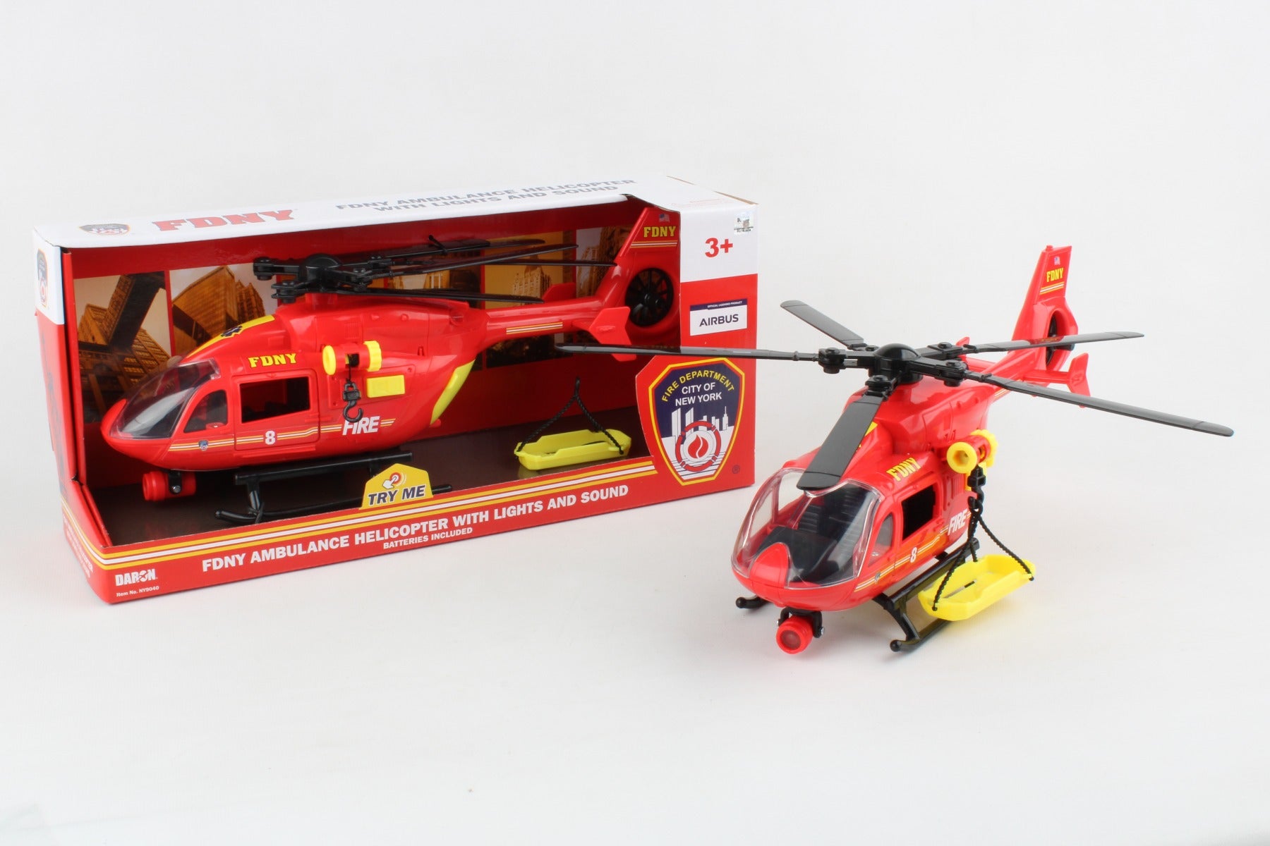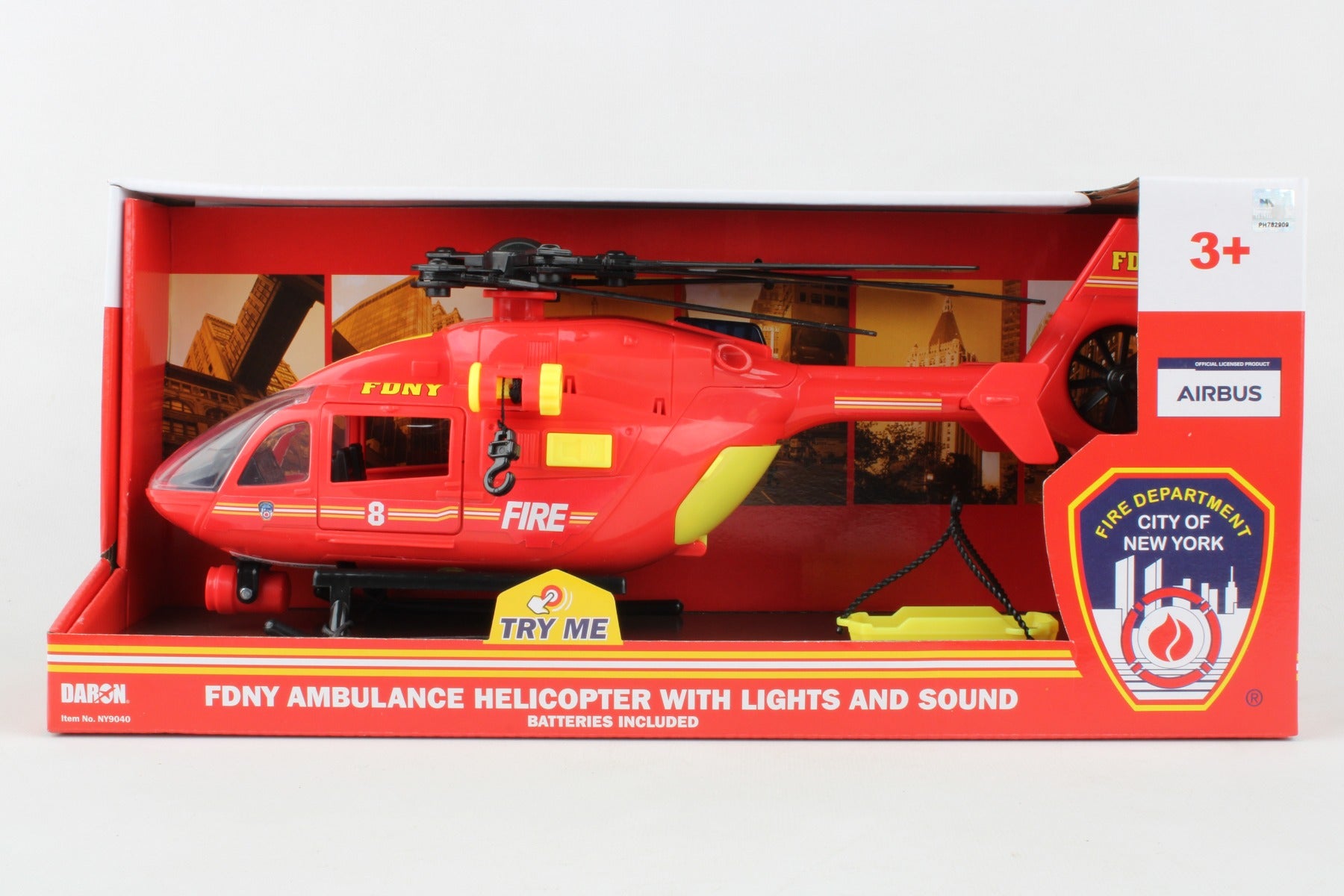 FDNY Ambulance Helicopter has realistic lights and sounds,, retractable stretcher, opening doors, and spinning rotors. Officially licensed product of Airbus. Two 1.5V AAA batteries included. Recommended for ages 3+.