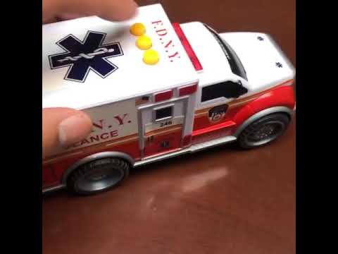 This plastic free-wheeling ambulance is approximately 7L x 2.5W. The ambulance is fully equipped with lights and 3 unique sounds. All logos and marks are certified by the FDNY. Three 1.5V AG13 Alkaline Batteries are included with purchase. Recommended for children Ages 3+.