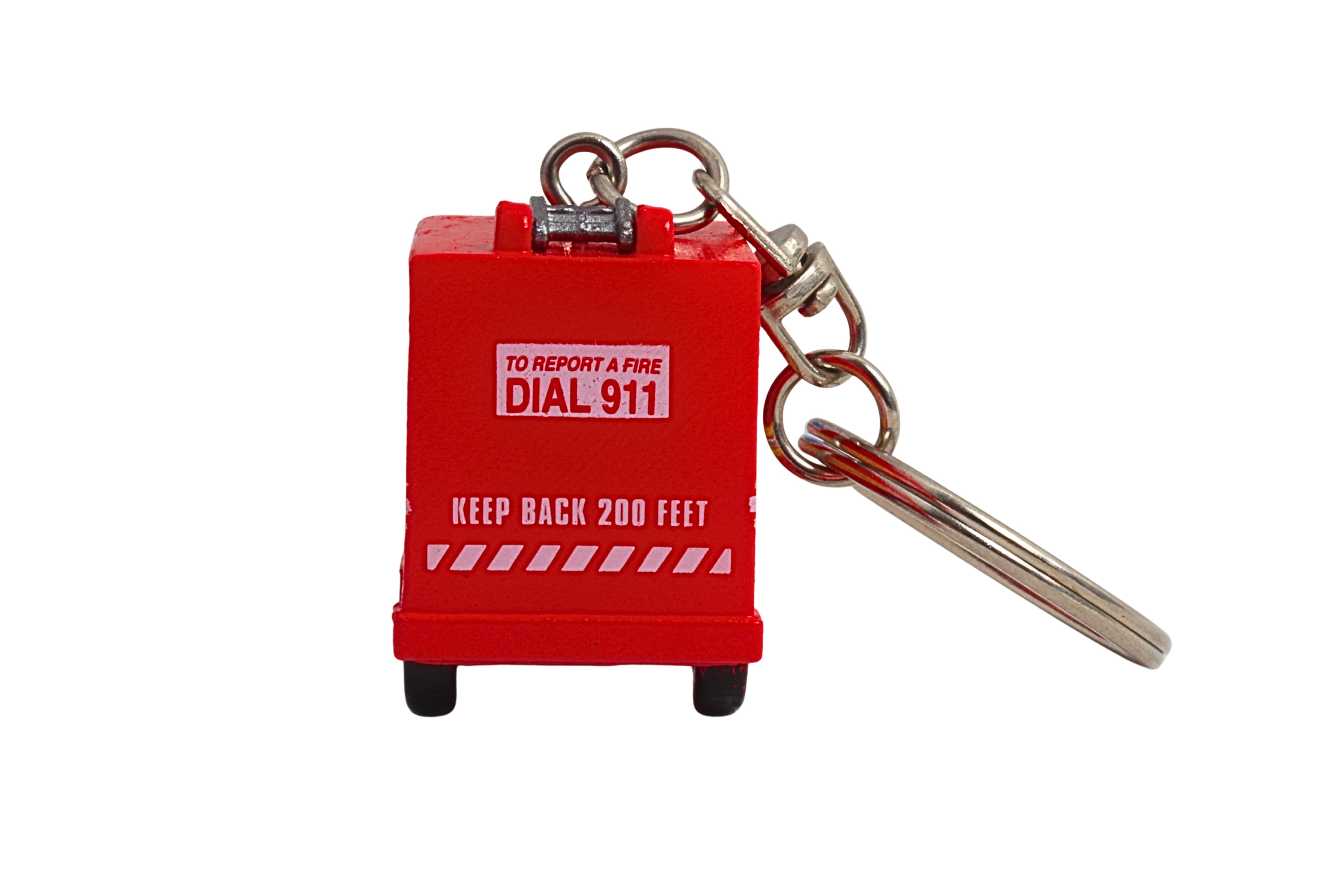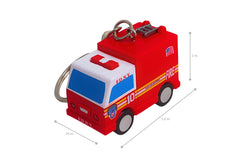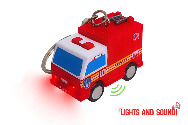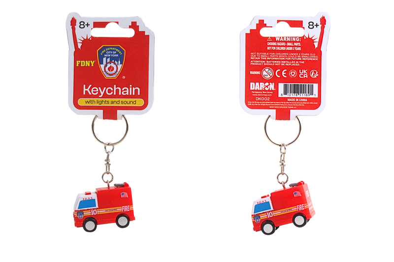 For fans of the iconic FDNY Fire Truck, here's the perfect keepsake to take along wherever you go! Faithfully designed with the officially licensed FDNY Fire Truck logo and authentic red color scheme, this keychain has a fun, chunky form that is easy to grasp, and best of all, it has special features. Just press the buttons to see the fire truck light up and hear fun sounds! The first FDNY ladder trucks were pulled by two horses and carried wooden ladders up to 73 feet long. Evolving over time, they went from being horse-drawn to using steam engines, then gasoline-powered, and ultimately the "Super Pumper." The Super Pumper could draw water from eight hydrants at once and provide a flow at up to 10,000 gallons per minute. While fire trucks through the centuries have been painted various colors, red became dominant color in the 1800s. Various theories for the color choice abound, including different fire brigades wanting to stand out from others, and the fact that red is a color that signifies urgency. Now, with this keychain, you can celebrate your favorite firefighting brigade, the FDNY Fire Truck, at any time or place! Recommended for ages 8+
