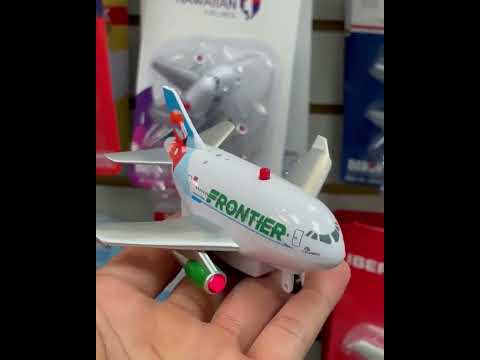 This stylized aircraft features electronic jet sound and flashing red lights, activated by the push of a button on top of the fuselage! Pull the plane back and let it go forward in the take-off position. Plastic construction. Approximately 5" long. Batteries included. Ages 3+