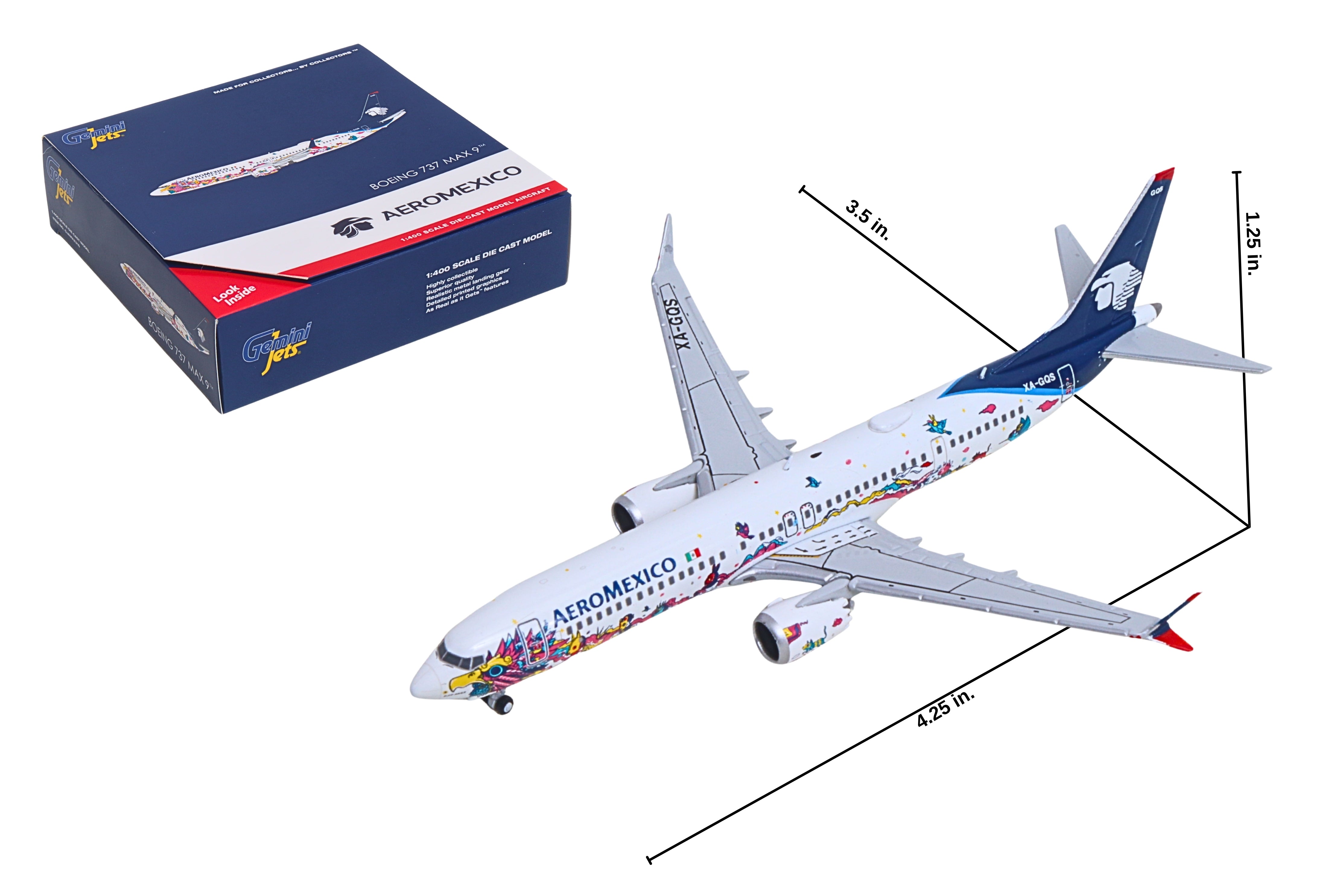 737MAX9 1/400 This die-cast metal airplane model comes in 1/400 scale with landing gear no stand. Model is approximately 4 1/4 inches long with 3 1/2 inch wingspan. Adult collectible ages 14+