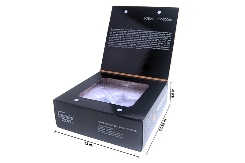 777-200 1/200 This Die-cast metal airplane model comes in 1/200 scale with landing gear and stand. Model is approximately 12 ¼ inches long with 12 inch wingspan. Adult collectible ages 14+