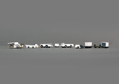 This 1/200 plastic ground equipment set contains a small tug, large tug, belt loader, pallet loader, ground power cart, container cart, covered baggage cart, open baggage cart and tow bar