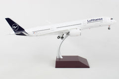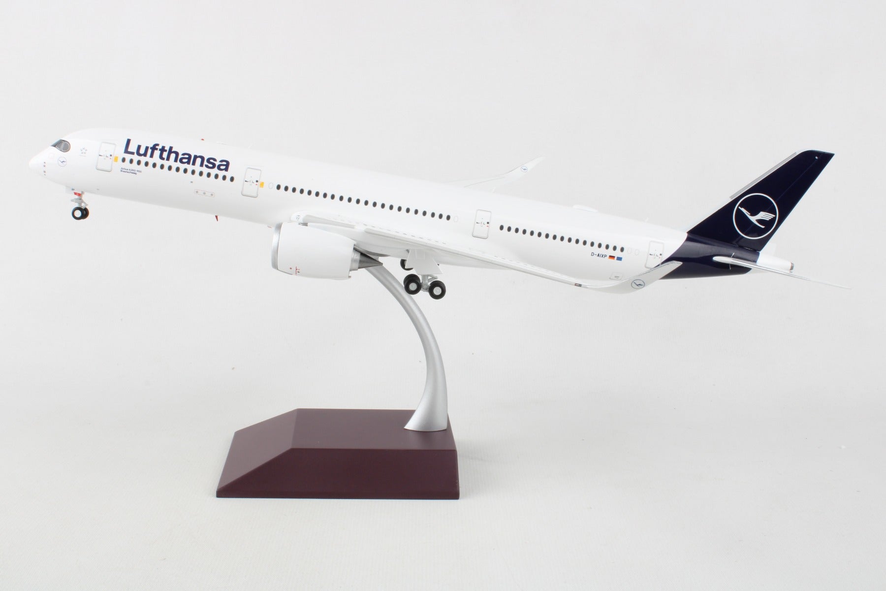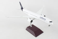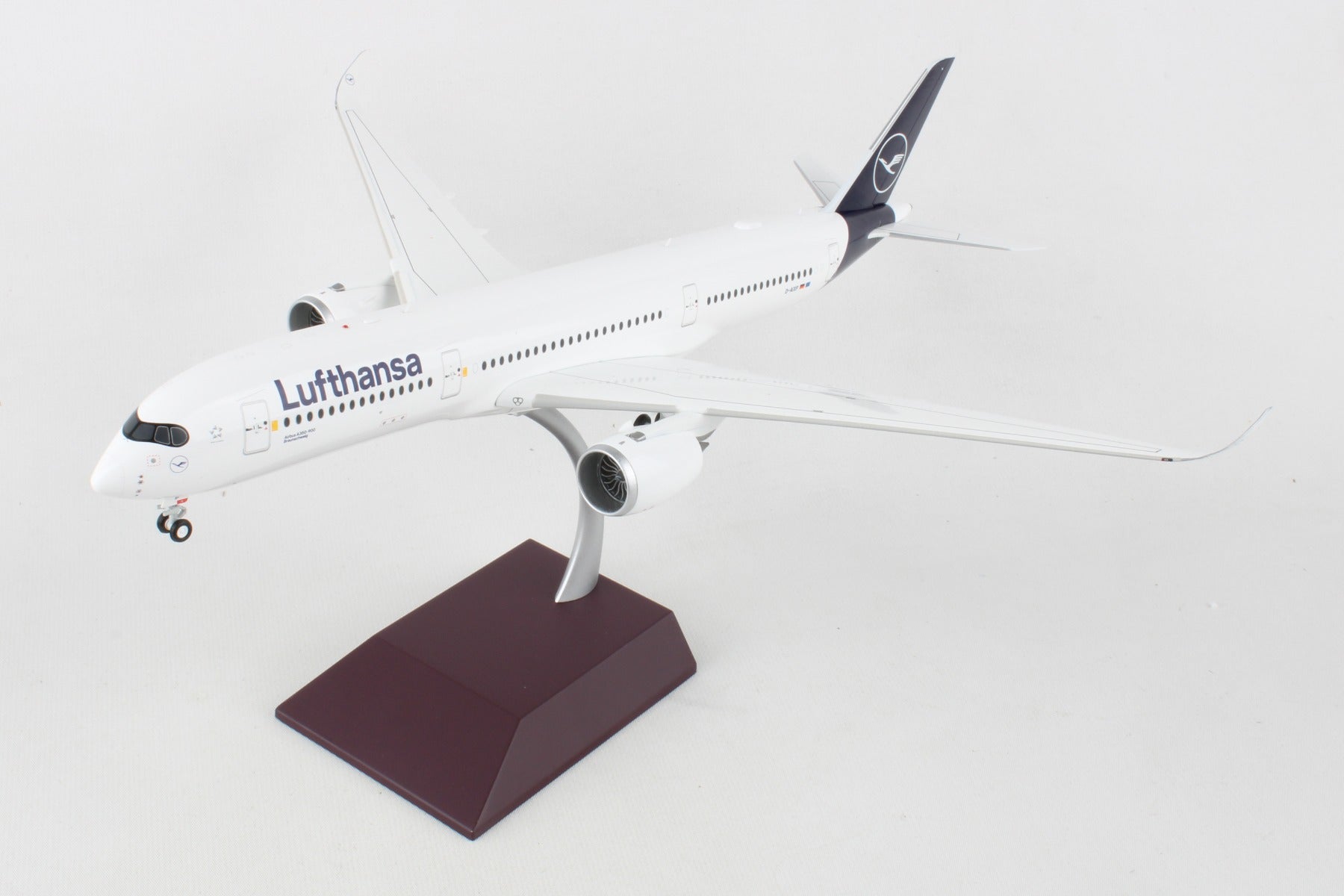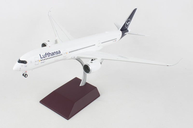 GeminiJets 1/200 scale Lufthansa Airbus A350-900 diecast model is As Real as it Gets and measures approximately 13-1/16-inches long with a 12-3/4-inch wingspan. An Official Licensed Product that is manufactured by GeminiJets as a limited edition, highly collectible model, this Lufthansa Airbus A350-900 - Registration D-AIXP - has been meticulously recreated from Airbus' blueprints and features realistic landing gear along with detailed graphics and markings, assuring the utmost accuracy and superior quality. A Display Stand is included. Recognized as Airbus' first aircraft largely manufactured of carbon fiber reinforced polymer, consequently yielding increased efficiency, reduced weight, and improved aerodynamics, the Airbus A350-900, which succeeds the Airbus A340, was proposed by Airbus to compete against Boeing's 787 Dreamliner and went into service in 2015 with Qatar Airways as the launch customer. A large aircraft, the A350 can seat 300-410 passengers in a typical three-class configuration (up to 480 passengers in an all economy, high-density configuration), and is designed to fly short-haul to ultra-long-haul routes with a 9,700nm range. While the initial A350-900 model has a fuselage length of 219.5-ft with a 213-ft wingspan, the latter stretched variant, the A350-1000 comes in with a 242.4-ft fuselage, the same 213-ft wingspan, and features Rolls Royce Trent XWB new technology engines. Although a shorter A350-800, with a 198.6-ft fuselage was initially planned, it never came to fruition.
