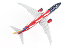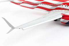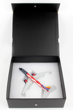This Die-cast metal airplane model comes in 1/200 scale with landing gear and stand. Model is approximately 7 ½ inches long with 7 inch wingspan.