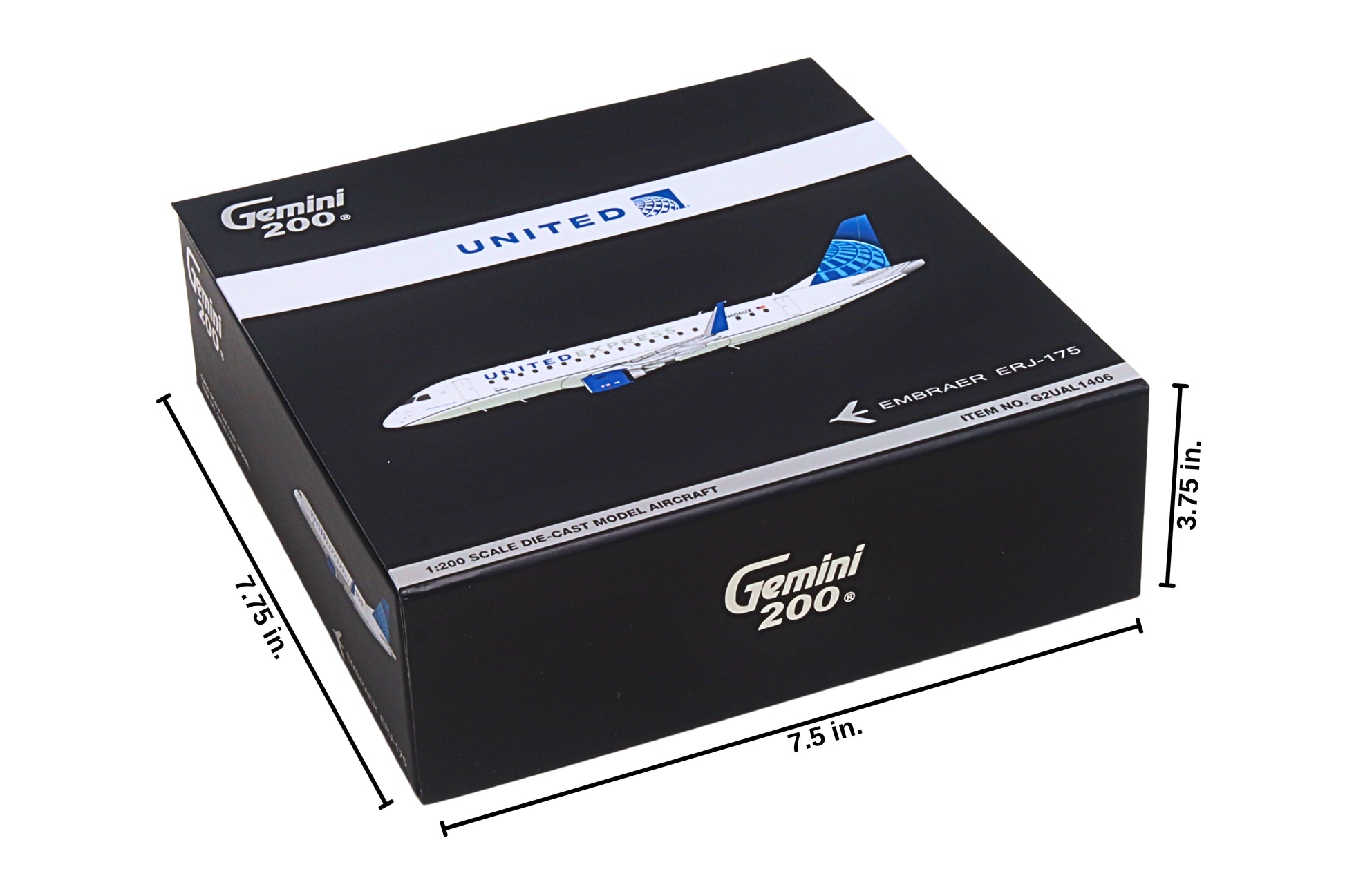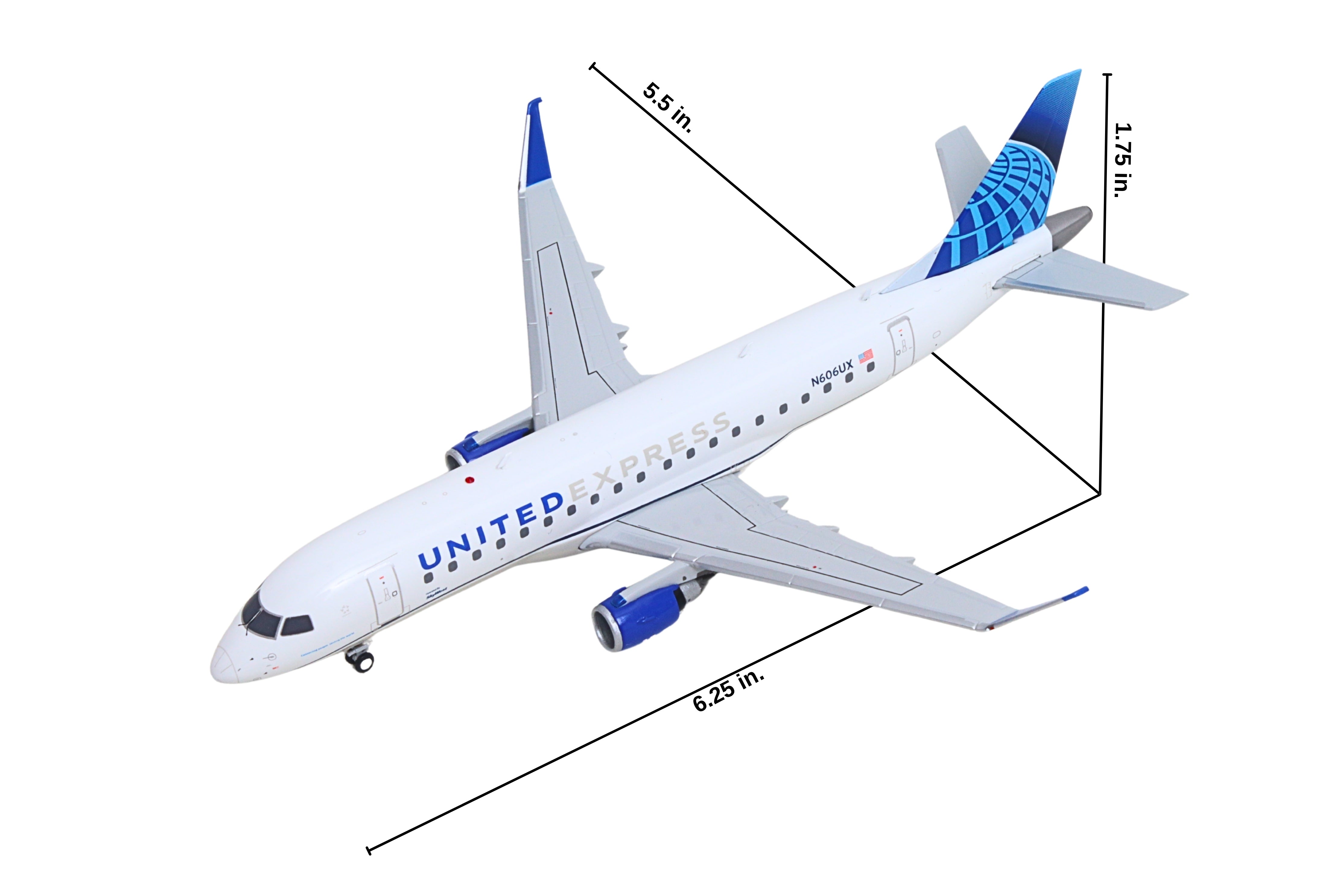 ERJ175 1/200 This Die-cast metal airplane model comes in 1/200 scale with landing gear and stand. Model is approximately 6 ¼ inches long with 5 ½ inch wingspan. Adult collectible ages 14+