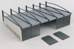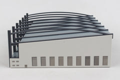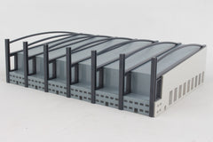 SIMPLE SNAP FIT ASSEMBLY. A great addition to your airport buildings in the 1/500 scale: a hangar for your diorama. It is 25 centimeters (9.8 inches) wide, 18 centimeters (7.1 inches) deep, and 7 centimeters (2.8 inches) high.