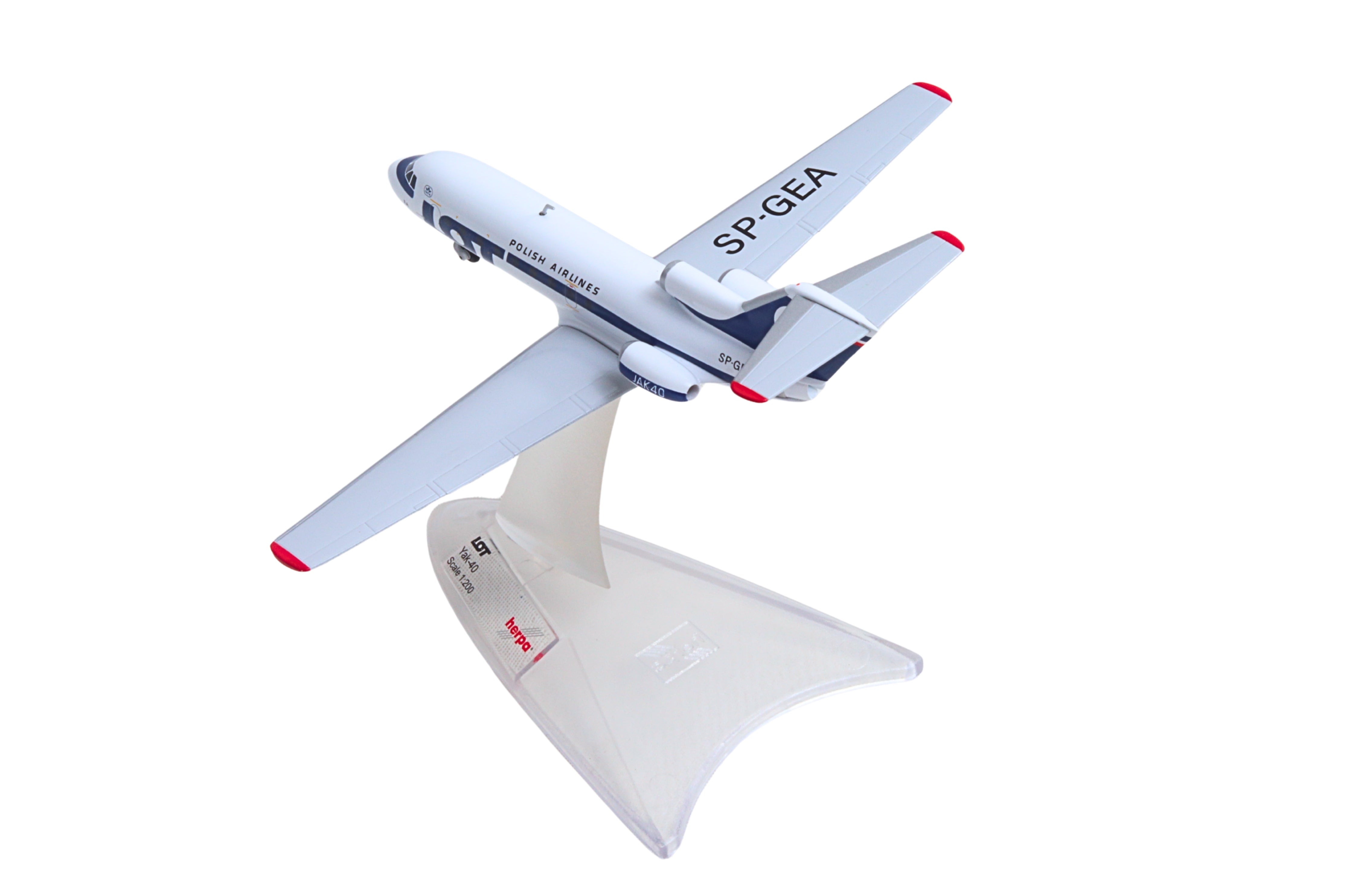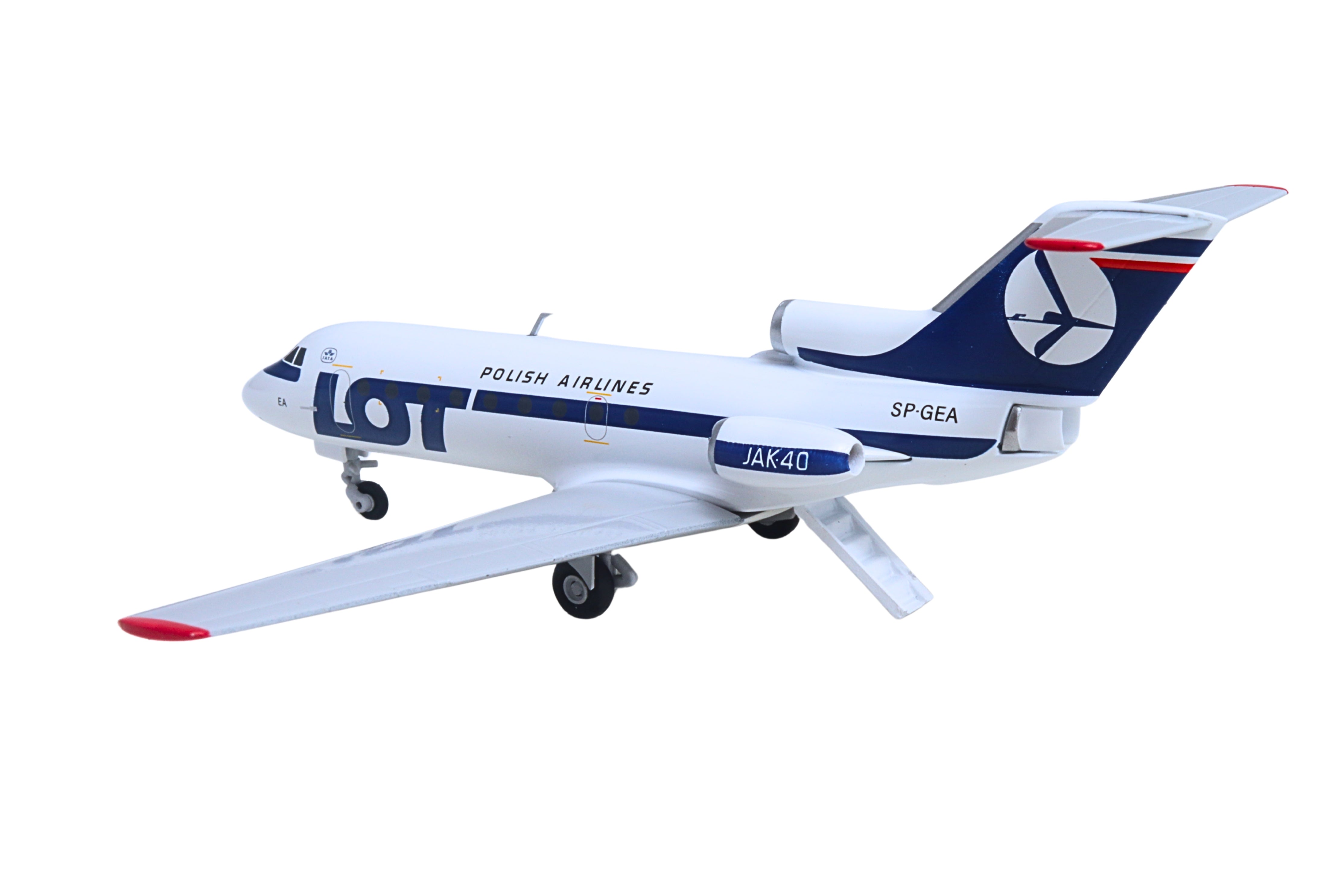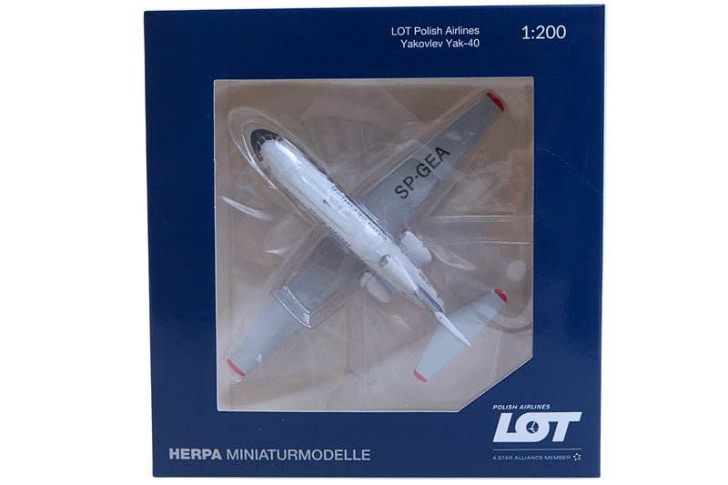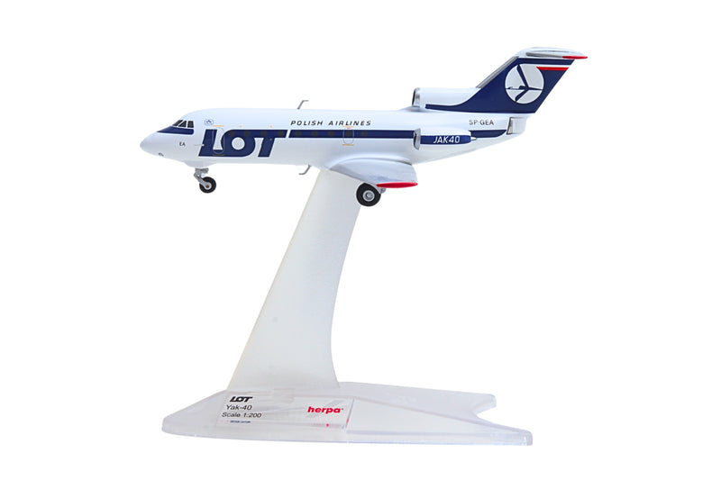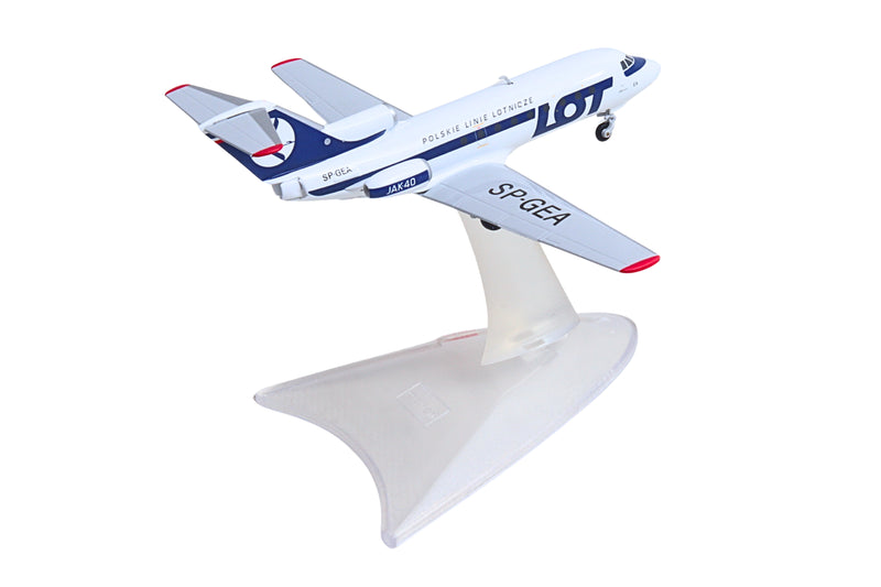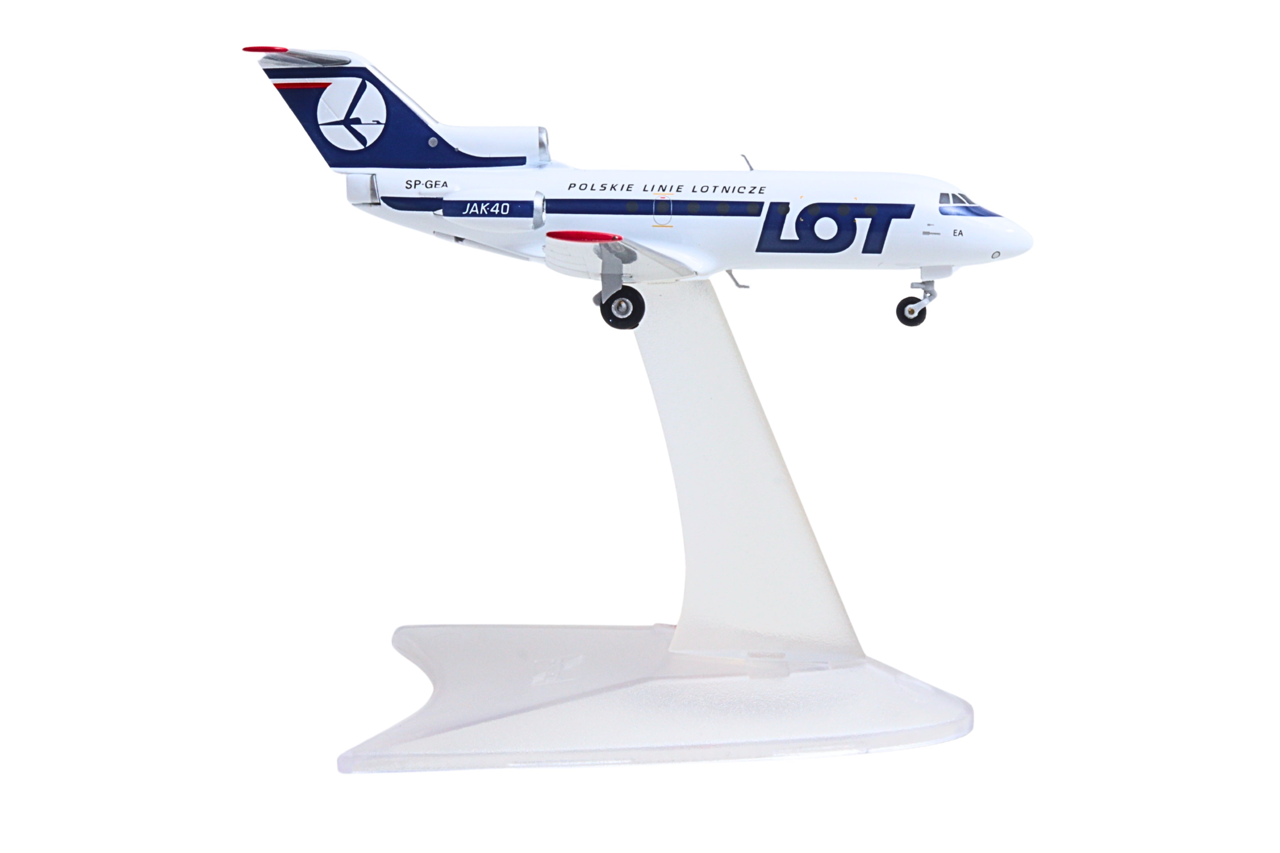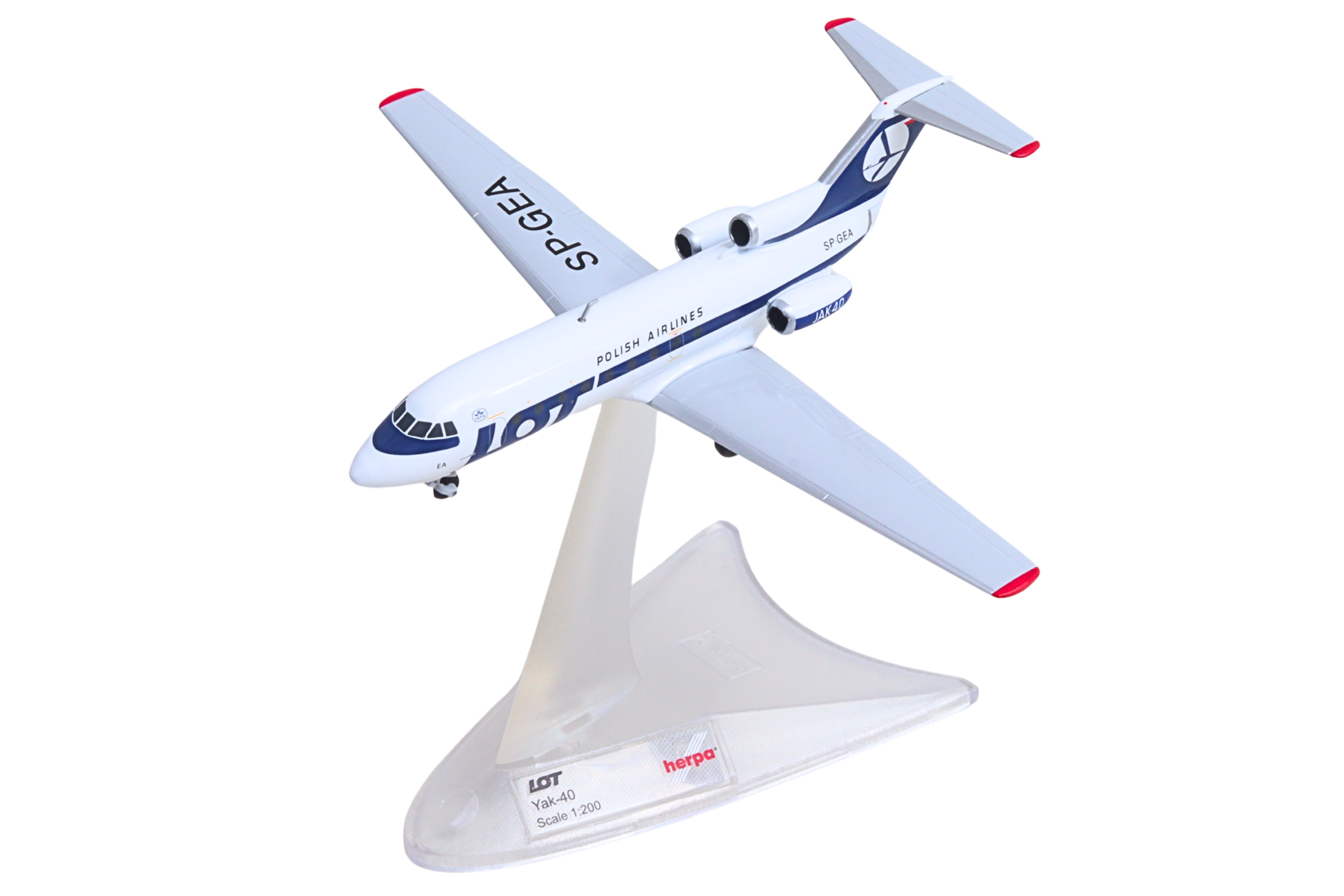 Yak40 1/200 This Die-cast metal airplane model comes in 1/200 scale with landing gear and plastic stand. Model is approximately 3 ¾ inches long with 4 ¾ inch wingspan. Adult collectible ages 14+