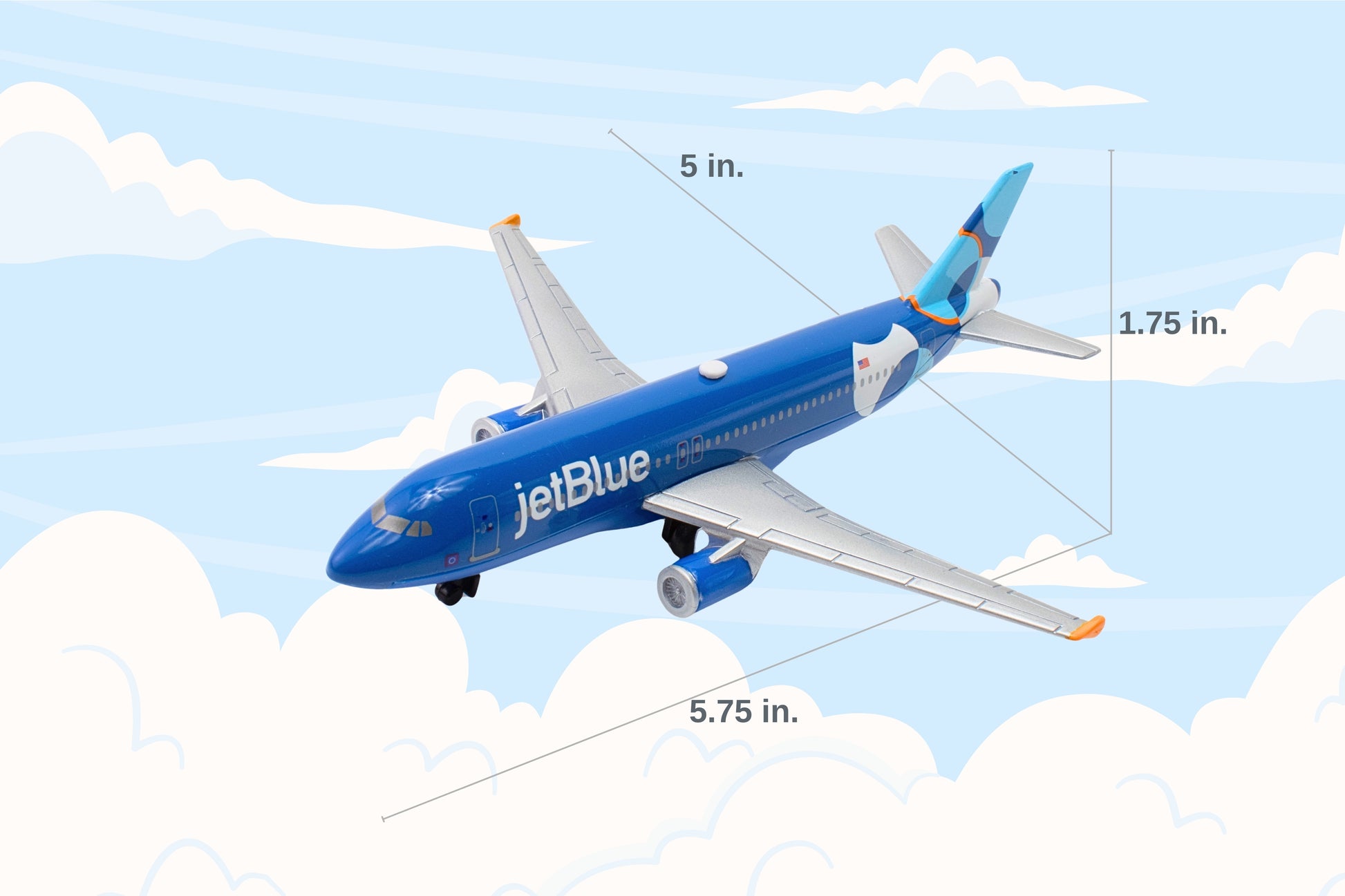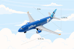 This die-cast metal airplane toy with plastic parts is approximately 5.75 inches in length and has a 5.5 inch wingspan. It is faithfully painted in the jetBlue Spotlight livery. The toy features highly detailed graphics authentic to the aircraft. Recommended for ages 3+. The A320neo is an A320 variant with a shortened fuselage. It flies up to 3,450 nautical miles and thanks to fuel-efficient engines, it burns 20% less fuel reducing CO2 emissions. With wider seats, extra-large overhead storage bins, and a versatile cabin space, it can fit up to 194 seats at maximum capacity. jetBlue started flying A320neos in 2014.