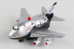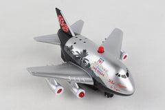 This stylized aircraft features electronic jet sound and flashing red lights, activated by the push of a button on top of the fuselage! Pull the plane back and let it go forward in the take-off position. Ages 3+