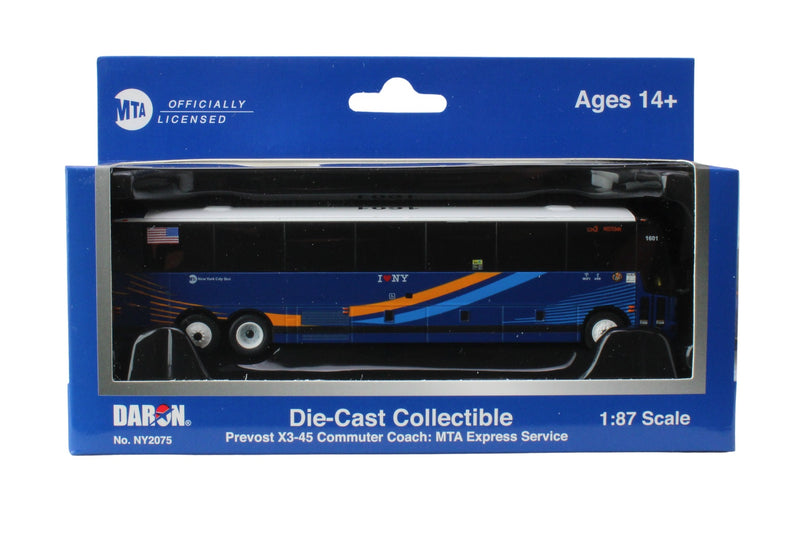 Elevate your assortment with the MTA Prevost X3-45 Commuter Coach: MTA Express Service Bus! This intricately designed 1:87 scale model is a lifelike reproduction, showcasing exquisite details. Suitable for ages 3 and up.