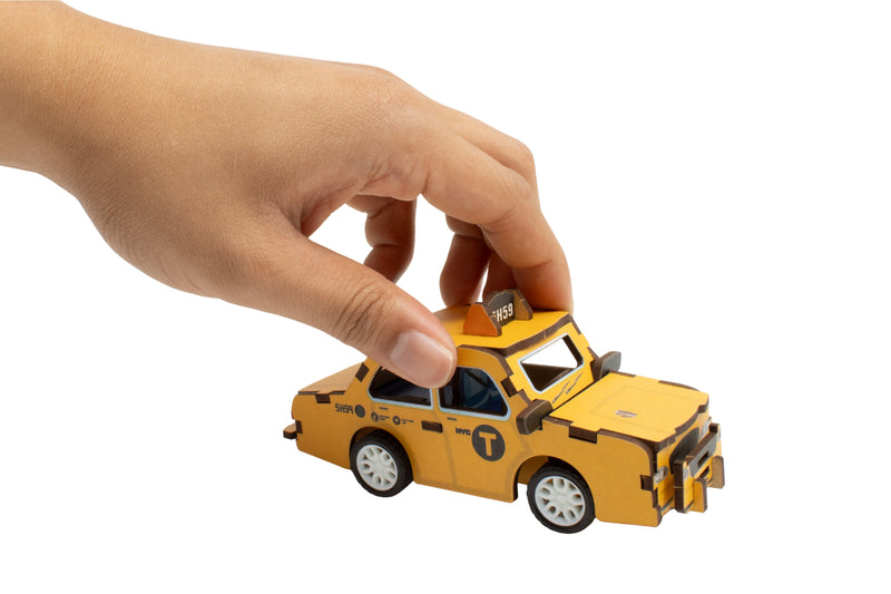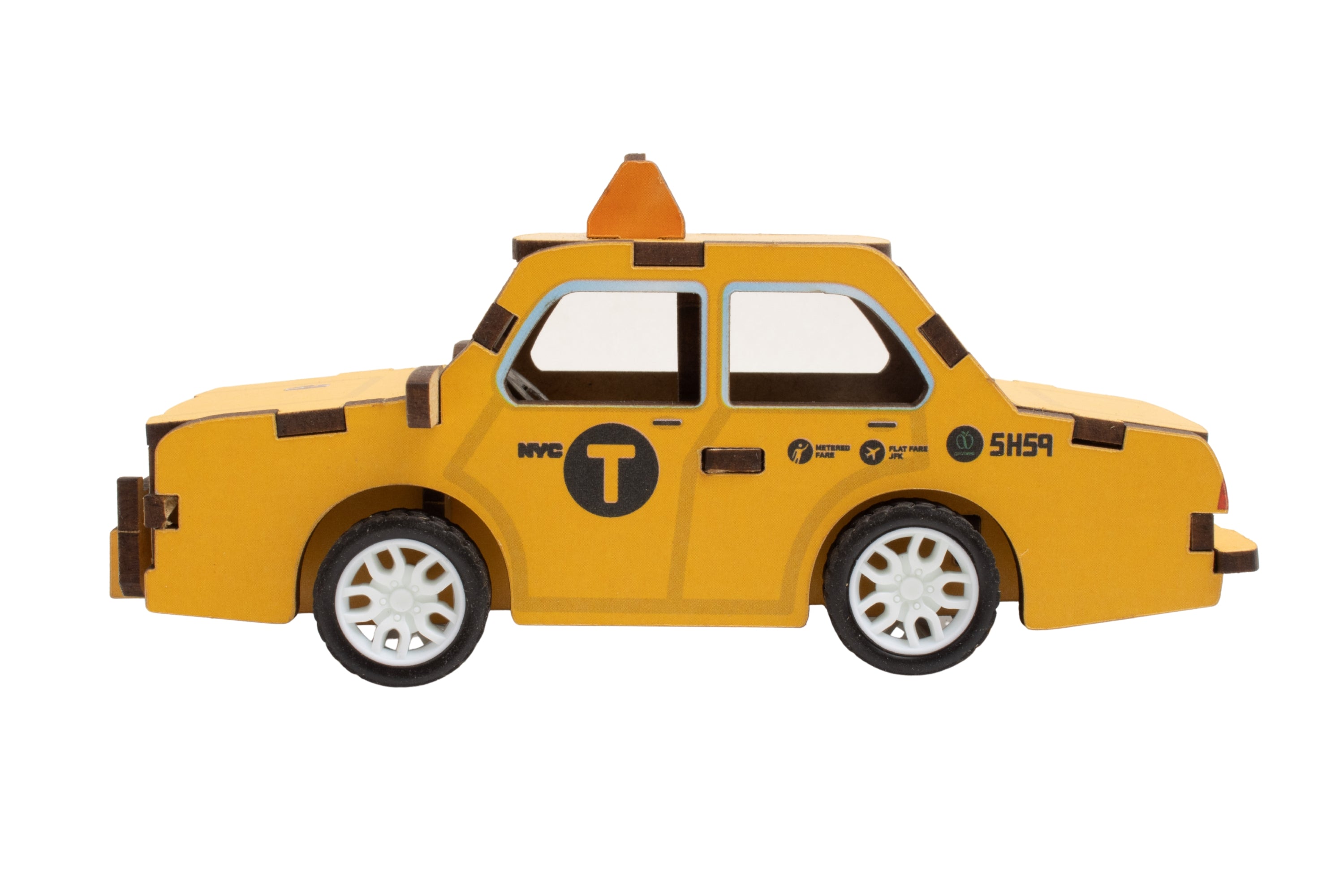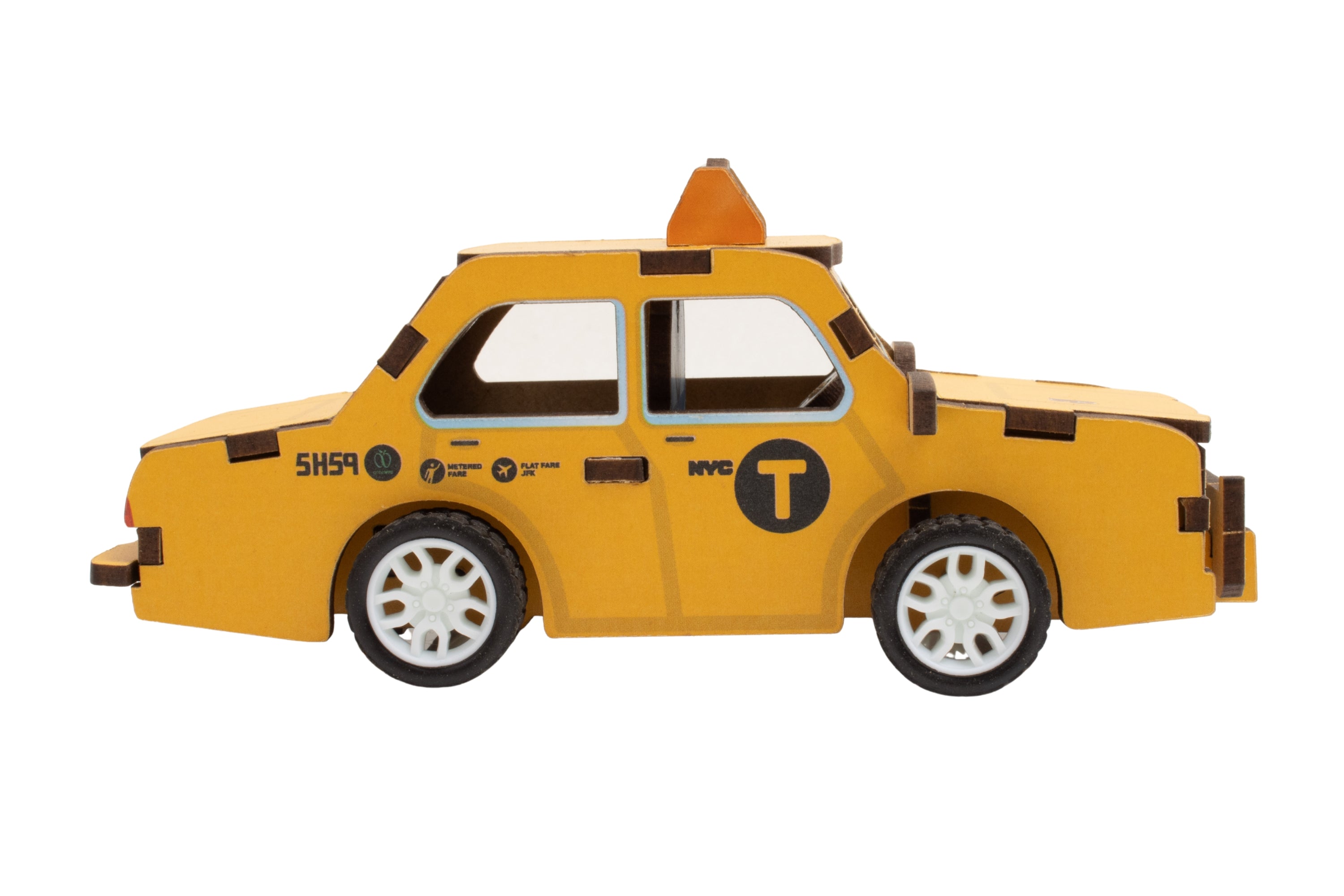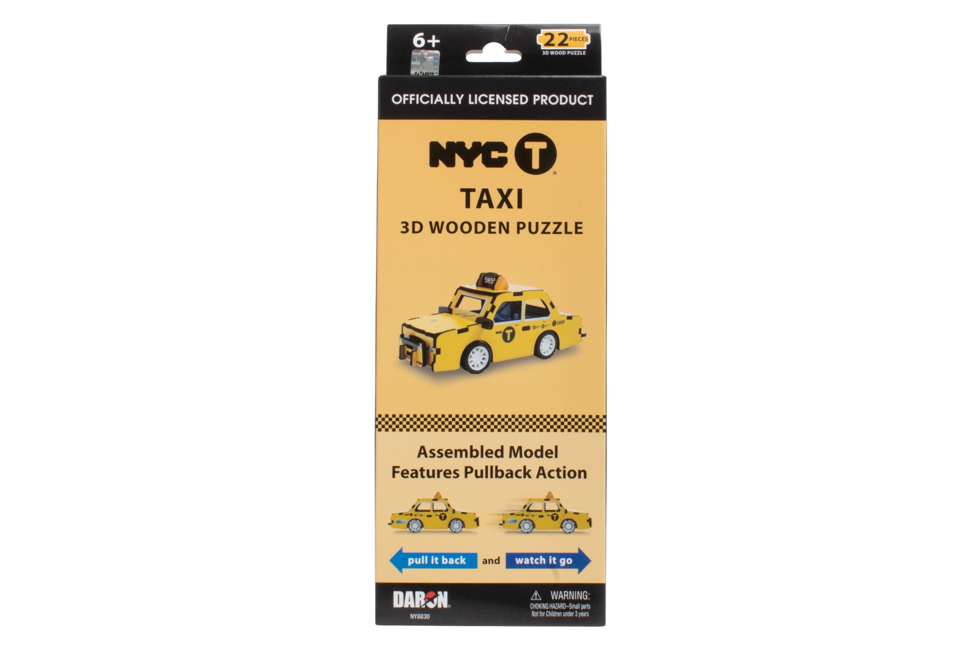 A 22-piece 3D wooden puzzle that doubles as a vehicle toy! This unique puzzle kit lets children and adults build one of New York City's signature vehicles piece by piece and then play with it like a toy. The officially licensed NYC Taxi Cab comes in its trademark yellow color decorated with an authentic NYC Taxi logo. Complete with a pull-back gearbox, the vehicle zooms forward when you pull back and let it go! While the first taxi cabs of the early 1900s were painted red and green, it wasn't long before yellow became the norm. The wife of taxi company owner Albert Rockwell suggested he repaint his entire fleet yellow, and his company became so successful that he officially incorporated the Yellow Taxicab Company in 1912. In the late 1960s, the New York City Taxi and Limousine Commission helped establish a law requiring all "licensed medallion" taxis to be painted a specific shade of yellow. This alerted riders that the yellow taxis were regulated, supervised, and licensed to pick up anyone who hailed a cab. The specific shade of yellow officially matched the shade used for yellow school buses.