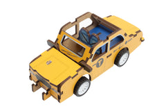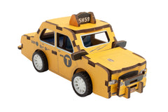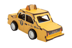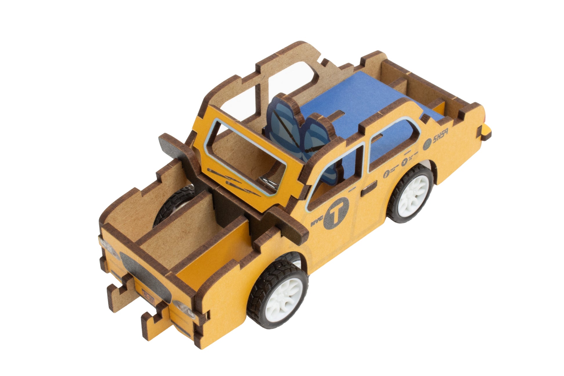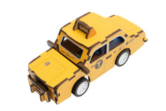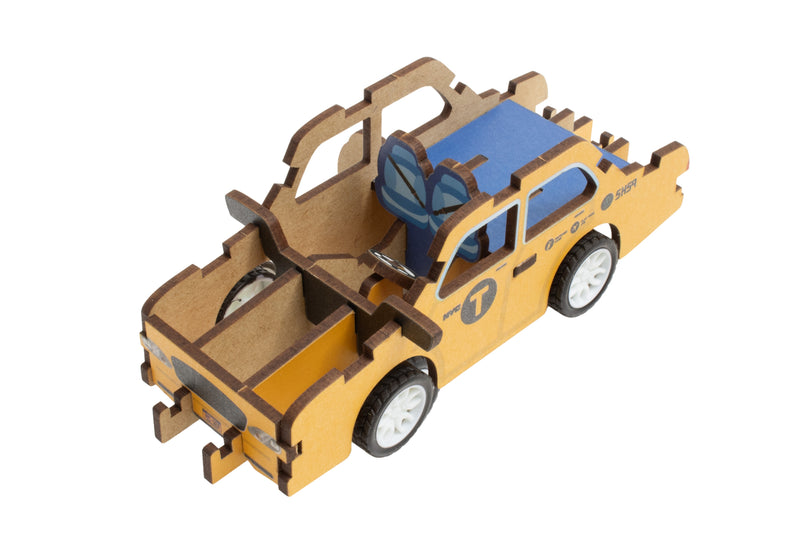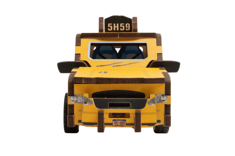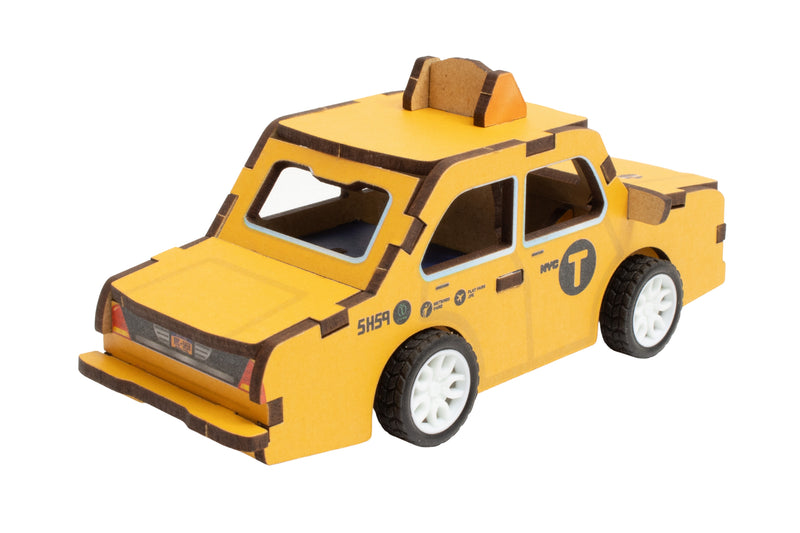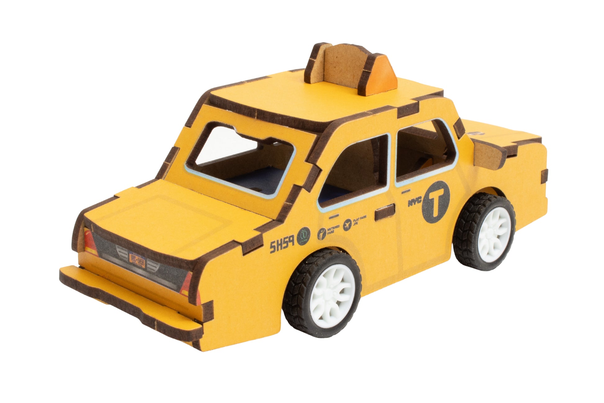 A 22-piece 3D wooden puzzle that doubles as a vehicle toy! This unique puzzle kit lets children and adults build one of New York City's signature vehicles piece by piece and then play with it like a toy. The officially licensed NYC Taxi Cab comes in its trademark yellow color decorated with an authentic NYC Taxi logo. Complete with a pull-back gearbox, the vehicle zooms forward when you pull back and let it go! While the first taxi cabs of the early 1900s were painted red and green, it wasn't long before yellow became the norm. The wife of taxi company owner Albert Rockwell suggested he repaint his entire fleet yellow, and his company became so successful that he officially incorporated the Yellow Taxicab Company in 1912. In the late 1960s, the New York City Taxi and Limousine Commission helped establish a law requiring all "licensed medallion" taxis to be painted a specific shade of yellow. This alerted riders that the yellow taxis were regulated, supervised, and licensed to pick up anyone who hailed a cab. The specific shade of yellow officially matched the shade used for yellow school buses.