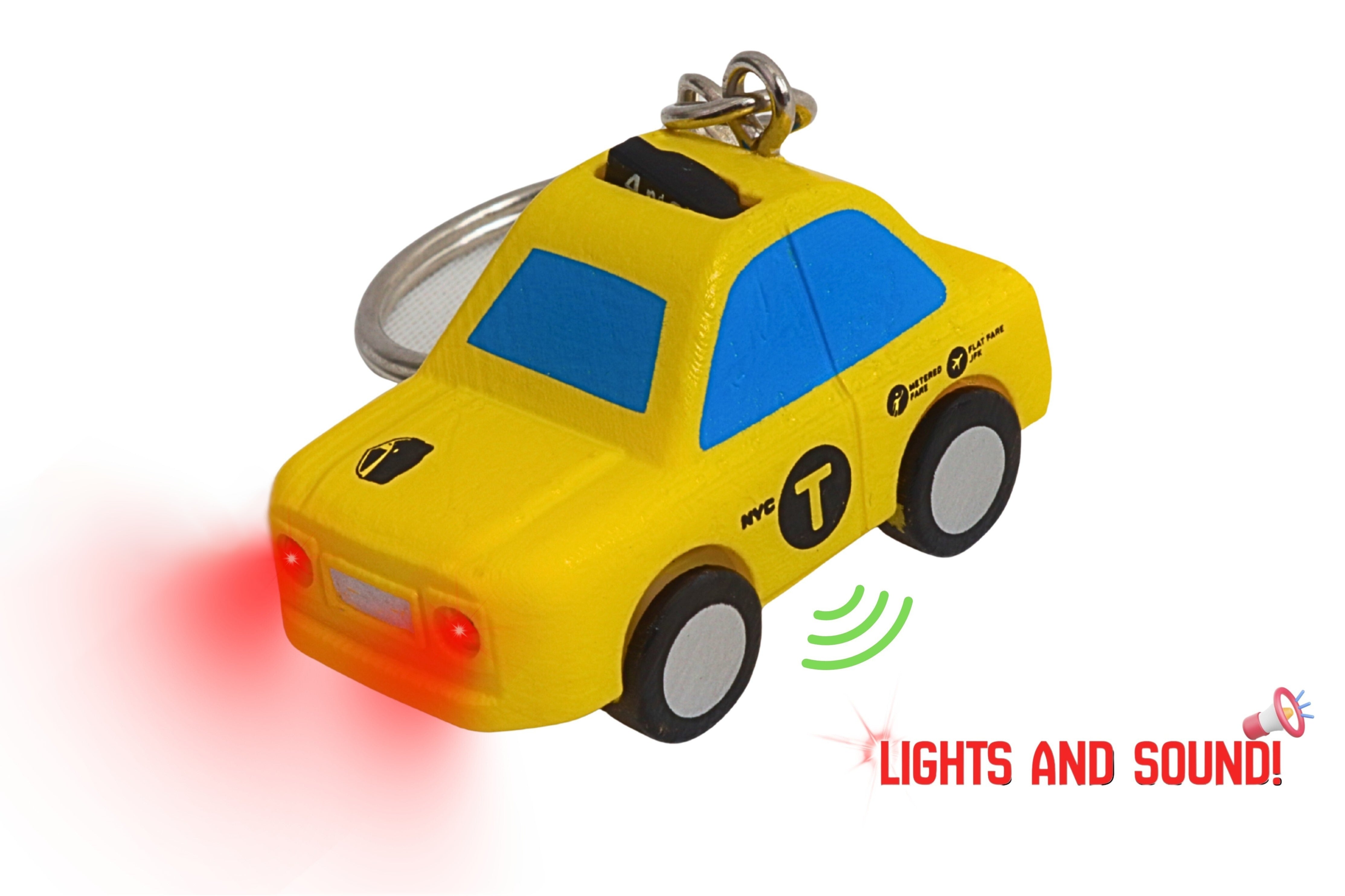 For fans of the iconic NYC Taxi, here's the perfect keepsake to take along wherever you go! Faithfully designed with the officially licensed NYC Taxi logo and authentic yellow color scheme, this keychain has a fun, chunky form that is easy to grasp, and best of all, it has special features. Just press the buttons to see the car light up and hear fun sounds! While the first taxi cabs of the early 1900s were painted red and green, it wasn't long before yellow became the norm. The wife of taxi company owner Albert Rockwell suggested he repaint his entire fleet yellow, and his company became so successful that he officially incorporated the Yellow Taxicab Company in 1912. In the late 1960s, the New York City Taxi and Limousine Commission helped establish a law requiring all "licensed medallion" taxis to be painted a specific shade of yellow. This alerted riders that the yellow taxis were regulated, supervised, and licensed to pick up anyone who hailed a cab. The specific shade of yellow officially matched the shade used for yellow school buses. Now, with this keychain, you can celebrate your favorite taxi company, the NYC Taxi, at any time or place! Recommended for ages 8+