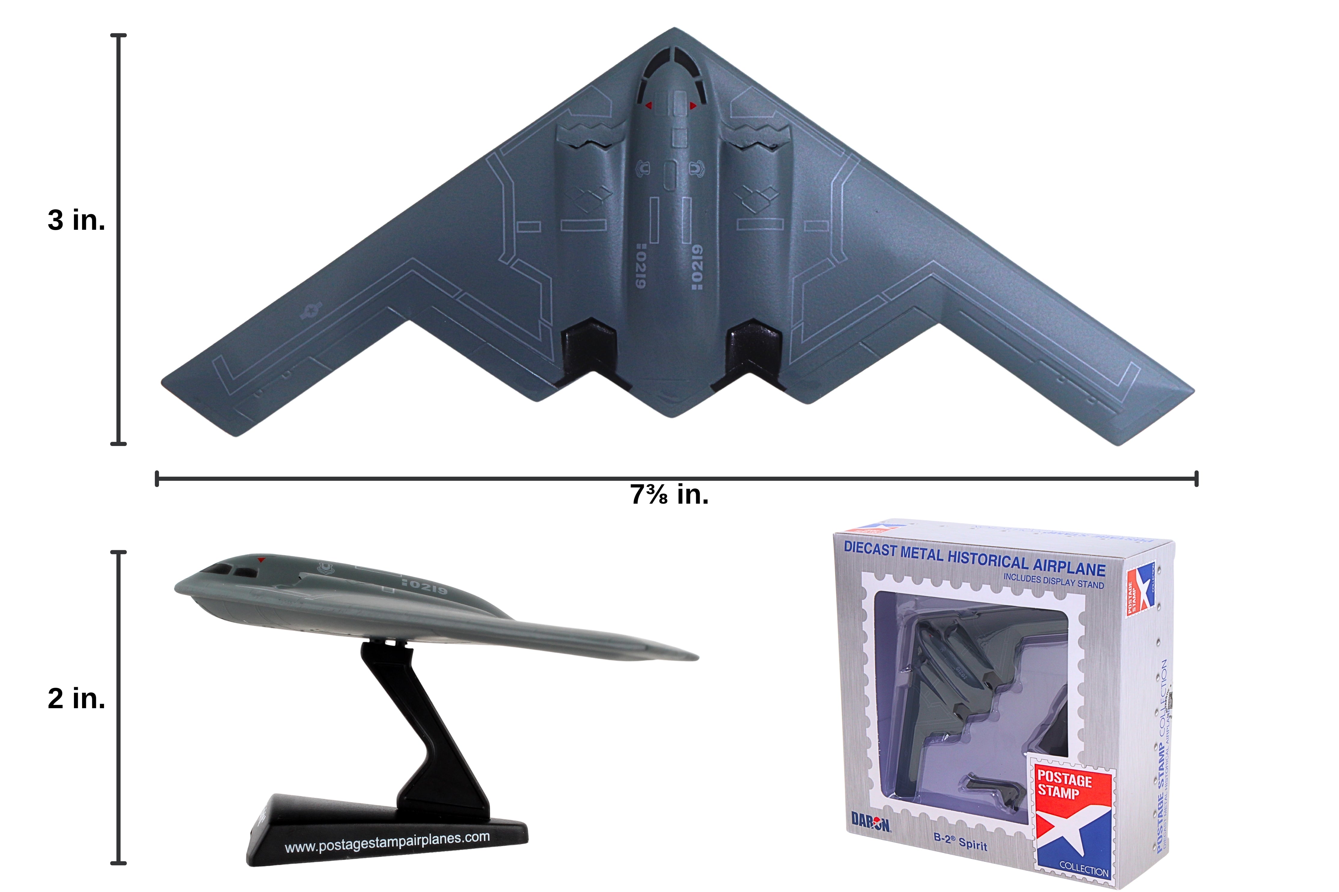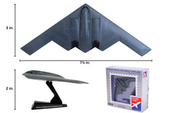 The B-2 Spirit was developed by the Air Force as a replacement for the aging B-52 bomber fleet. The boomerang shape and specialized paint of this long-range stealth bomber make it difficult to detect via radar and it is designed for strategic infiltration. It has a range of over 6,000 nautical miles. Armaments can include bombs, rotary launchers, and both nuclear and conventional means. It is the most expensive military aircraft ever produced with an approximate per unit cost of $2.4 Billion. This die-cast metal model comes in 1:280 scale with plastic stand and is approximately 3 inches long with 7 3/8 inch wingspan. Adult Collectible ages 14+