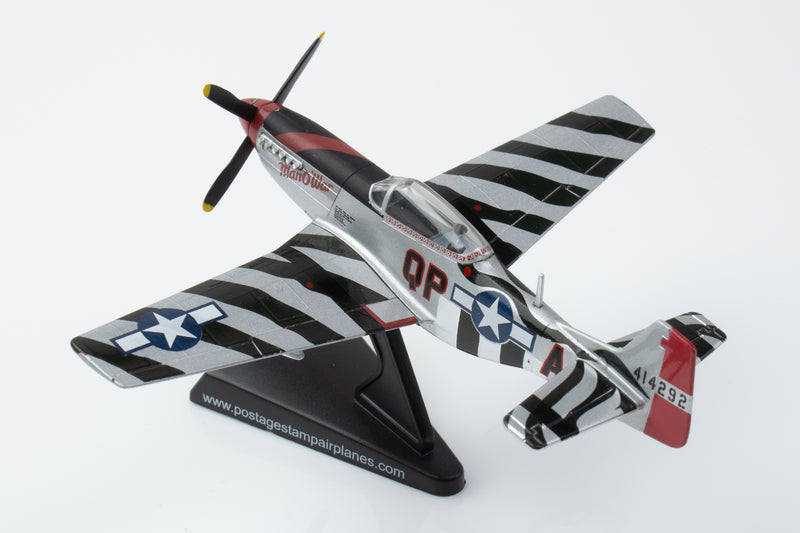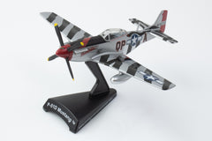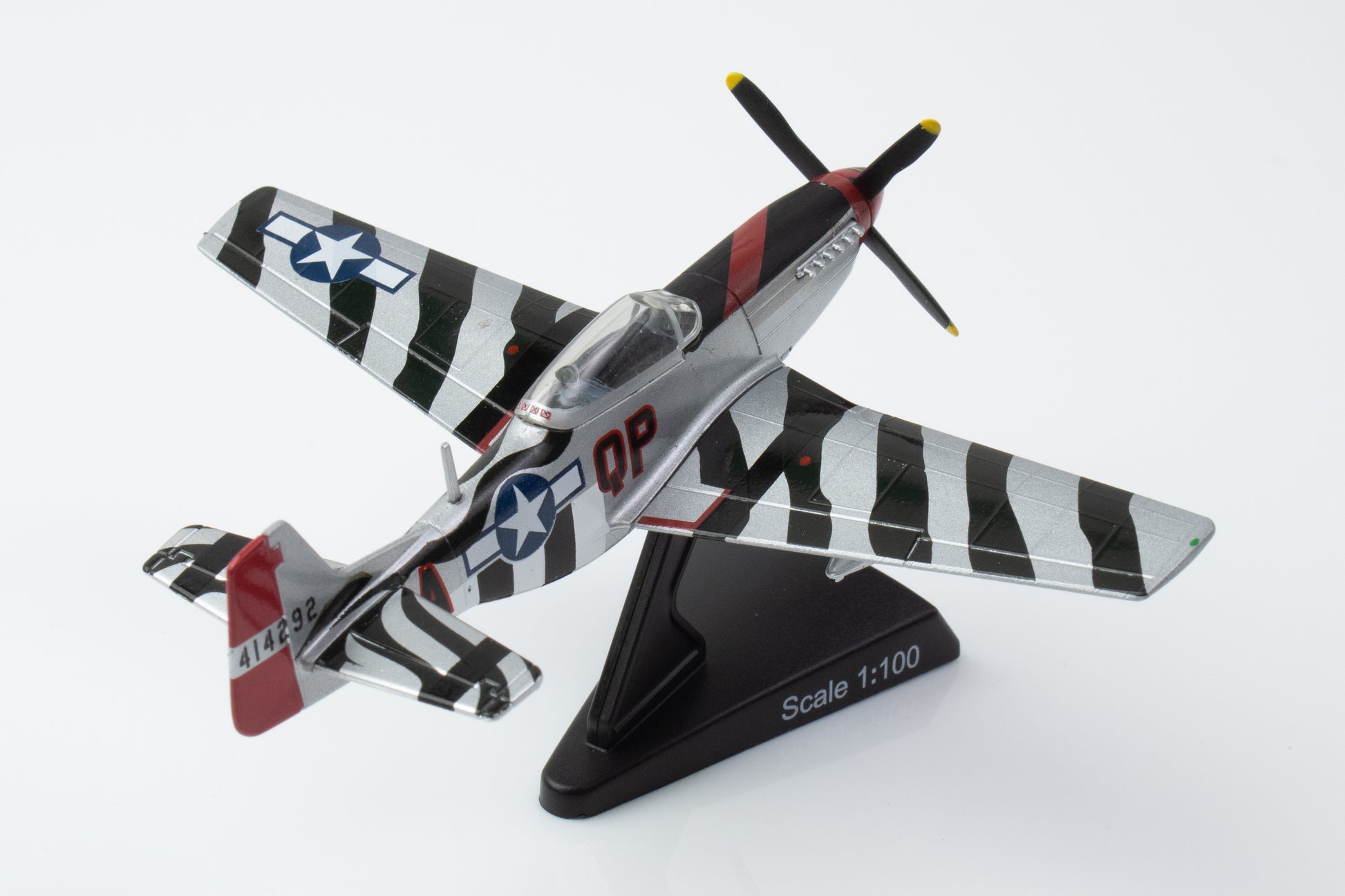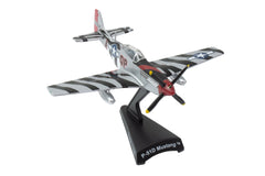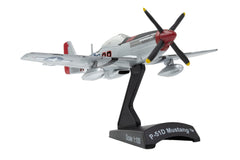 This die-cast metal airplane model of the P-51D Man O'War comes in 1:100 scale with plastic stand and is approximately 4 inches long with a 4 and 1/2 inch wingspan. This detailed replica features the official Air Force insignia, and recreates the authentic striped wings, red nose, and famous "red tail." For Adult Collectors ages 14+. The Man O'War was capable of carrying a single pilot, was equipped with machine guns, rockets, and bombs, had a maximum speed of 440 mph, and could reach heights of 41,900 feet. Though it was shipped to England during World War II, it never saw combat there. However, it was put to use by the New Jersey National Guard and US Air Force during the Korean War. P-51D Man O'War was the final variant of the famous P-51D Mustangs, which had operated as bomber escorts in World War II. It ended up being featured in the 1957 film, BATTLE HYMN and is currently flown at air shows across America by Commemorative Air Force, out of the Palm Springs Air Museum. This Die-cast Metal airplane model comes in 1:100 scale with plastic stand and model is approximately 4 inches long with 4 1/2 inch wingspan. Adult collectible 14+