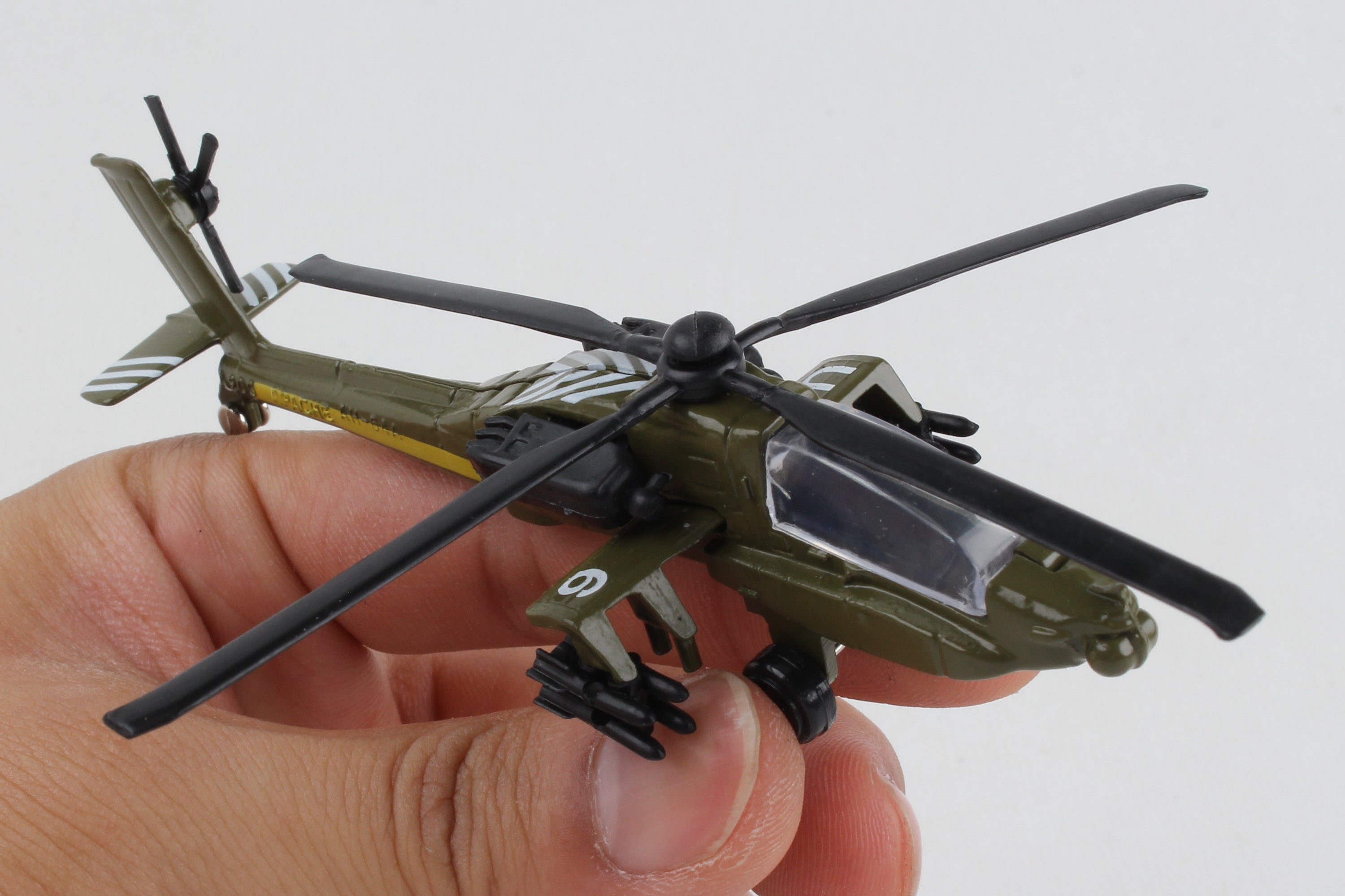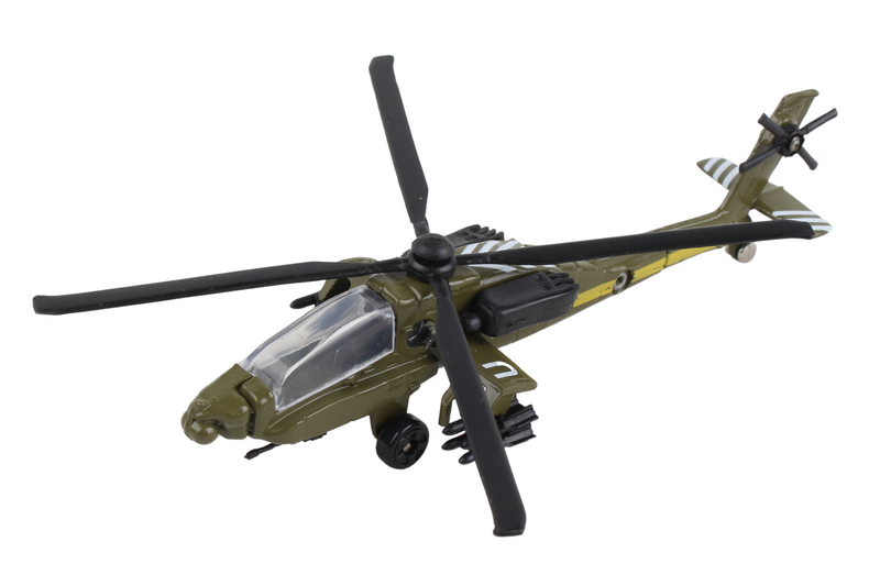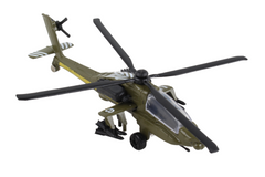 This die-cast Helicopter comes with a foam rubber helipad. Item is approximately 4 inches long, 1 1/2 inches wide, 1 1/4 inches tall with 4 1/8 inch rotorspan. Helipad is 7 1/4 inches long, 4 inches wide and 1/4 inch thick. Ages 3+