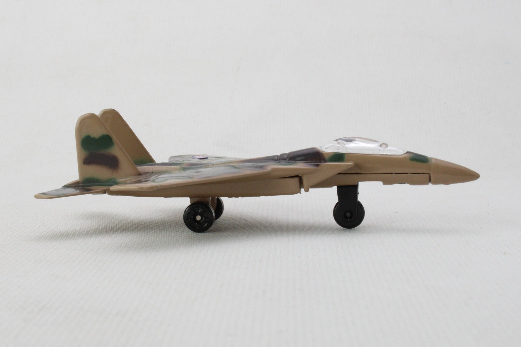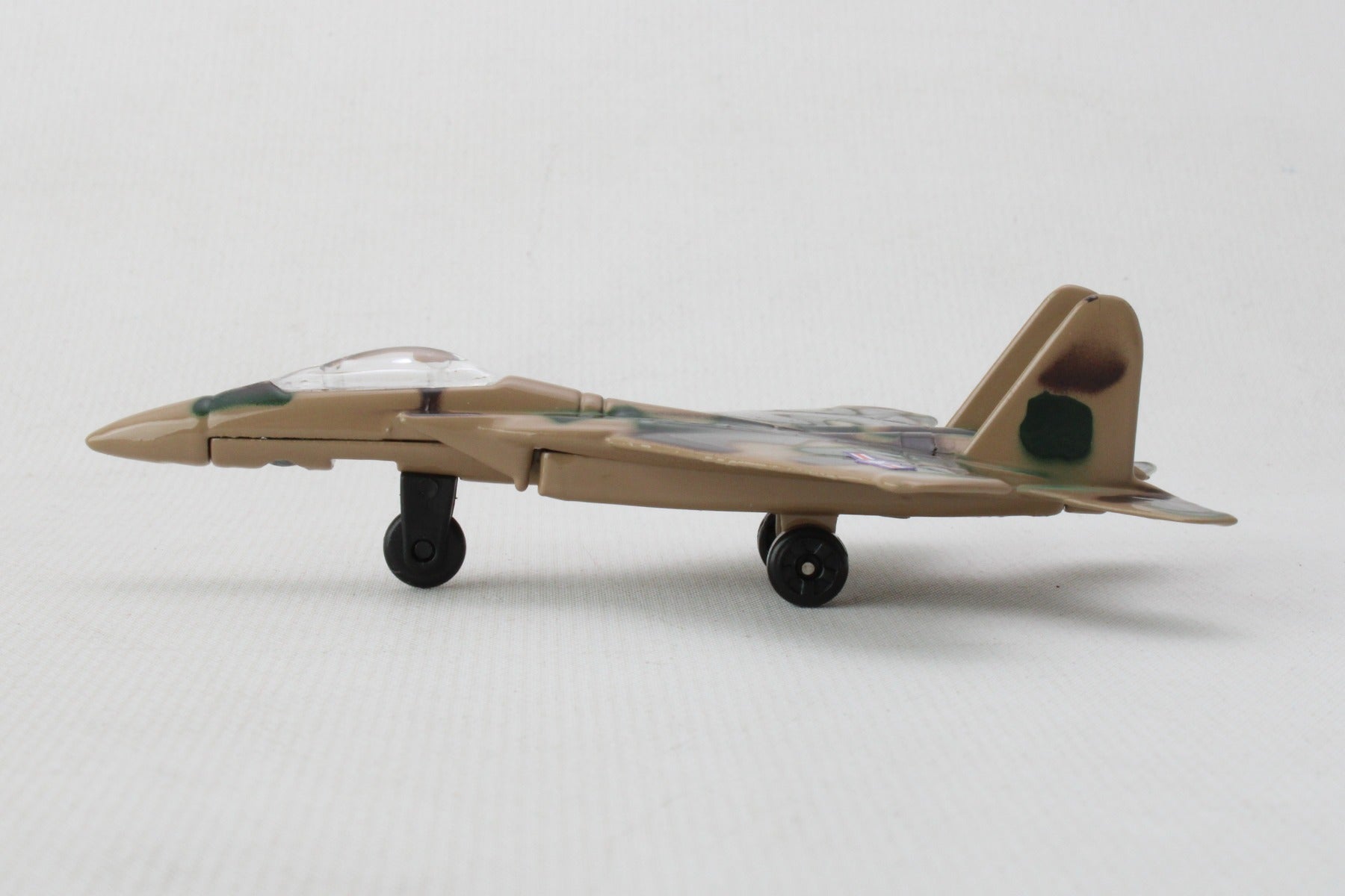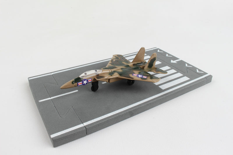 This die-cast metal model airplane comes with a foam rubber runway. Item is approximately 4 1/4 inches long, 2 7/8 inch wingspan, and 1 inch tall. Runway is 7 1/4 inches long, 4 inches wide and 1/4 inch thick. Ages 3+