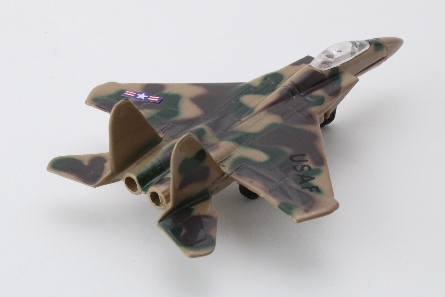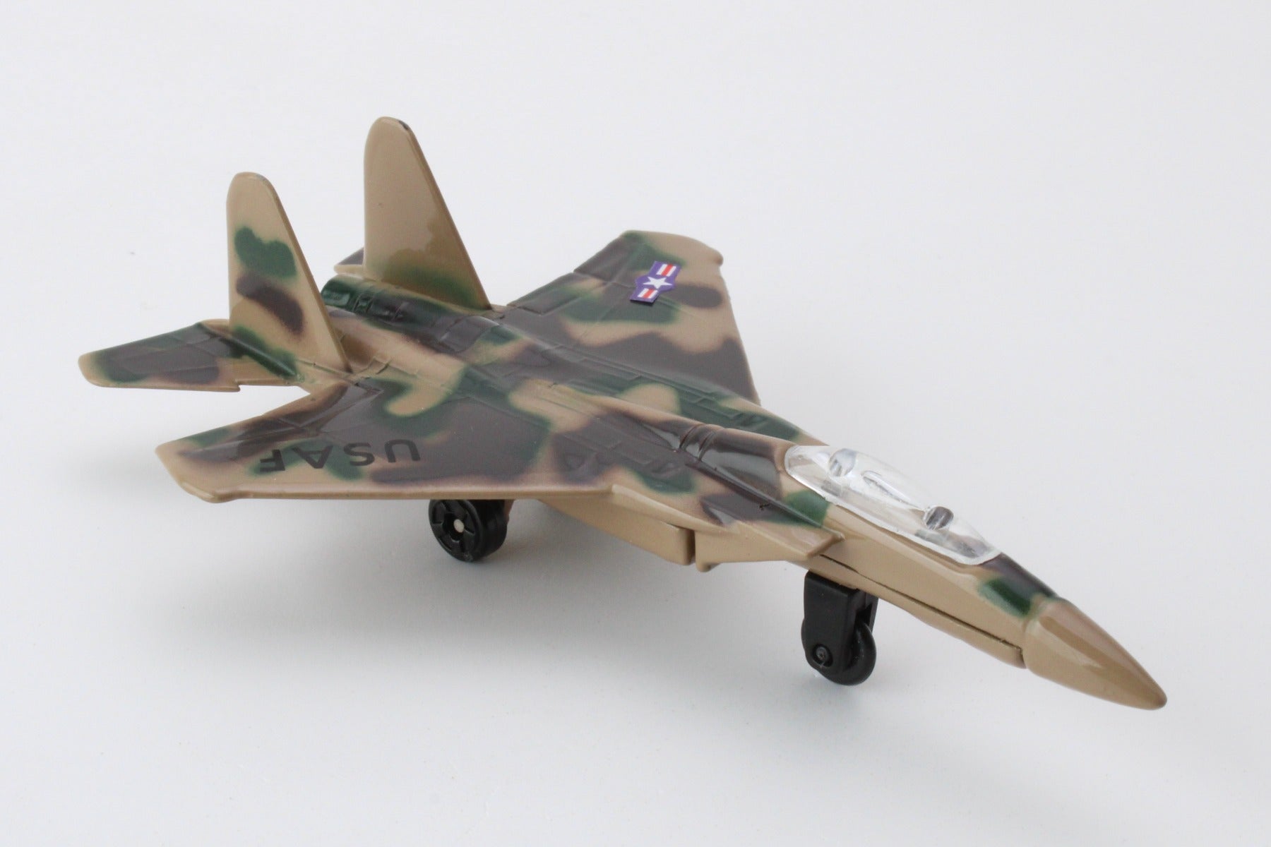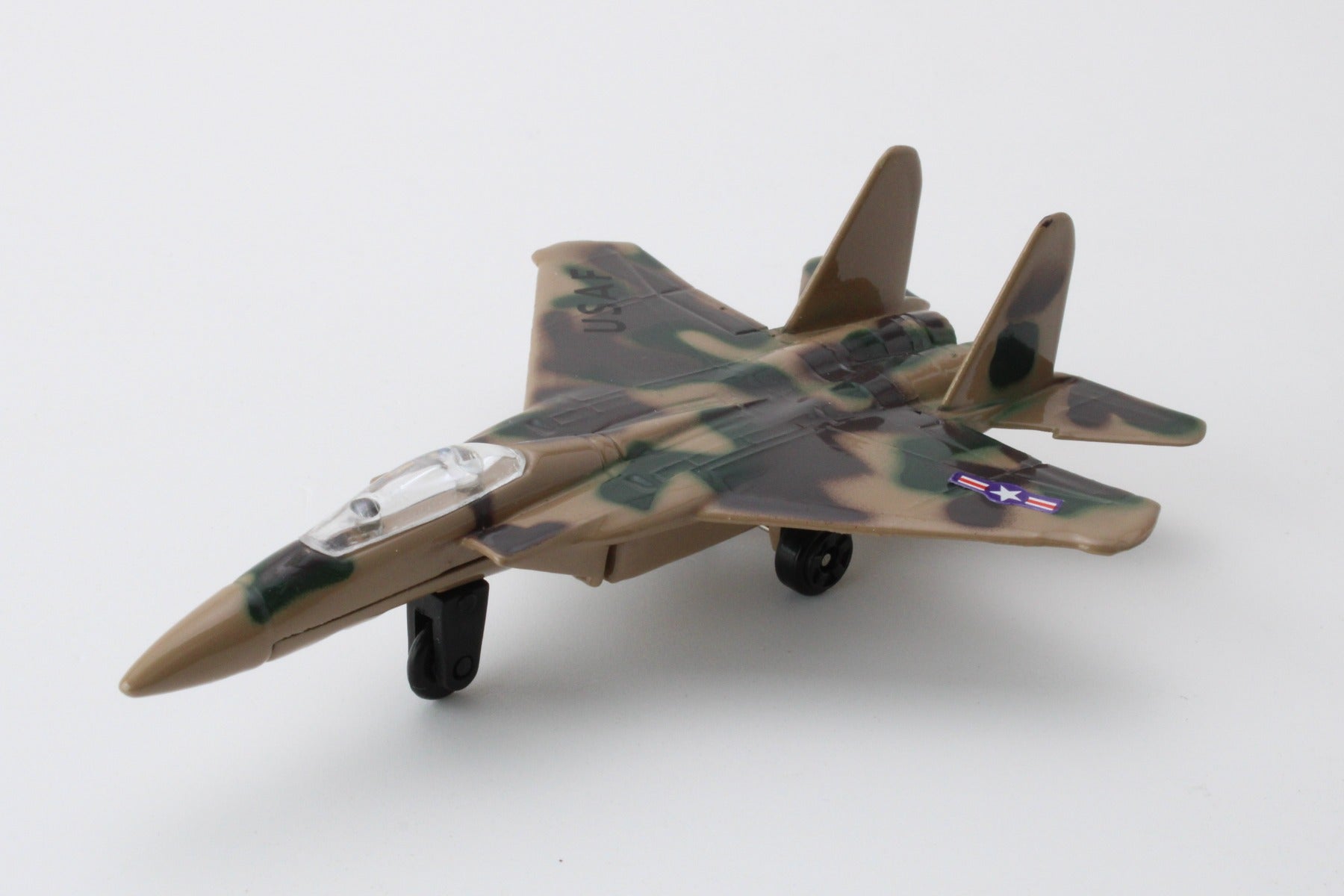 This die-cast metal model airplane comes with a foam rubber runway. Item is approximately 4 1/4 inches long, 2 7/8 inch wingspan, and 1 inch tall. Runway is 7 1/4 inches long, 4 inches wide and 1/4 inch thick. Ages 3+