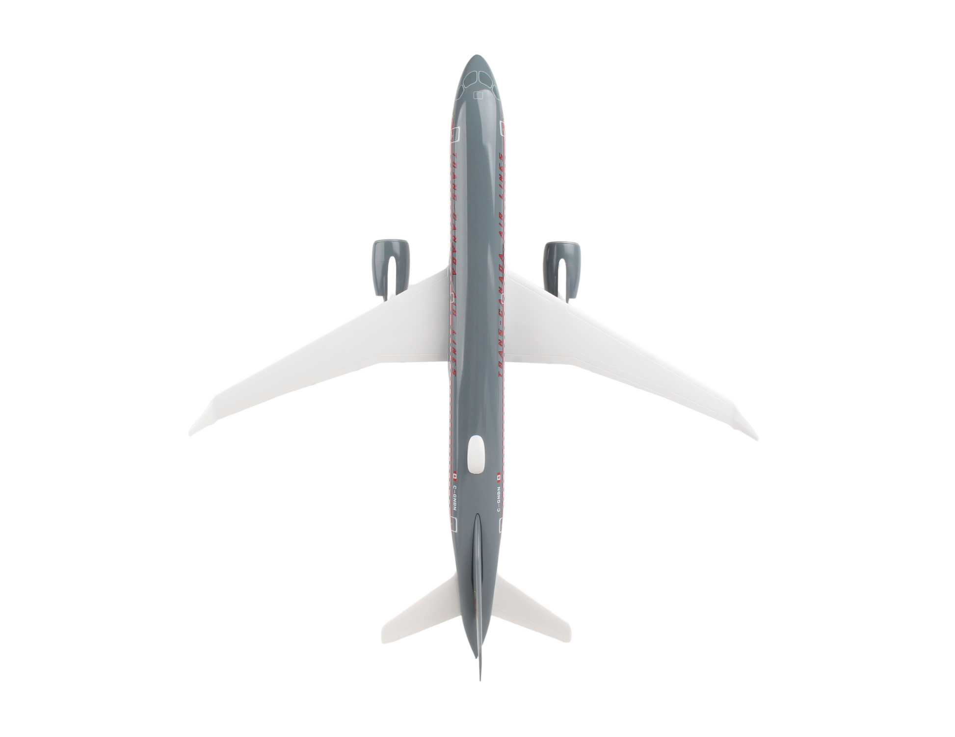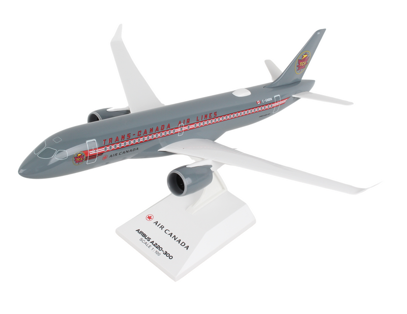 Comprising superior quality, solid, substantial injection molded plastic components with a simple snap-fit design that allows for easy assembly without the need for glue, this SkyMarks 1/100 Scale Air Canada Airbus A220-300 - Registration C-GNBN - featured in its stunning, muted gray retro TCA Trans-Canada Air Lines Livery - measures approximately 15-1/16-inches long with a 13-5/8-inch wingspan and comes complete with a Display Stand. Founded in 1937, Trans-Canada Air Lines was recognized as the former flag carrier of Canada until 1965, when the airline was renamed Air Canada. The Airbus A220-300, which went into service at the end of 2016 and is larger than the initially introduced Airbus A220-100, is a modern, technologically advanced aircraft that was developed to fly 120-160 passengers up to 3,400 nautical miles in quiet comfort to different points that were either not feasible for several reasons or simply not profitable for the airlines. Recognized by airlines for its efficiency and economical operating costs, the Airbus A220-300, which is nearly identical to the Airbus A220-100 variant in almost all respects, enables airlines to cost effectively fly both versions while allowing pilots and flight crews to easily transition from one model to the other. According to Airbus, even though the Airbus A220 Family is the smallest jetliner in Airbus' commercial aircraft product line, not only does it offer unbeatable comfort, with its large seats, ample storage space and large windows, it is a single aisle aircraft that feels like a widebody jet.