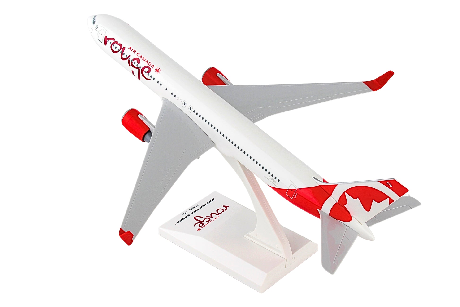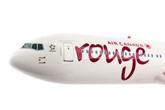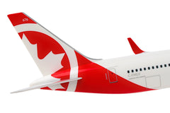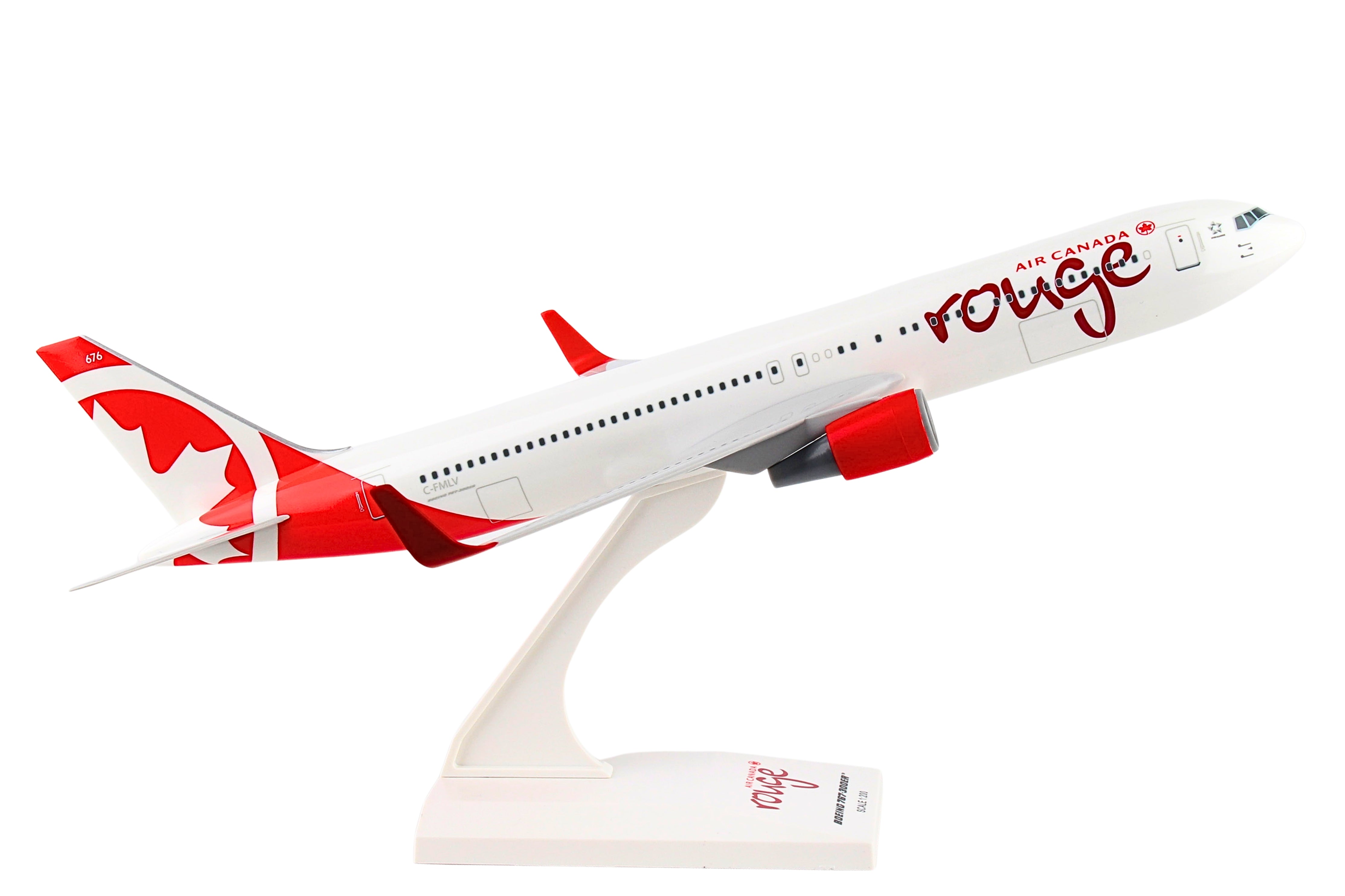 Comprising superior quality, substantial, solid injection molded plastic components with a simple snap-fit design that allows for easy assembly without the need for glue, this SkyMarks 1/200 Scale Air Canada Rouge Boeing 767-300 - with Registration C-FMLV - measures approximately 10-15/16-inches long with a 9-11/16-inch wingspan and comes complete with a Display Stand. An accurate, true-to-scale reproduction of the actual aircraft, this Air Canada Rouge Boeing 767-300, which is manufactured as an officially licensed product, is great for collectors and features authentic, highly detailed graphics and markings. The wide-body, twin-engine Boeing 767 jetliner was introduced by the company to complement its larger Boeing 747 by serving specific markets that were not practical or could not be served by the bigger plane. The Boeing 767 enabled seven abreast cross seating and featured Boeing's first two-crew glass cockpit, which was jointly developed for the 757, not only permitting a common pilot type rating, it also did away with the necessity for a flight engineer, forever changing the architecture of the cockpit. Having entered service in September 1982 with United Airlines as the launch customer for the Boeing 767-200, Boeing subsequently released five further variants of the 767, including the extended range 767-200ER in 1984, the stretched 767-300 in 1986, and the extended range 767-300ER in 1988, which was the most popular variant of the line. Boeing then introduced its first freighter version of the 767 in 1995, the 767-300F followed by the 767-400ER, a second stretched passenger version of the aircraft that was released in 2000. Manufactured from 1986 until 2000, with a total of 104 aircraft having been produced, the expanded Boeing 767-300 has been utilized extensively on high-density routes in Asia and Europe.