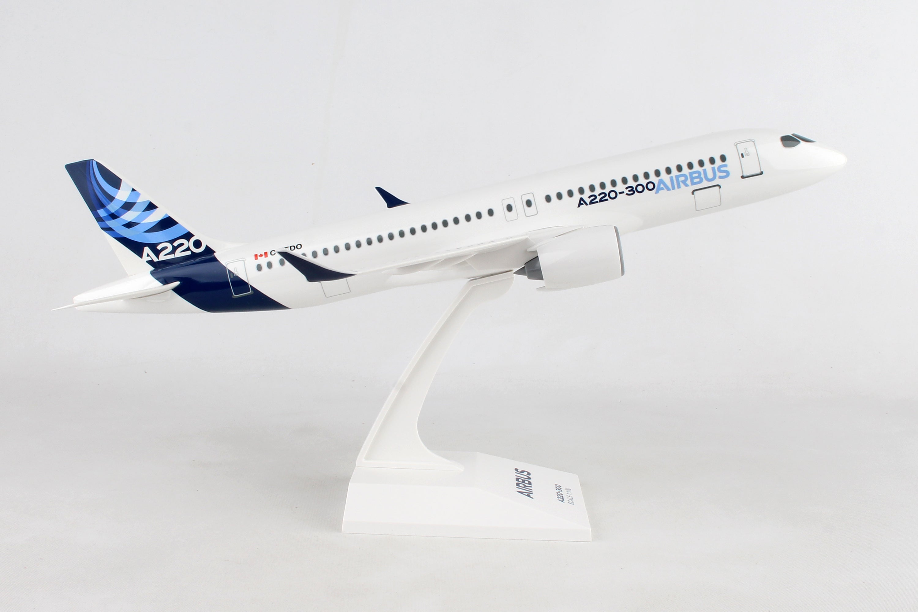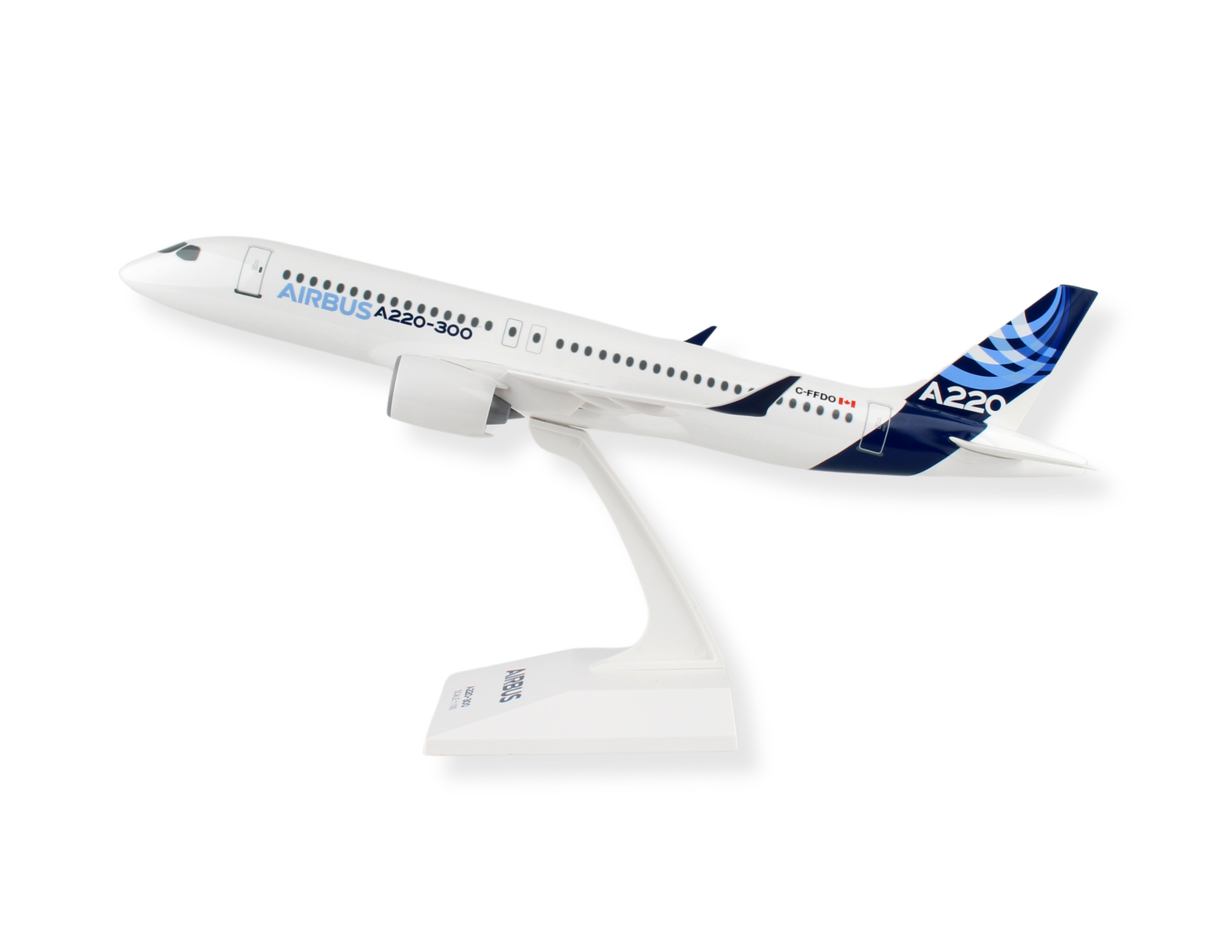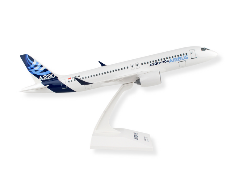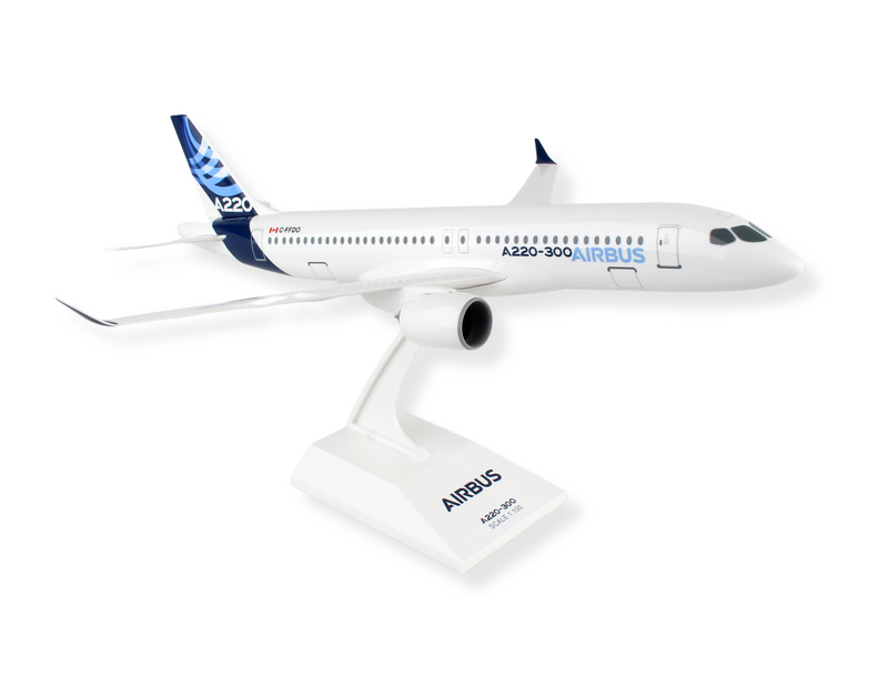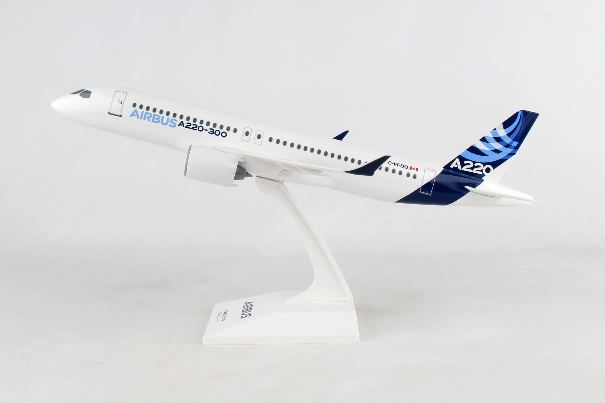 Comprising superior quality, solid, substantial injection molded plastic components with a simple snap-fit design that allows for easy assembly without the need for glue, this SkyMarks 1/100 Scale Airbus House Colors A220-300 - Registration C-FFDO - measures approximately 15-1/16-inches long with a 13-5/8-inch wingspan and comes complete with a Display Stand. An accurate, true-to-scale reproduction of the actual aircraft, the model is great for collectors and features authentic, highly detailed graphics and markings. The Airbus A220-300, which went into service at the end of 2016 and is larger than the initially introduced Airbus A220-100, is a modern, technologically advanced aircraft that was developed to fly 120-160 passengers up to 3,400 nautical miles in quiet comfort to different points that were either not feasible for several reasons or simply not profitable for the airlines. Recognized by airlines for its efficiency and economical operating costs, the Airbus A220-300, which is nearly identical to the Airbus A220-100 variant in almost all respects, enables airlines to cost effectively fly both versions while allowing pilots and flight crews to easily transition from one model to the other. According to Airbus, even though the Airbus A220 Family is the smallest jetliner in Airbus' commercial aircraft product line, not only does it offer unbeatable comfort, with its large seats, ample storage space and large windows, it is a single aisle aircraft that feels like a widebody jet.