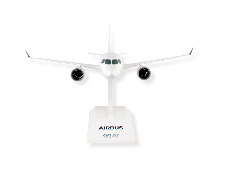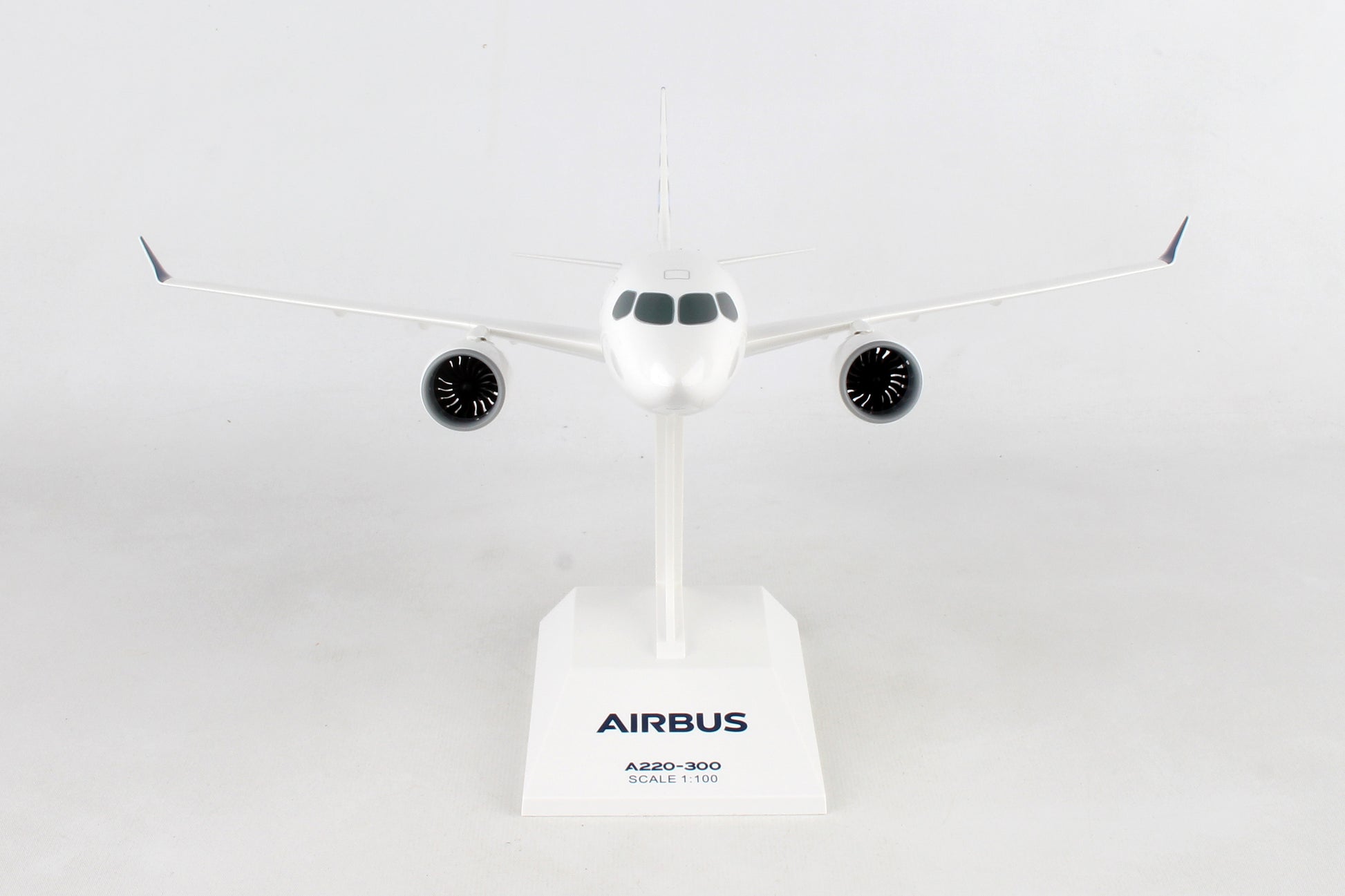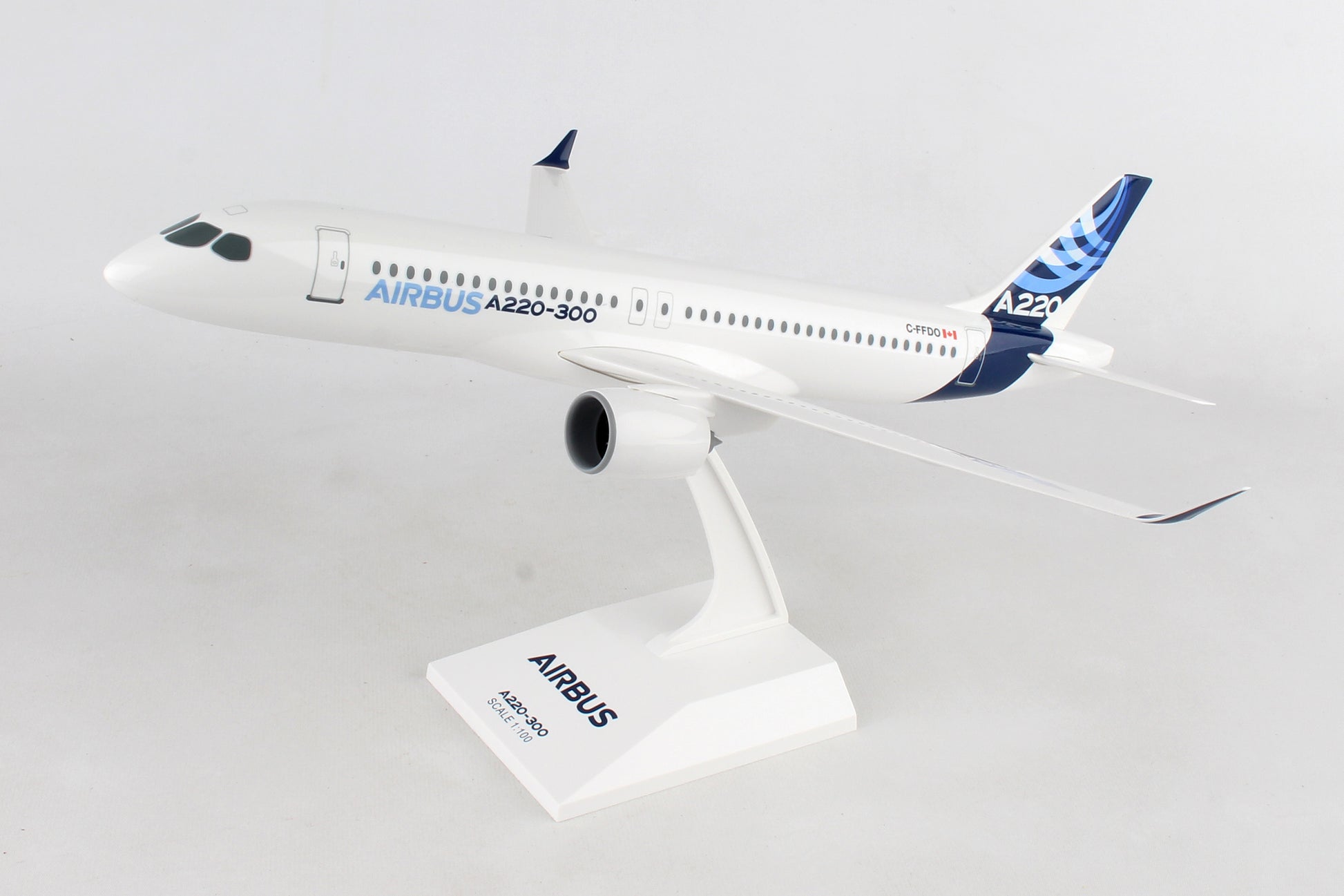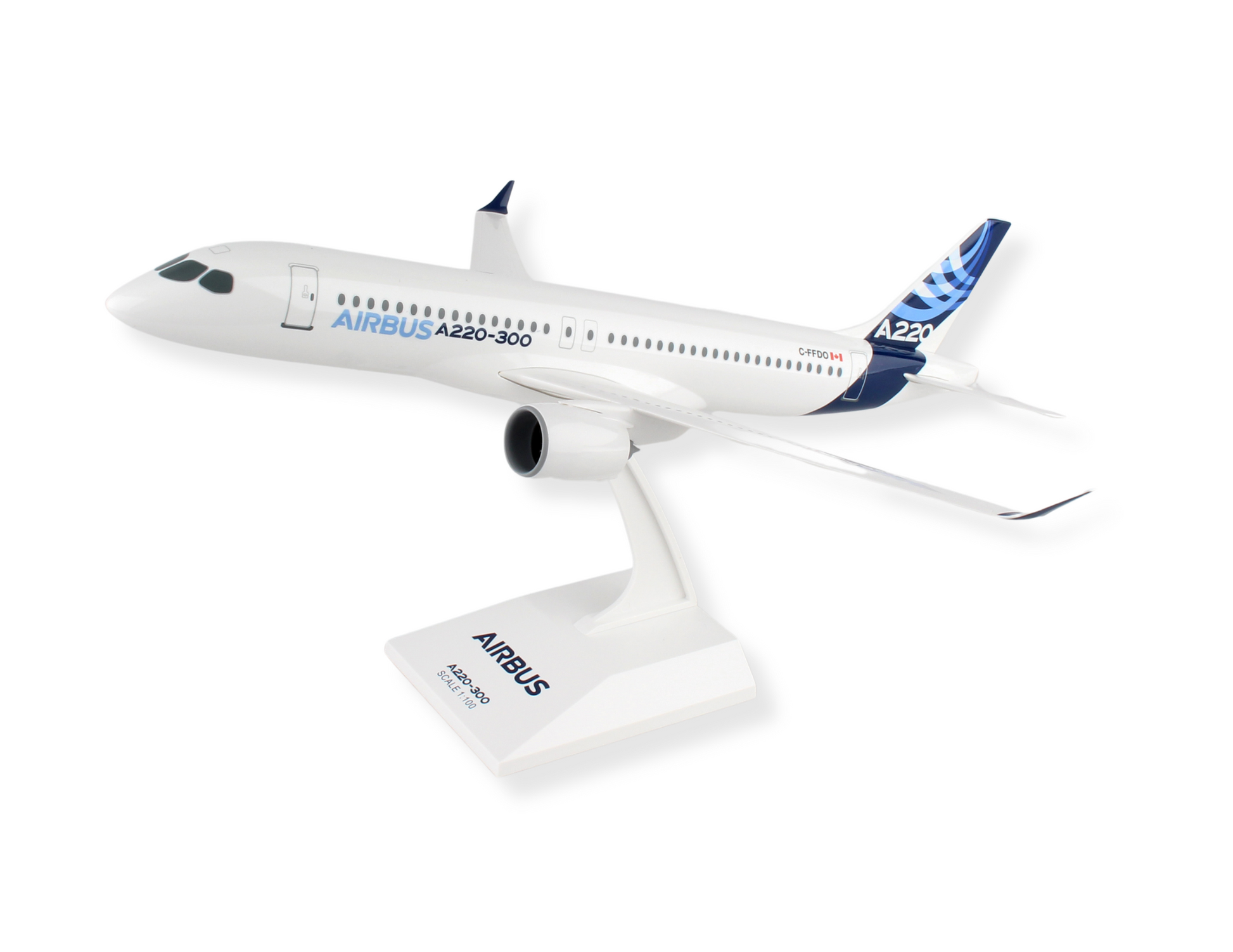 Comprising superior quality, solid, substantial injection molded plastic components with a simple snap-fit design that allows for easy assembly without the need for glue, this SkyMarks 1/100 Scale Airbus House Colors A220-300 - Registration C-FFDO - measures approximately 15-1/16-inches long with a 13-5/8-inch wingspan and comes complete with a Display Stand. An accurate, true-to-scale reproduction of the actual aircraft, the model is great for collectors and features authentic, highly detailed graphics and markings. The Airbus A220-300, which went into service at the end of 2016 and is larger than the initially introduced Airbus A220-100, is a modern, technologically advanced aircraft that was developed to fly 120-160 passengers up to 3,400 nautical miles in quiet comfort to different points that were either not feasible for several reasons or simply not profitable for the airlines. Recognized by airlines for its efficiency and economical operating costs, the Airbus A220-300, which is nearly identical to the Airbus A220-100 variant in almost all respects, enables airlines to cost effectively fly both versions while allowing pilots and flight crews to easily transition from one model to the other. According to Airbus, even though the Airbus A220 Family is the smallest jetliner in Airbus' commercial aircraft product line, not only does it offer unbeatable comfort, with its large seats, ample storage space and large windows, it is a single aisle aircraft that feels like a widebody jet.