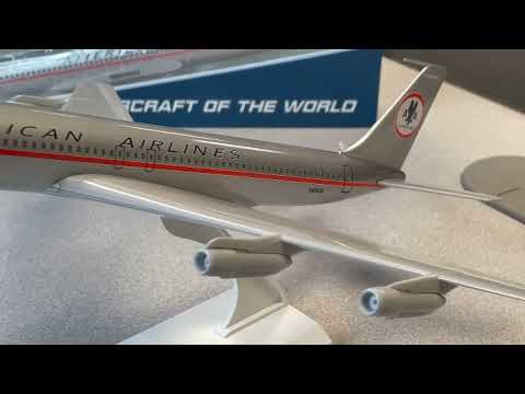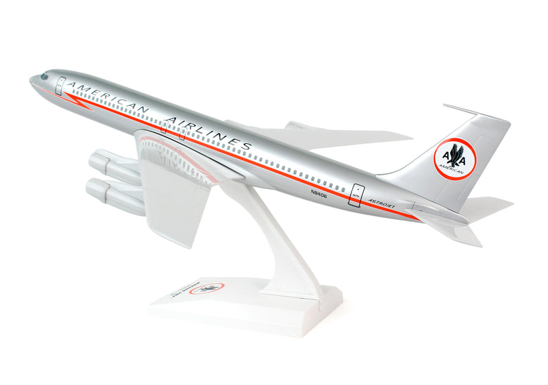 Comprising superior quality, solid injection molded plastic components with a simple snap-fit design that allows for easy assembly without the need for glue, SkyMarks 1/150 Scale American Airlines Boeing 707 measures approximately 12-inches long with an 11-inch wingspan and comes complete with a Display Stand. An accurate, true-to-scale reproduction of the actual aircraft, the model is great for collectors and features authentic, highly detailed graphics and markings. American Airlines flew the Boeing 707 from 1959 until 1979, which it launched on its Los Angeles to New York route as the first scheduled nonstop transcontinental jetliner service operated by any airline. The Boeing 707 was developed as a long range, intercontinental, narrow body aircraft that could carry approximately 200-passengers, and has not only been credited with having initiated the jet age, it was also the most popular jetliner of its time.