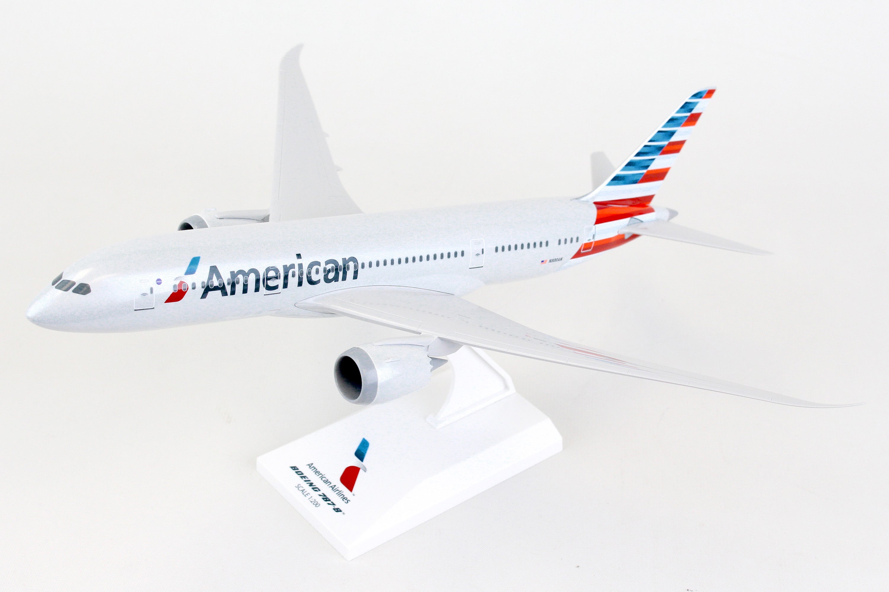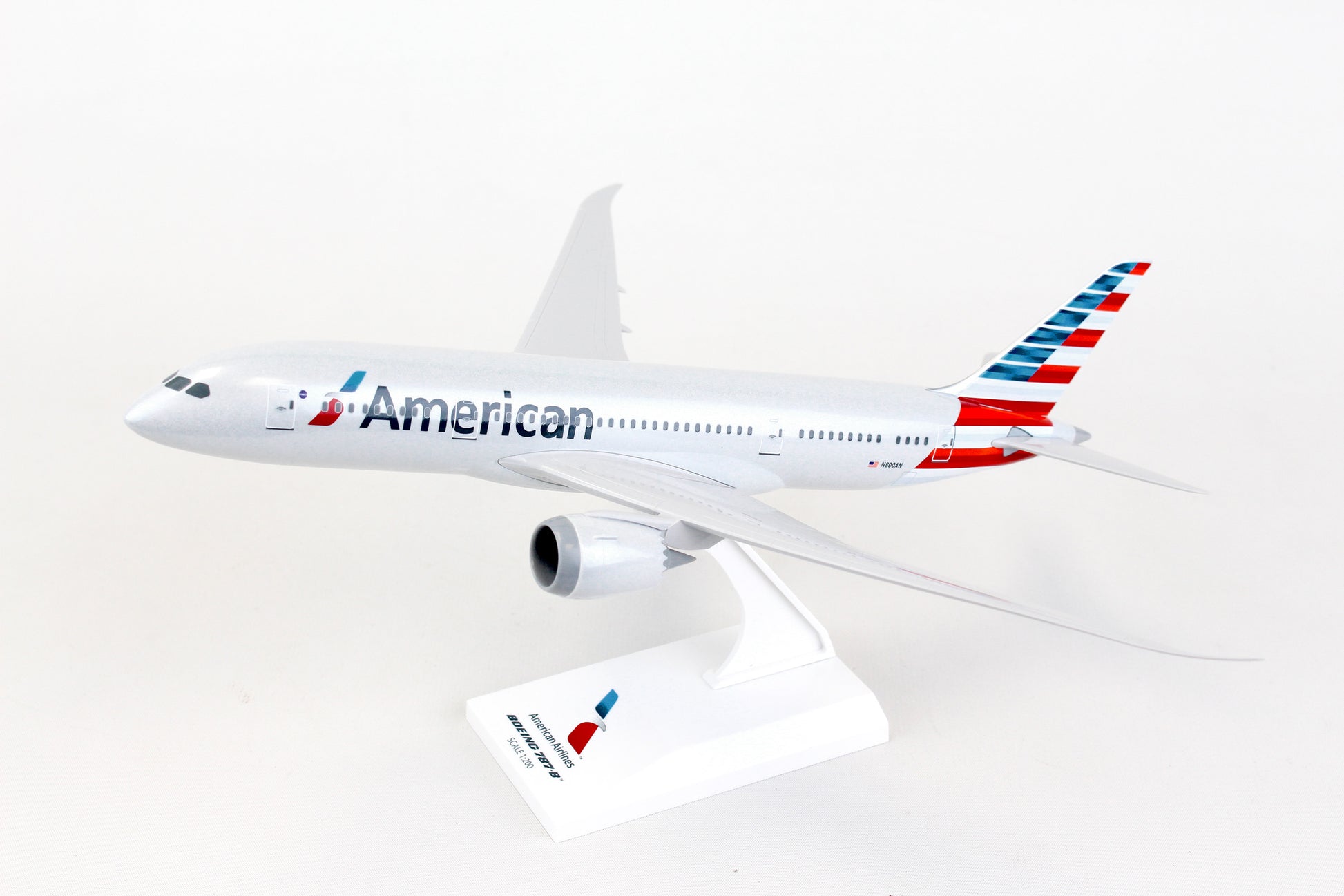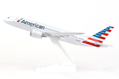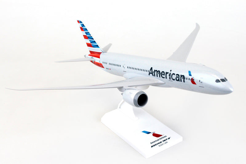 Comprising superior quality, solid, substantial injection molded plastic components with a simple snap-fit design that allows for easy assembly without the need for glue, SkyMarks 1/200 Scale American Airlines Boeing 787-8 Dreamliner measures approximately 11-inches long with a 12-1/8-inch wingspan and comes complete with a Display Stand. An accurate, true-to-scale reproduction of the actual aircraft, the model is great for collectors and features authentic, highly detailed graphics and markings. Having entered service in 2011 as a more fuel-efficient, environmentally friendly replacement aircraft for the aging Boeing 767-200ER, the innovative, twin-engine, wide-body Boeing 787-8, which was Boeing's introductory model in the 787 series, was deemed to be an ideal size to accommodate approximately 250 passengers, as market demand for the Boeing 747 and 767 had begun to slow down. With a range of nearly 7,400 nautical miles, the Boeing 787-8 was designed to shift hub-and-spoke travel to new, non-stop, ultra-long-haul, direct point-to-point routes where bigger aircraft could not be accommodated or were financially justifiable. Recognized by its prominently curved wings with raked back wingtips and chevrons on its engine nacelles, the Boeing 787-8 not only provides maximum flying pleasure with a very spacious interior design, larger windows, lower cabin noise and improved oxygen levels, it comprises technologically advanced, state-of-the-art avionics and electronics systems along with an airframe that primarily consists of lightweight composite materials.
