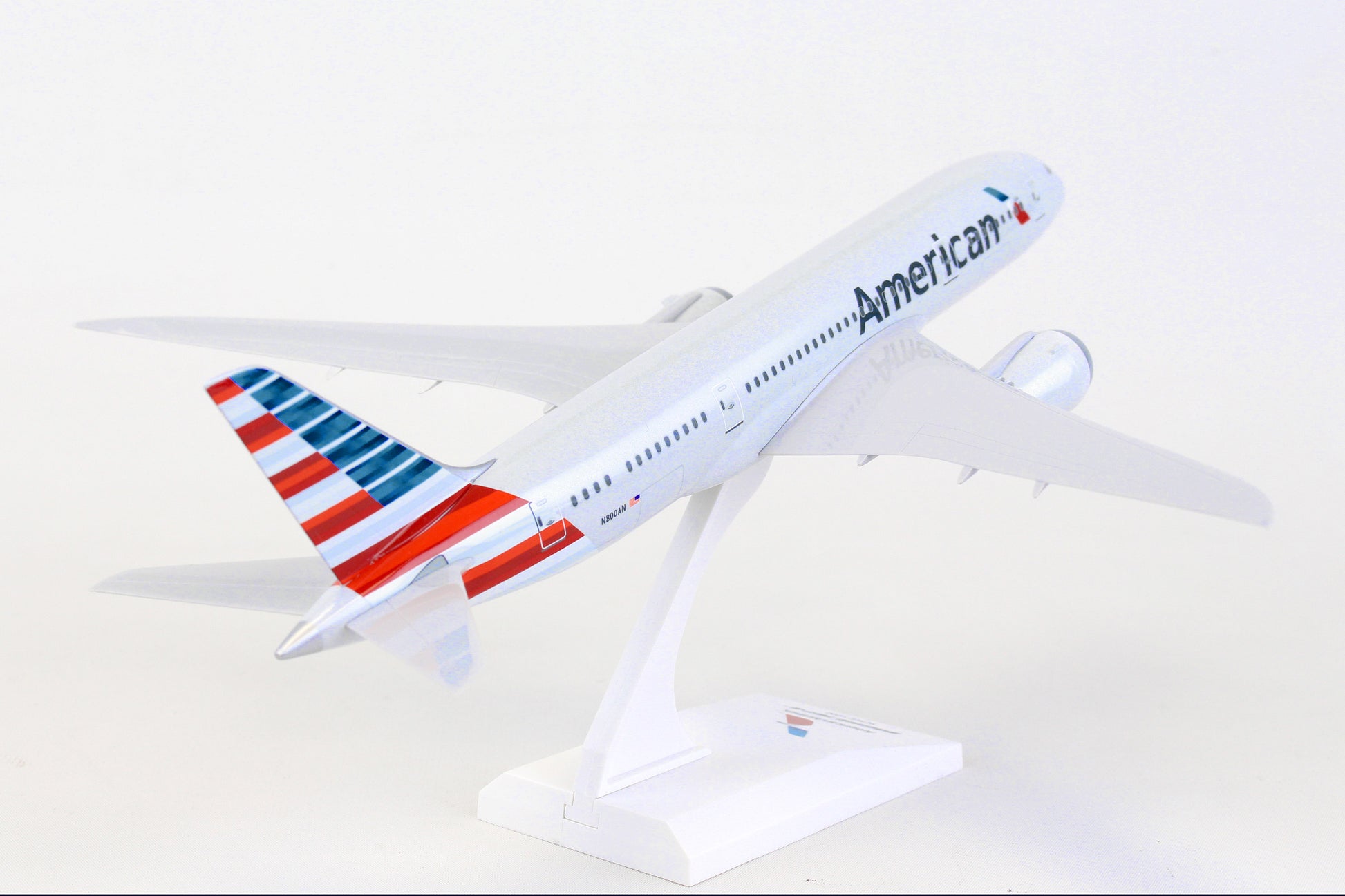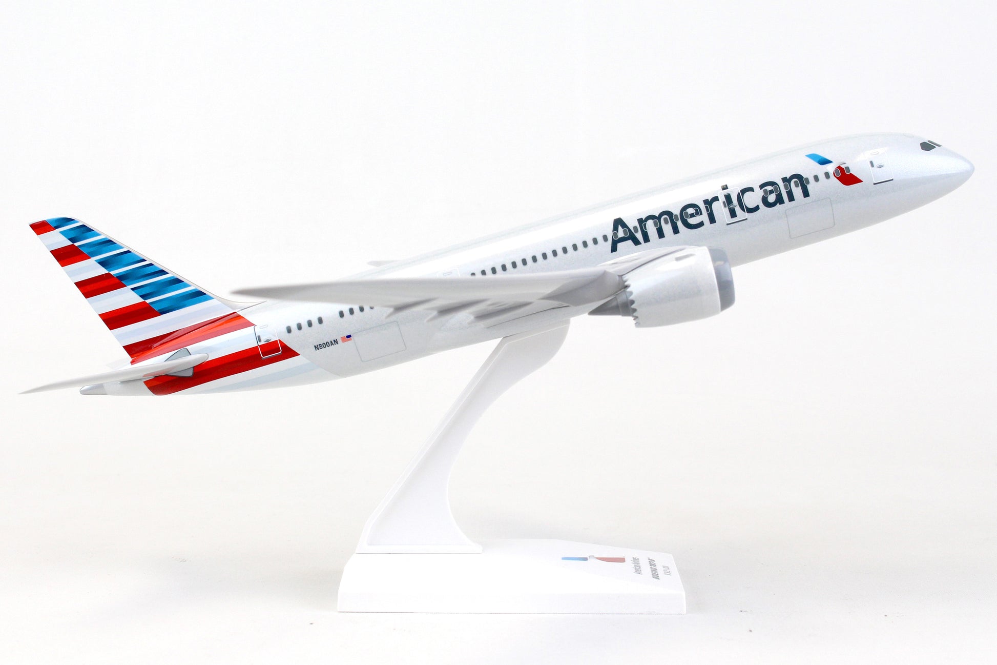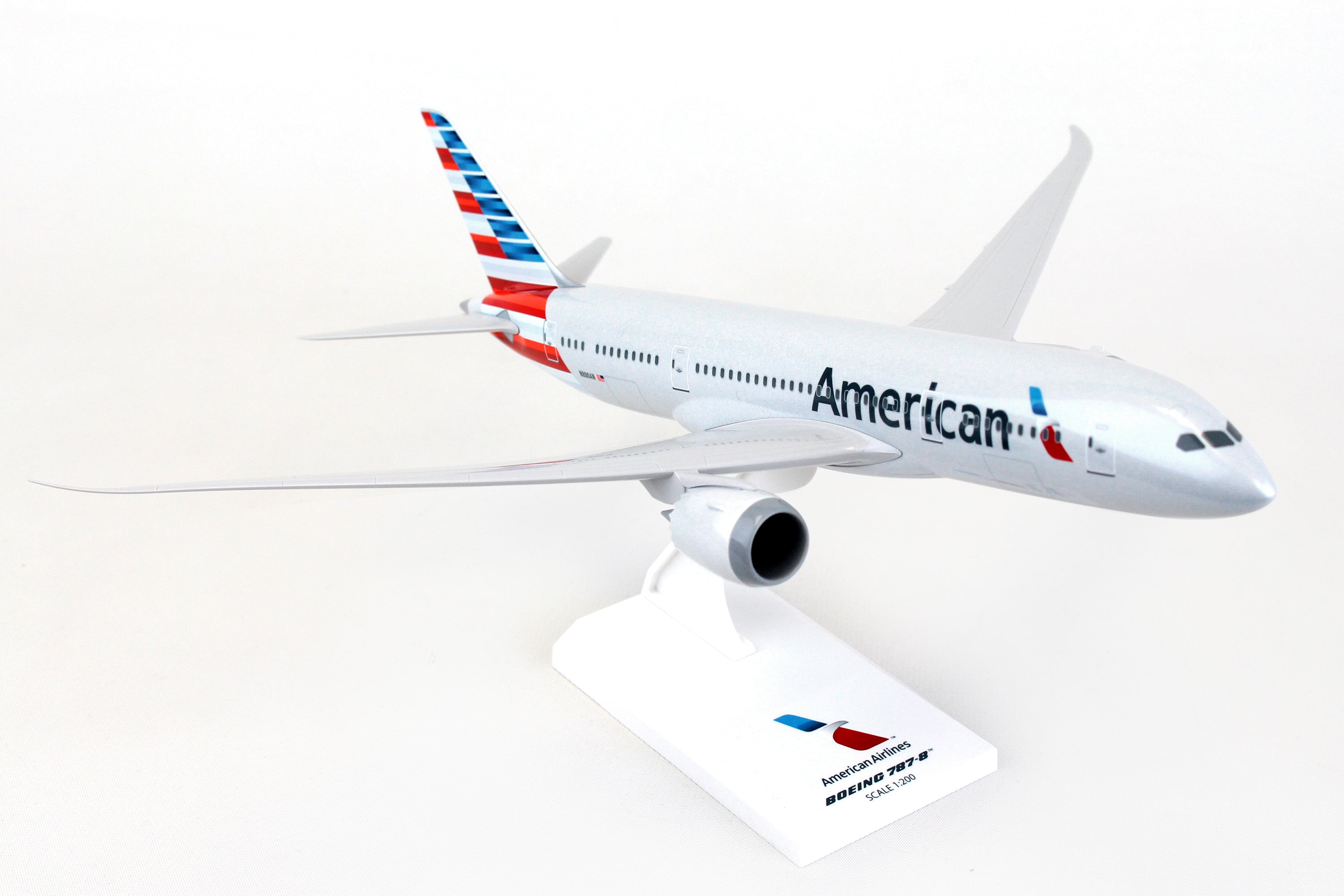 Comprising superior quality, solid, substantial injection molded plastic components with a simple snap-fit design that allows for easy assembly without the need for glue, SkyMarks 1/200 Scale American Airlines Boeing 787-8 Dreamliner measures approximately 11-inches long with a 12-1/8-inch wingspan and comes complete with a Display Stand. An accurate, true-to-scale reproduction of the actual aircraft, the model is great for collectors and features authentic, highly detailed graphics and markings. Having entered service in 2011 as a more fuel-efficient, environmentally friendly replacement aircraft for the aging Boeing 767-200ER, the innovative, twin-engine, wide-body Boeing 787-8, which was Boeing's introductory model in the 787 series, was deemed to be an ideal size to accommodate approximately 250 passengers, as market demand for the Boeing 747 and 767 had begun to slow down. With a range of nearly 7,400 nautical miles, the Boeing 787-8 was designed to shift hub-and-spoke travel to new, non-stop, ultra-long-haul, direct point-to-point routes where bigger aircraft could not be accommodated or were financially justifiable. Recognized by its prominently curved wings with raked back wingtips and chevrons on its engine nacelles, the Boeing 787-8 not only provides maximum flying pleasure with a very spacious interior design, larger windows, lower cabin noise and improved oxygen levels, it comprises technologically advanced, state-of-the-art avionics and electronics systems along with an airframe that primarily consists of lightweight composite materials.