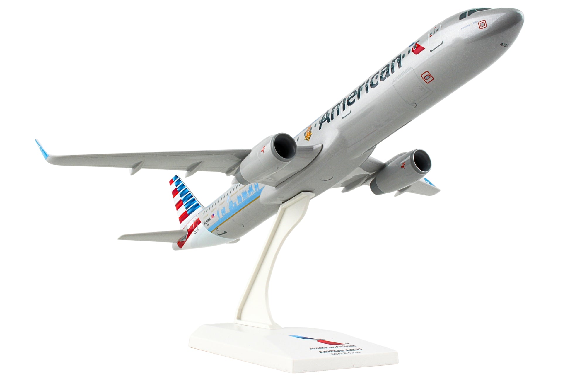 Comprising superior quality, substantial, solid injection molded plastic components with a simple snap-fit design that allows for easy assembly without the need for glue, this SkyMarks 1/150 Scale American Airlines Airbus A321 - painted in its "Medal of Honor" livery - with Registration N167AN - measures approximately 11-5/8-inches long with a 9-5/8-inch wingspan and comes complete with a Display Stand. An accurate, true-to-scale reproduction of the actual aircraft, this American Airlines Airbus A321, which is manufactured as an officially licensed product, is great for collectors and features authentic, highly detailed graphics and markings. A derivative of the Airbus A320 with a stretched fuselage, the Airbus A321, which went into service in 1994, is a narrow body, short to medium range commercial jet that can be configured to typically carry 185 to 236 passengers. To give the Airbus A321 full-transcontinental range with maximum passenger capacity, Airbus began development of the next version of its A321 in 1995, the A321-200, that went into service in 1997 as a larger and heavier aircraft than the earlier A321 with minor structural strengthening modifications, higher thrust engines, and additional fuel tanks.
