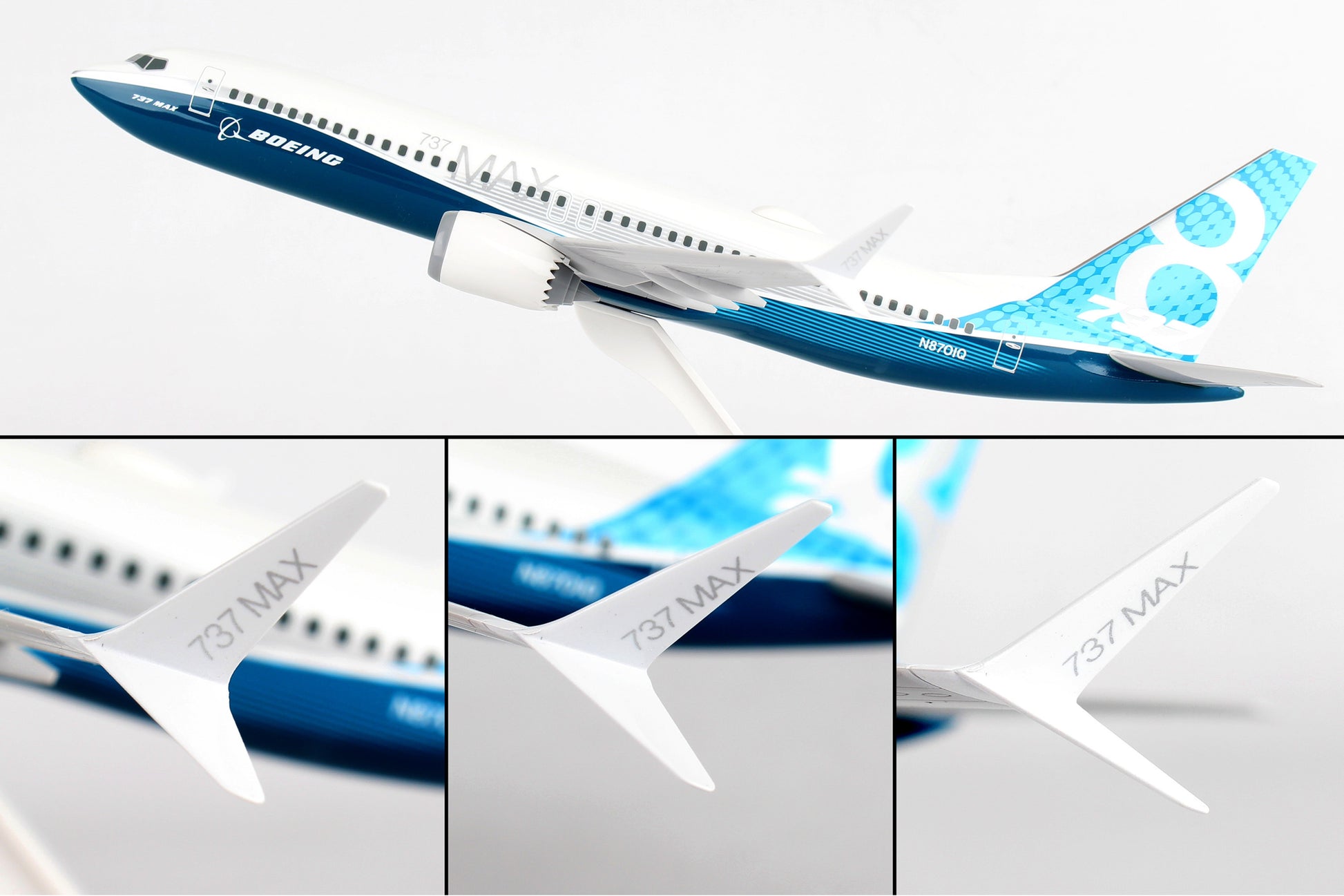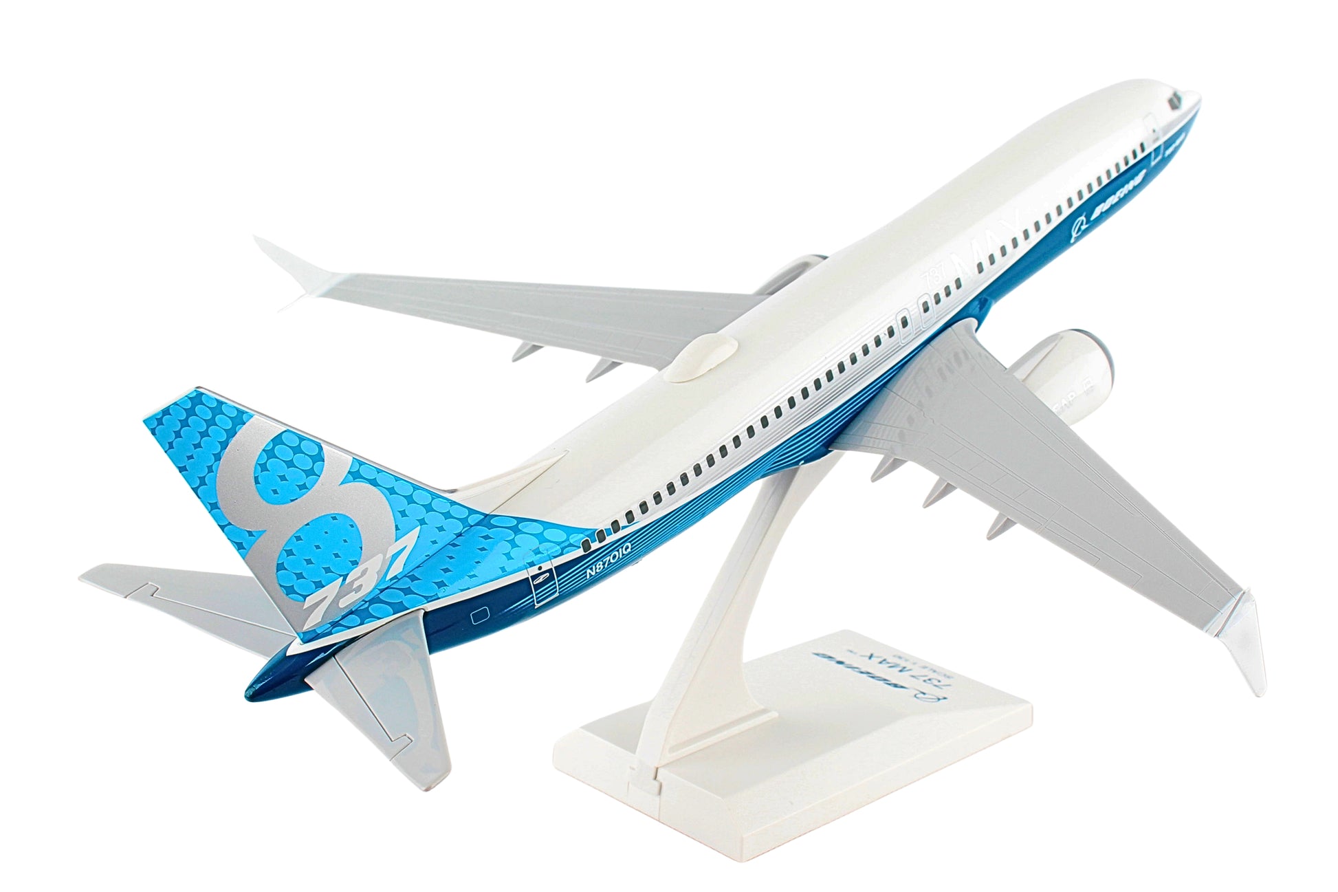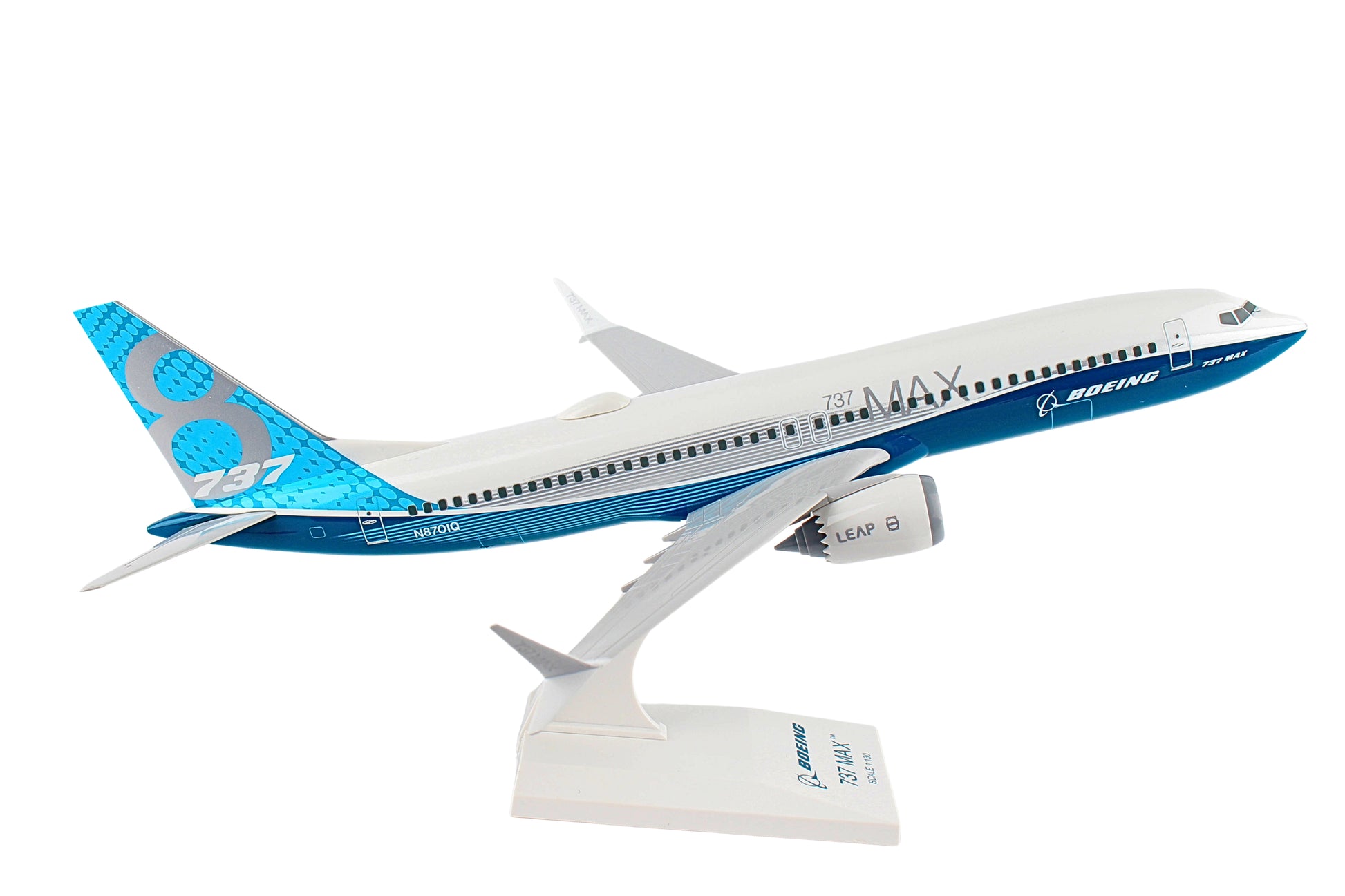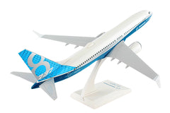 Comprising superior quality, solid, substantial injection molded plastic components with a simple snap-fit design that allows for easy assembly without the need for glue, this SkyMarks 1/130 Scale Boeing 737 MAX 8, featured in its "Boeing House Colors Roll Out Livery," measures approximately 12-inches long with an 11-3/16-inch wingspan and comes complete with a Display Stand. An accurate, true-to-scale reproduction of the actual aircraft, the model is great for collectors and features authentic, highly detailed graphics and markings. Having commenced service in 2017 as the fourth generation of the Boeing 737, the Boeing 737 MAX 8 is a twin-engine, narrow-body airliner that was designed to succeed the prior Boeing 737 Next Generation series and competes against the Airbus A320neo family. The Boeing 737 MAX line features several noteworthy advantages over earlier 737 variants and has been outfitted with more efficient engines, a fly-by wire system and includes beneficial cockpit enhancements along with improved aerodynamics and a greater flying range. The 737 MAX 8, which has a range of 3,550 nautical miles, can be configured to seat up to 210 passengers and directly replaces the third generation Boeing 737-800.